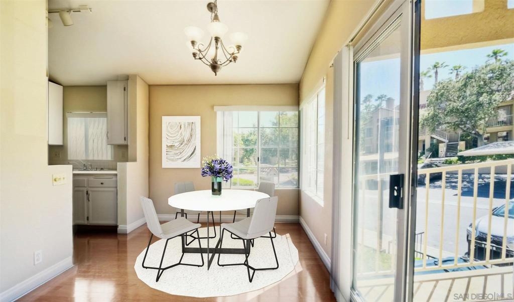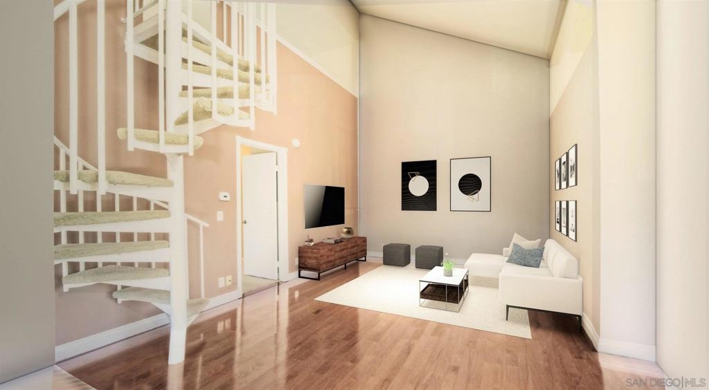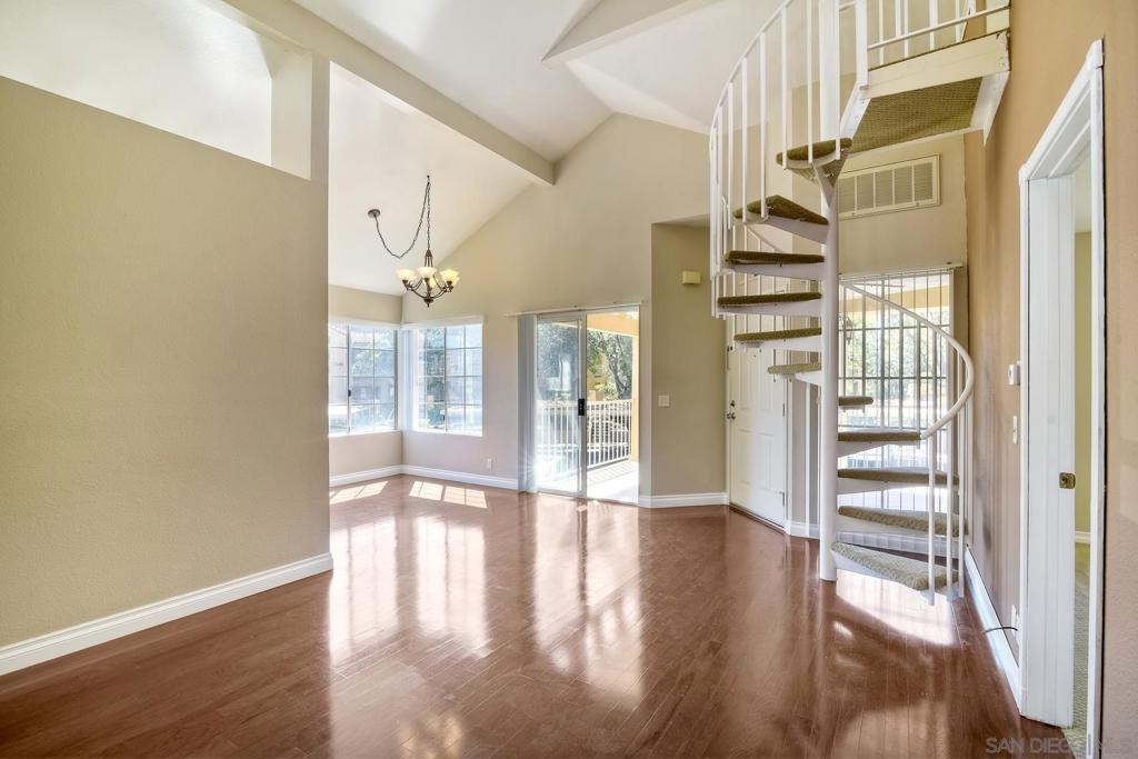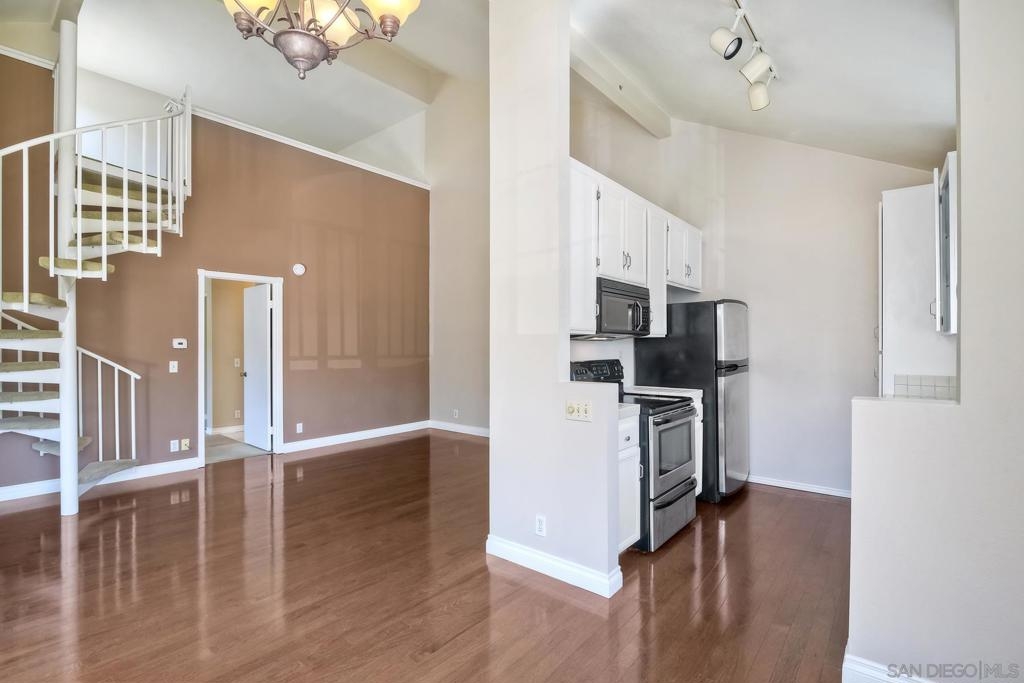 TOP FLOOR condo in ultra-convenient Mira Mesa just bordering Sorrento Valley is ready to call home! One main floor bedroom with en-suite bath. Charming spiral staircase leading up to your loft (opt. bedroom) creates sky high ceilings that make you go "WOW." Lots of light and beautiful hardwood flooring throughout living, kitchen, and dining areas. Central A/C and heating to keep you comfortable year-round. Patio off of dining big enough to relax and enjoy a partial view of one of two community pools. Full size laundry closet on patio. Two parking spaces (one covered) and ample visitor parking conveniently in front of building. Note: Some interior photos have been virtually staged. Complex Features: ,,, Equipment: Dryer, Washer Sewer: Sewer Connected Topography: ,LL