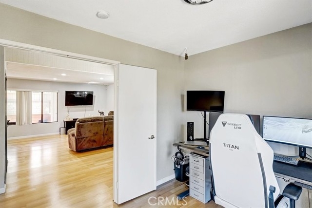 Charming, immaculate and move in ready! This beautiful single story end unit has 2 bedrooms, 1 ½ baths w/an open floor plan and cozy outdoor patio for entertaining family and friends. Custom gourmet kitchen has gorgeous glass subway backsplash, granite counters, abundance of white cabinetry (glass doors), recessed lighting w/dimmers, fresh paint, breakfast bar, décor pendulum lights, and attached separate laundry room w/ extra storage. All stainless steel appliances and washer/ dryer are included. This preferred unit has light wood laminate flooring, desired custom paint colors, lots of windows with plenty of light, upgraded guest bath and spacious primary suite w/ attached private newly remodeled bathroom w/ décor tile flooring, walk-in shower, custom glass enclosure and vanity. Located in Concord Square of Mira Mesa, this attractive area offers community in ground pool and heated spa, great walking trails, direct access to public parking, and assigned covered parking. This is a must see; close to schools, parks, shopping, restaurants, and so much more. Complex features: Sewer connected Topography: LL