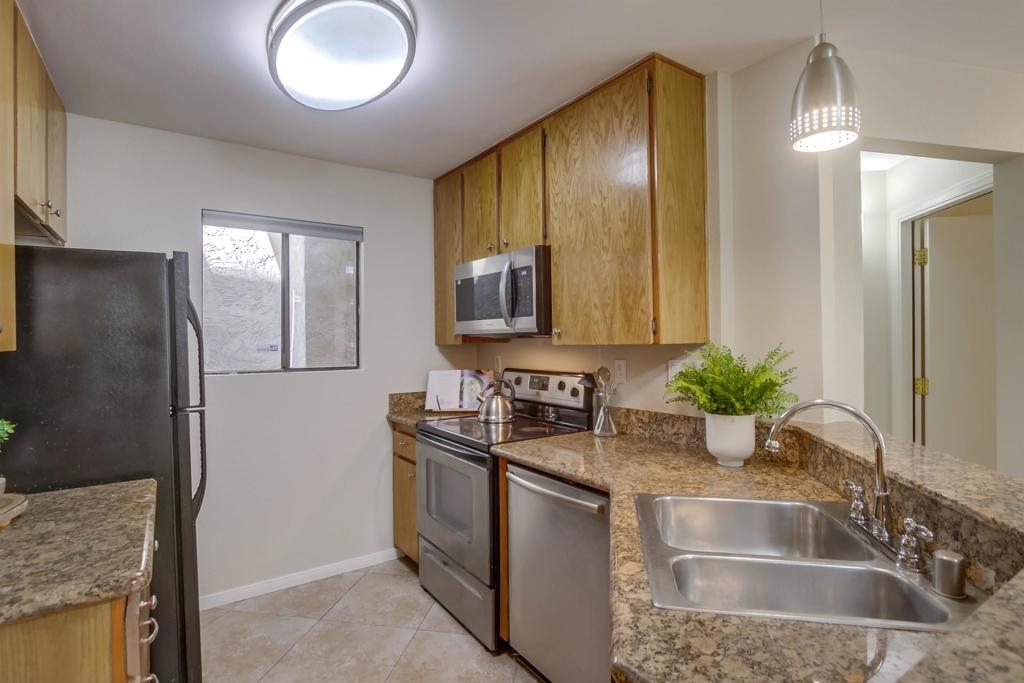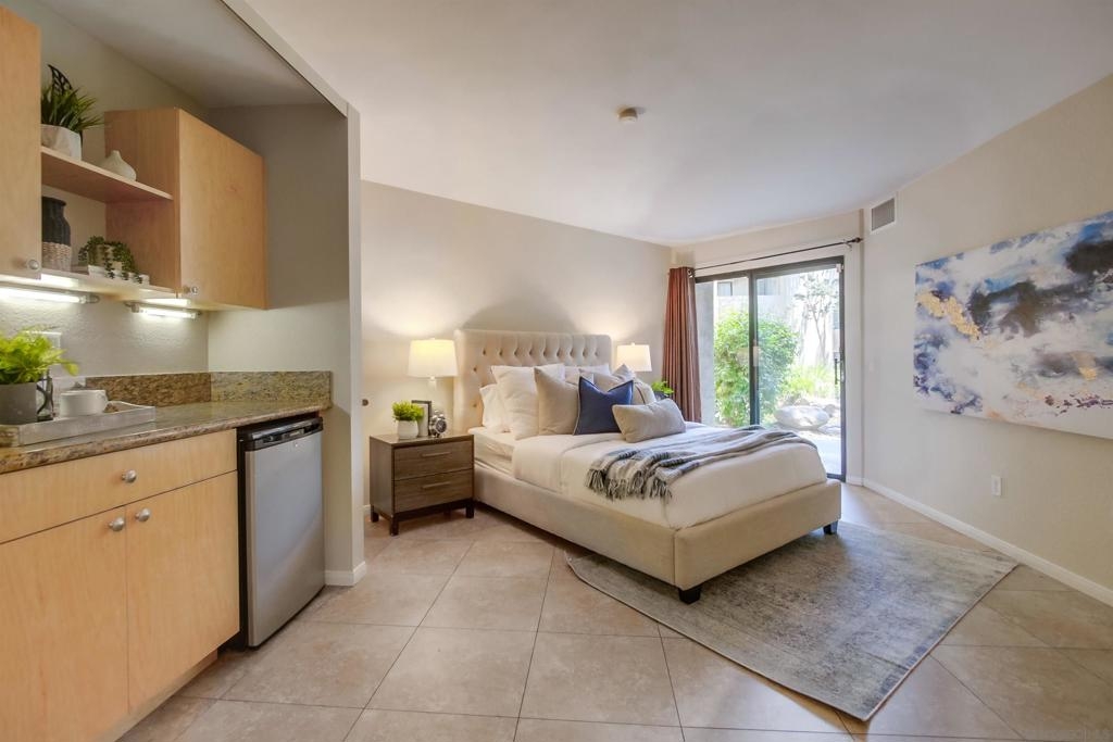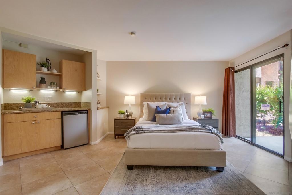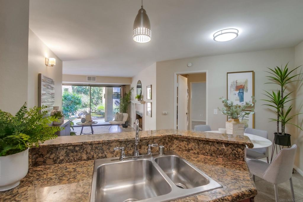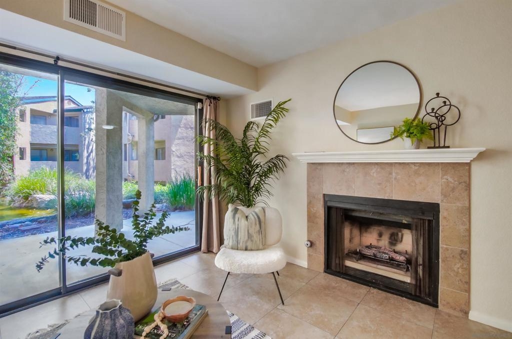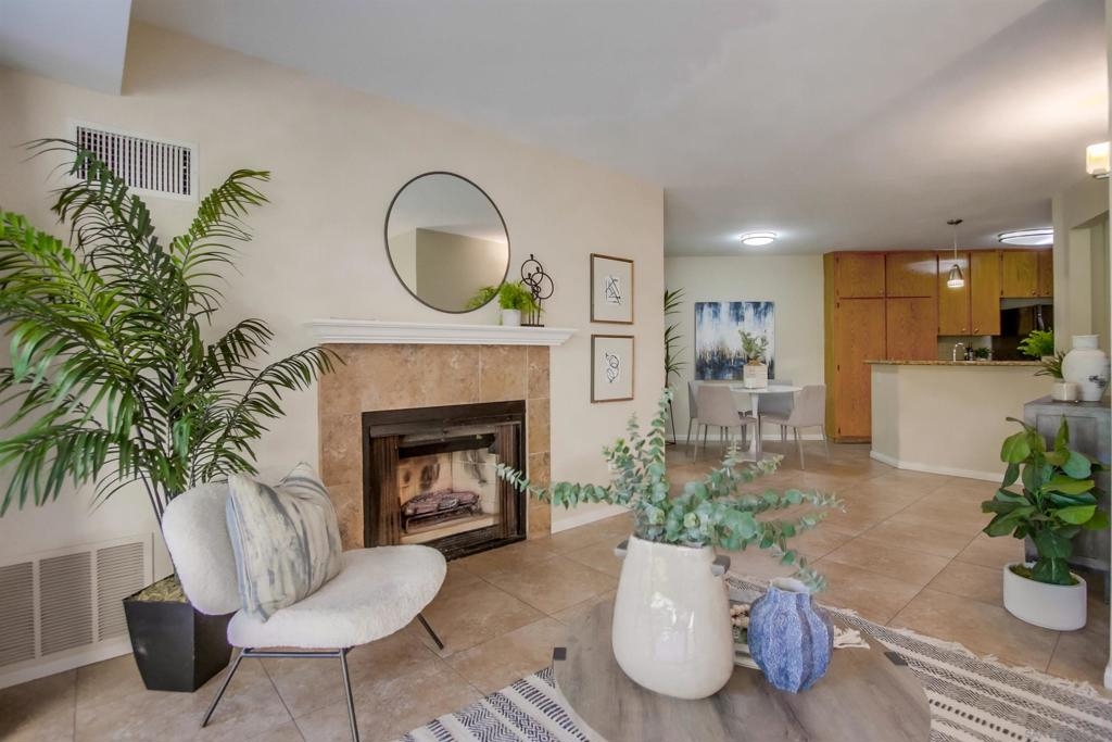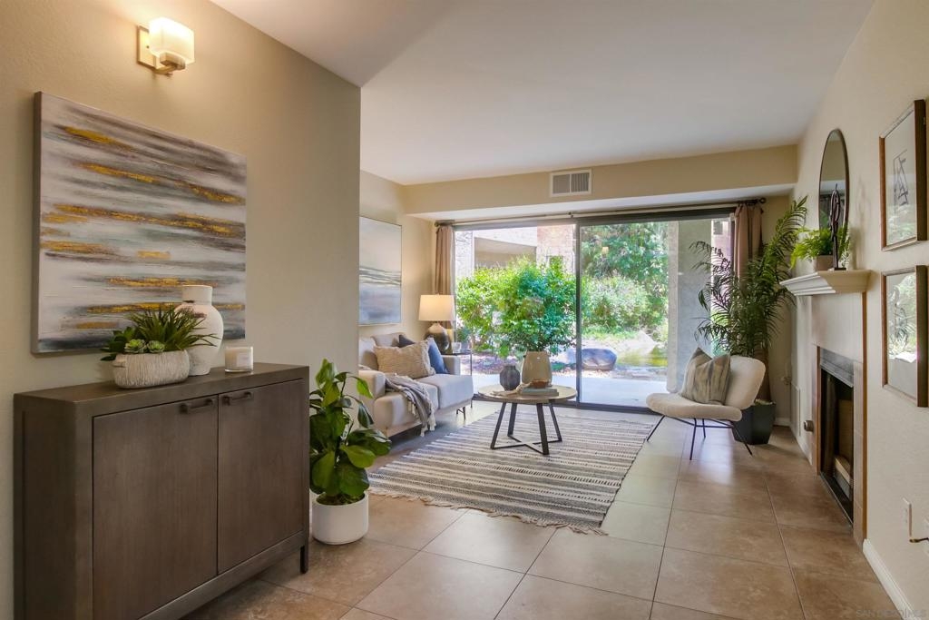 Investors and first time home buyers, check this one out! A true gem for live in or rental possibilities. This first floor corner end unit is private and easily accessed. Featuring an open concept living room & kitchen area with views of your patio and creek, a cozy fireplace, in unit laundry, and a 2 car tandem garage. The bedrooms are set up on opposite sides of the unit, each with private bathrooms, sliding doors to the patio and one has a kitchenette area. Additional upgrades include new paint throughout, durable large tile ceramic flooring, new lighting, stainless steel range and dishwasher, a storage closet, and AC unit. The first floor patio access is great for pets. Creekside is a lovely community, well maintained with a large pool and spa. All located in central San Diego. Walking distance to Miramar College, schools, parks, shops, and restaurants. Easy access to I-15 will get you all over the county, downtown, Miramar, and only 20 minutes to La Jolla beaches.