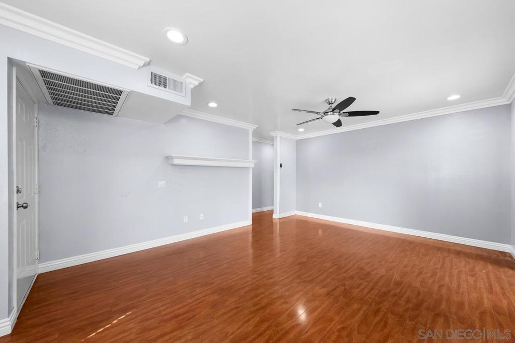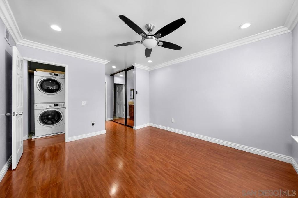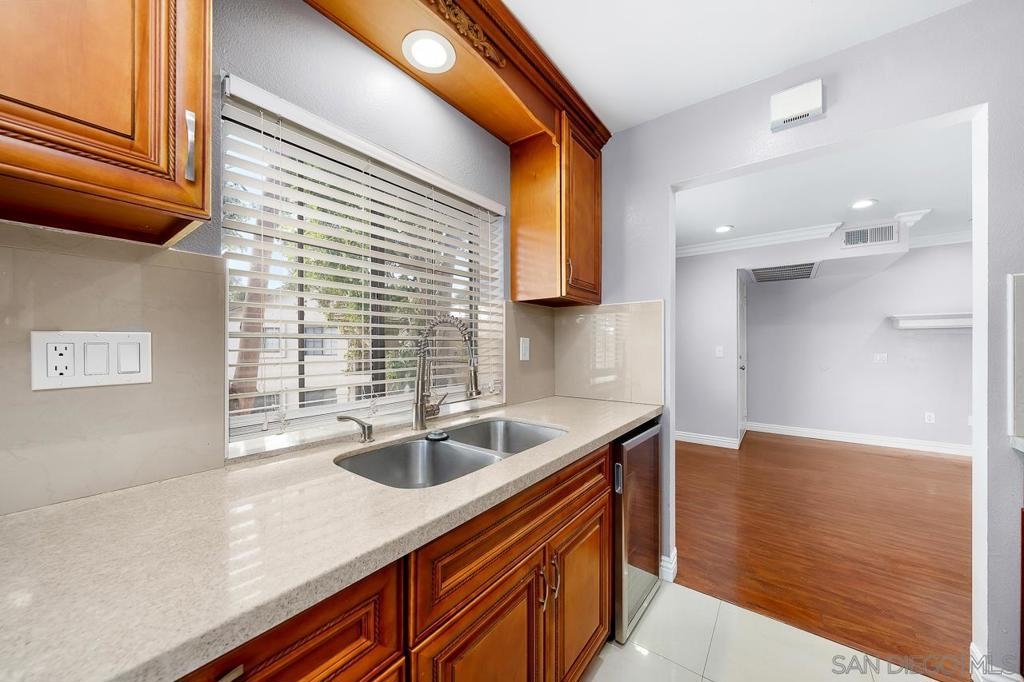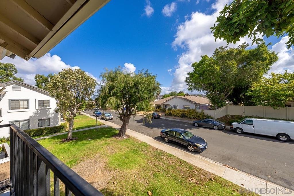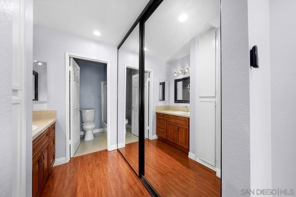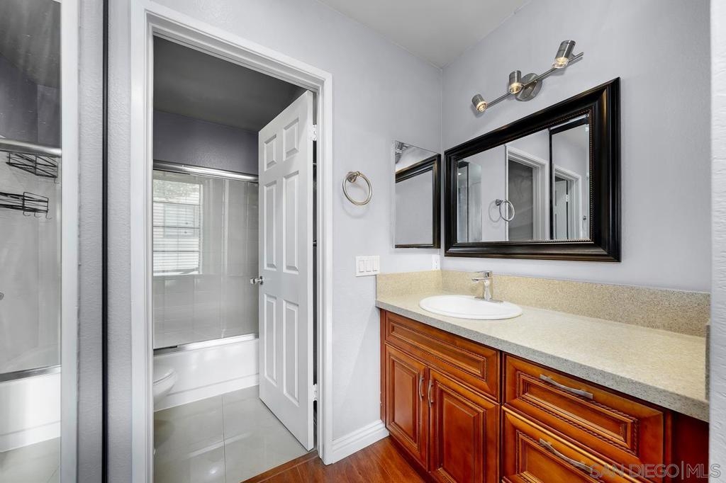 Welcome to this inviting 920 square feet 2 bedroom 2 bathroom condo in the heart of Mira Mesa. Rich vinyl flooring that flows throughout, leading you to a sleek galley kitchen with quartz countertops and tile flooring. Both ensuite bedrooms offer privacy and comfort, while the spacious, sunlit living room opens onto a serene balcony—perfect for unwinding. With a stackable washer and dryer for added convenience, this home combines functionality with style. The open condominium complex offers a pool and spa, and the location is unbeatable: just a short walk to Mira Mesa Park and minutes from shops, restaurants, and entertainment, including Trader Joe's, In-N-Out, and Regal Edwards Mira Mesa. Experience the best of Mira Mesa living in this beautifully designed home!