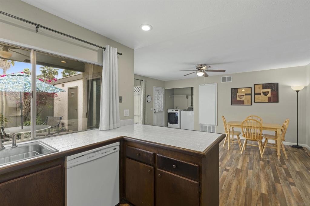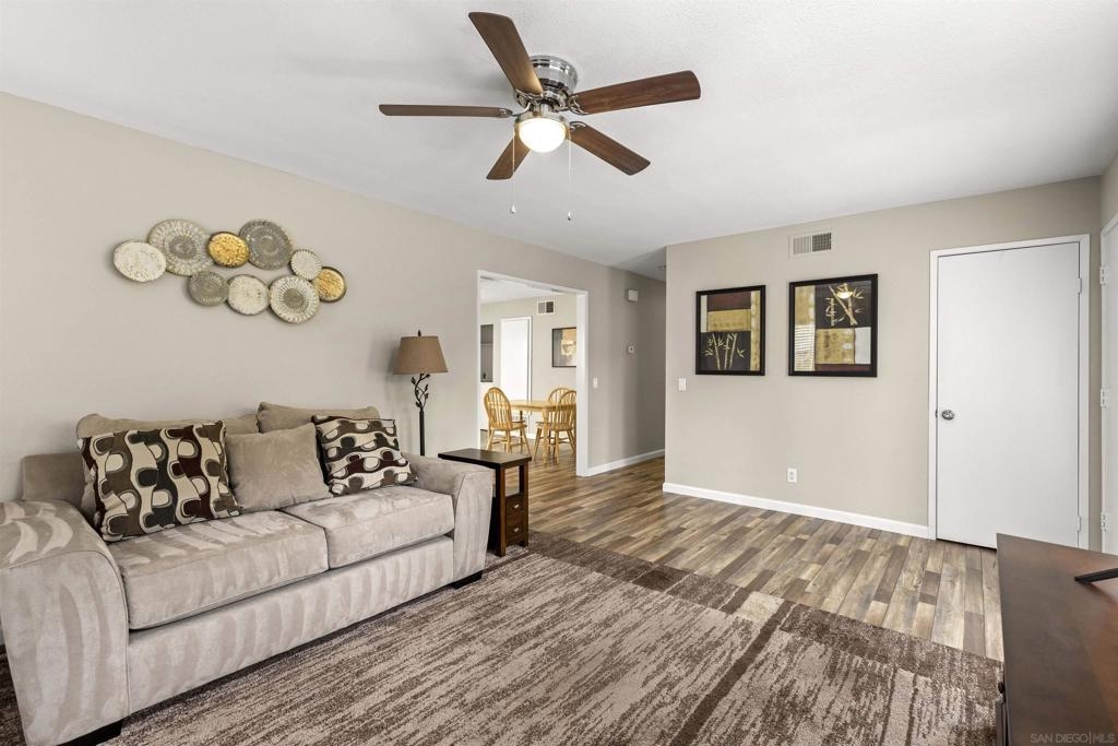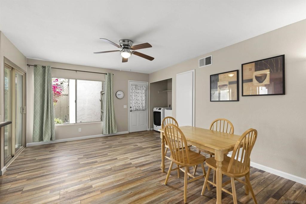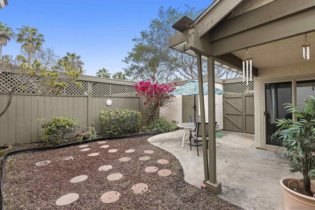 Charming Mesa Village property that lives like a home with no shared walls. 2 vehicle carport with direct access to unit and storage area. A private backyard and patio great for entertaining. Steps to large open green space with parking for guests. Excellent condition with vinyl flooring and designer paint. New full-size washer & dryer included. Large primary bedroom and bathroom suite. A well-maintained complex with two pools and lots of green space.