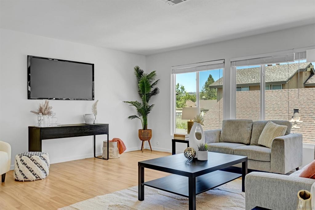 DETACHED 4 BEDROOM TOWNHOME in a quiet, well-maintained community with low HOA fees! This move-in ready home features fresh interior paint, dual-pane windows, central AC, and solar on a PPA for year-round energy savings. Enjoy a flexible layout with 2 bedrooms and a full bath on the main level, a spacious upstairs loft / additional living room, and a private patio for outdoor dining or relaxing. Community perks include pools, walking paths, and a clubhouse. Close to schools, parks, shopping, and major freeways!