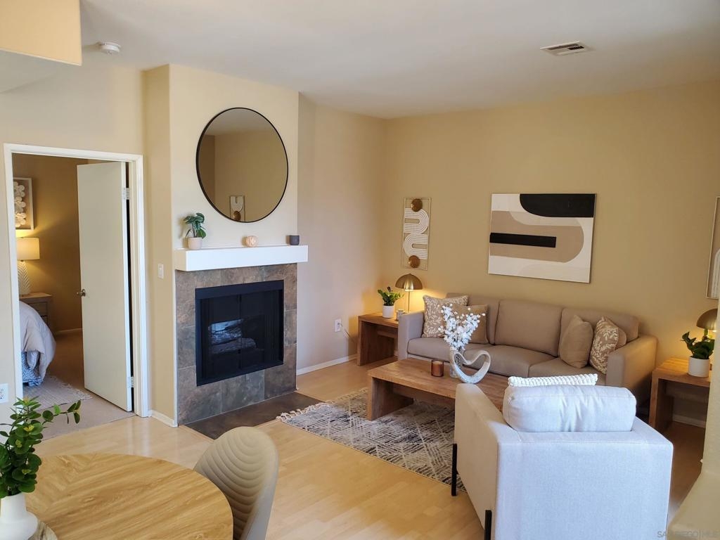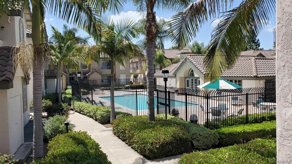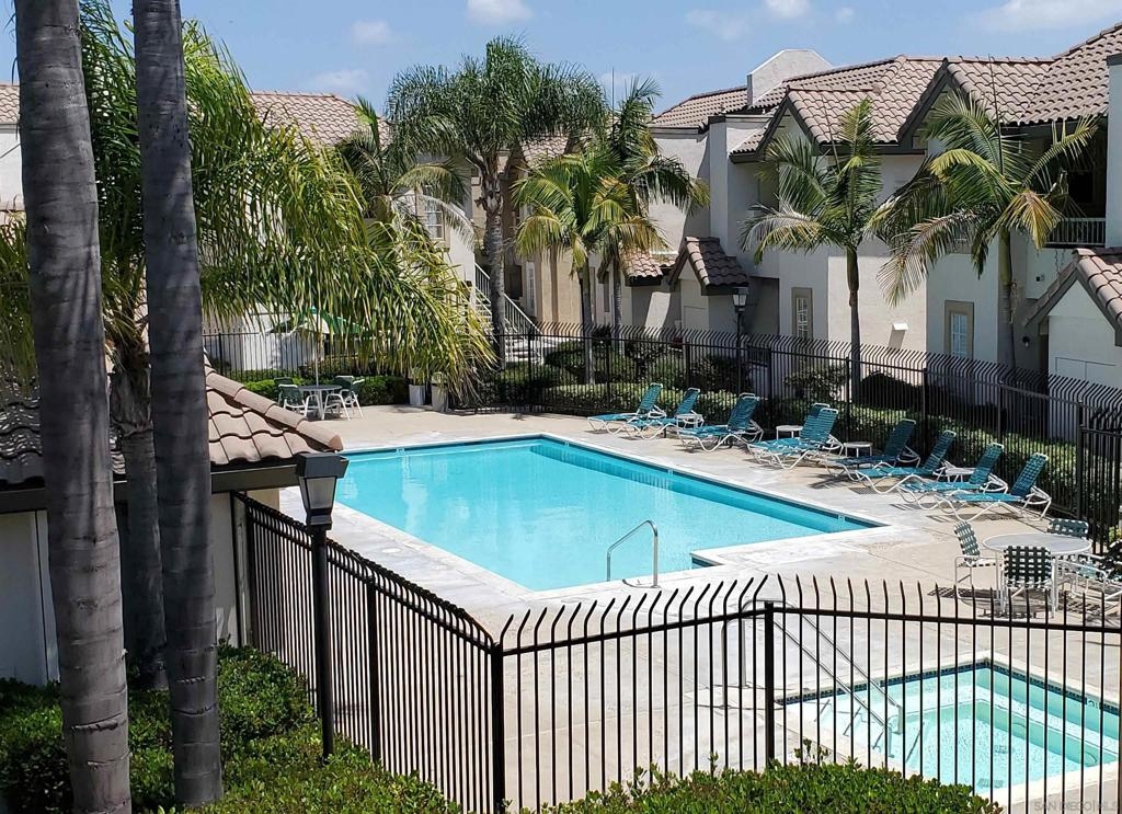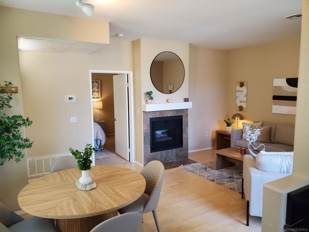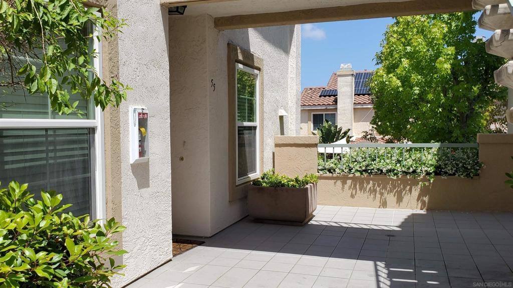 Move-in ready. Quiet peaceful location. 2 garage parking spaces. Technically a ground floor unit, but because it's located at the edge of the community, your balcony is private and secure like a 2nd floor balcony. Close to all the restaurants and shops that make Mira Mesa so vibrant, but without all the noise. Granite counters in the kitchen and bathroom. Laminate floor in the main living area, carpet in the bedroom, and travertine in the bathroom. This gated community has a pool, a weight room, and a sauna. Mirabella is a wonderful gated community with a pool, a weight room, and secure gated underground garage parking. Close to all the restaurants and shops that make Mira Mesa so vibrant, but super quiet and peaceful, this is the condo you've been looking for. This ground floor unit comes with two dedicated parking spaces in the garage below. Both spaces are very close to the unit. Because this is an end unit on the perimeter of the community, there's nobody walking past your unit, and when you stand at the railing of your private patio, you're basically on the second floor, not standing at the same level as the people walking past. In fact there is nobody walking past. Your view looks out beyond the complex so you get lots of fresh air and natural light. And because of the prime location, there is no noise from Mira Mesa Blvd. In addition to all the kitchen appliances, the unit also comes with a full size side-by-side washer and dryer located in a large storage /laundry closet on your private covered patio. Both the kitchen and bathroom counters are made of granite. There is Laminate floor in the large open main living area, carpet in the large bedroom, and beautiful travertine tile in the bathroom. There's also a gas fireplace in the living room.