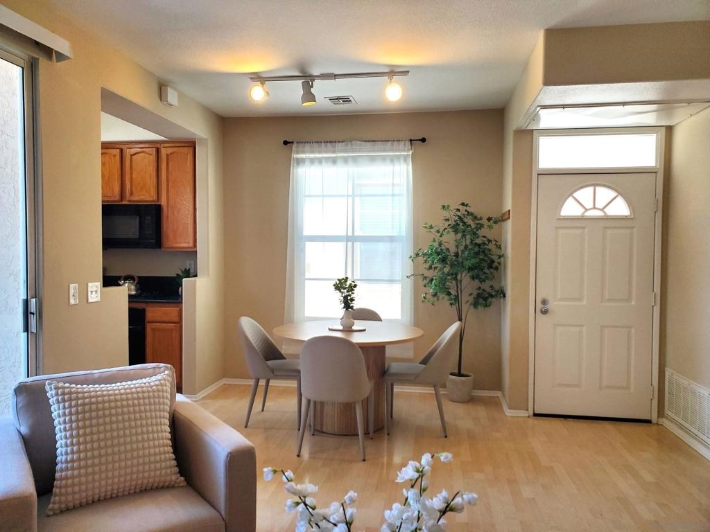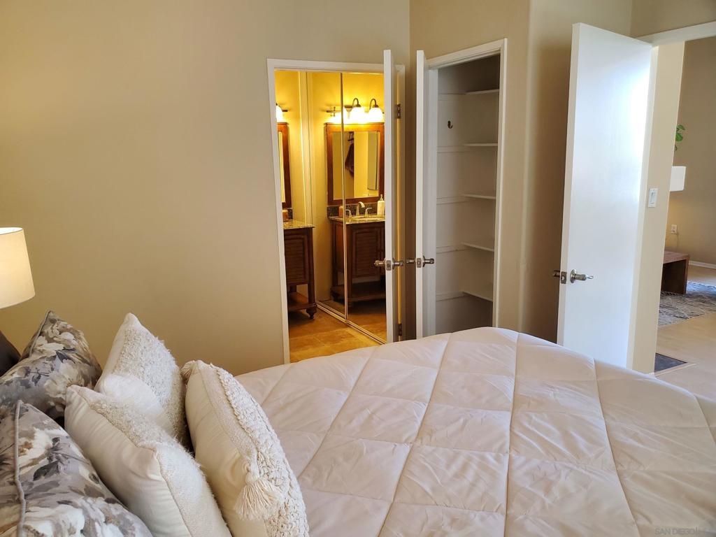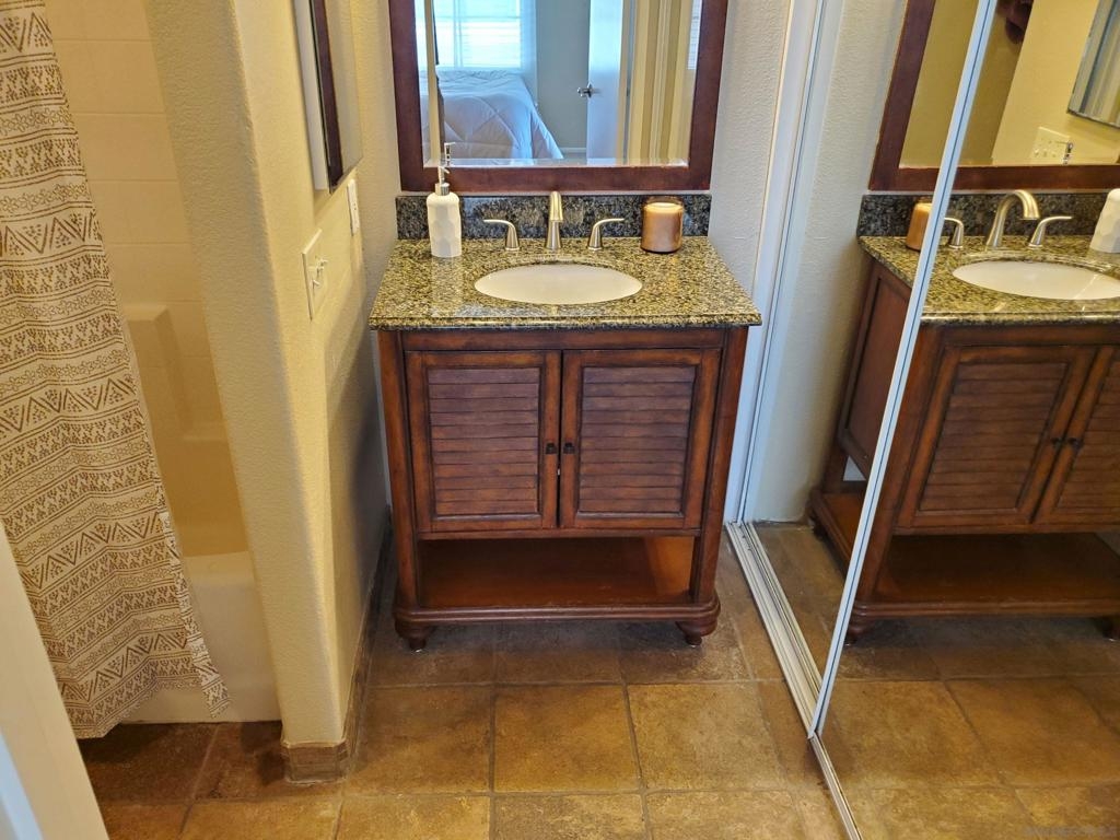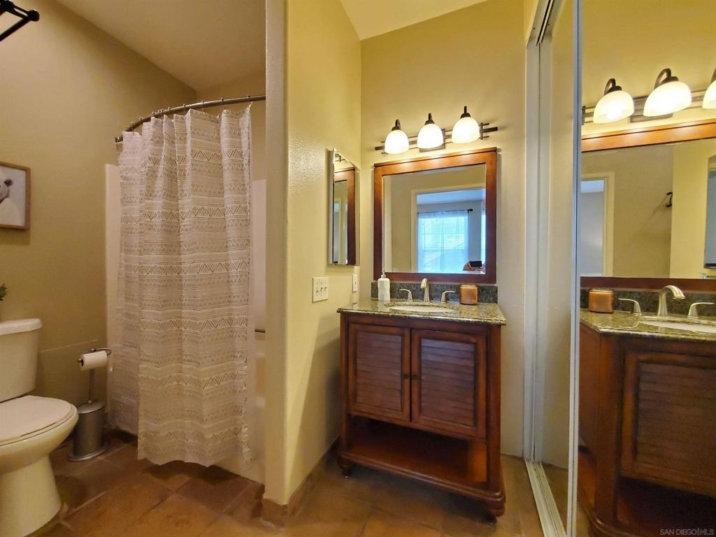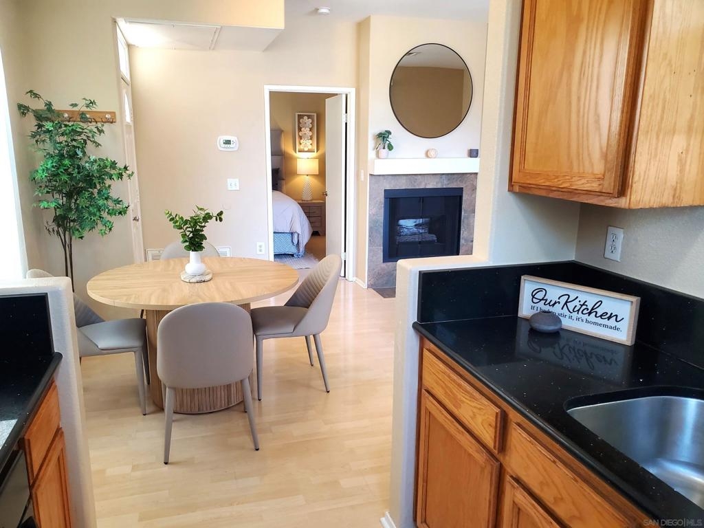 Move-in ready. Quiet peaceful location. 2 garage parking spaces. Technically a ground floor unit, but because it's located at the edge of the community, your balcony is private and secure like a 2nd floor balcony. Close to all the restaurants and shops that make Mira Mesa so vibrant, but without all the noise. Granite counters in the kitchen and bathroom. Laminate floor in the main living area, carpet in the bedroom, and travertine in the bathroom. This gated community has a pool, a weight room, and a sauna. Mirabella is a wonderful gated community with a pool, a weight room, and secure gated underground garage parking. Close to all the restaurants and shops that make Mira Mesa so vibrant, but super quiet and peaceful, this is the condo you've been looking for. This ground floor unit comes with two dedicated parking spaces in the garage below. Both spaces are very close to the unit. Because this is an end unit on the perimeter of the community, there's nobody walking past your unit, and when you stand at the railing of your private patio, you're basically on the second floor, not standing at the same level as the people walking past. In fact there is nobody walking past. Your view looks out beyond the complex so you get lots of fresh air and natural light. And because of the prime location, there is no noise from Mira Mesa Blvd. In addition to all the kitchen appliances, the unit also comes with a full size side-by-side washer and dryer located in a large storage /laundry closet on your private covered patio. Both the kitchen and bathroom counters are made of granite. There is Laminate floor in the large open main living area, carpet in the large bedroom, and beautiful travertine tile in the bathroom. There's also a gas fireplace in the living room.