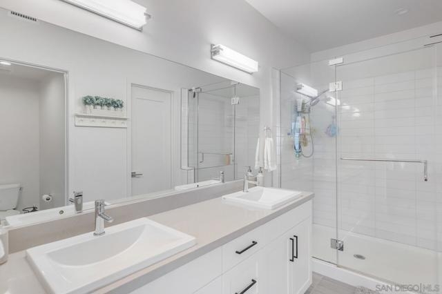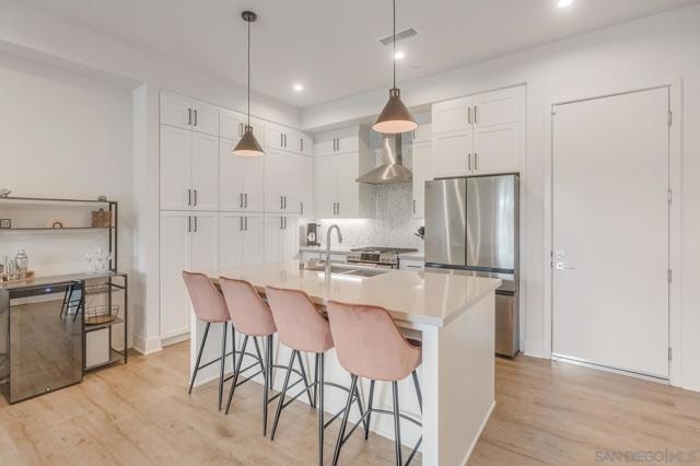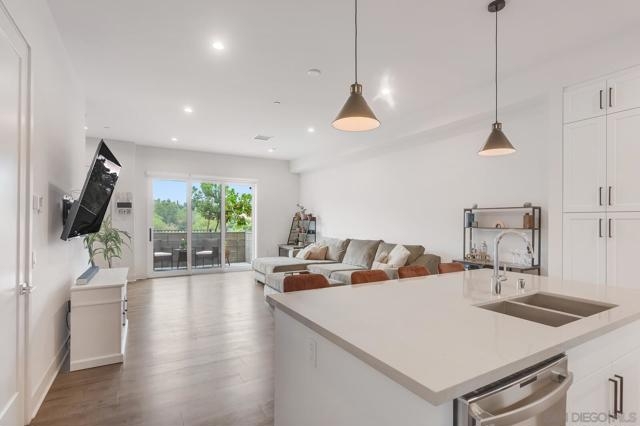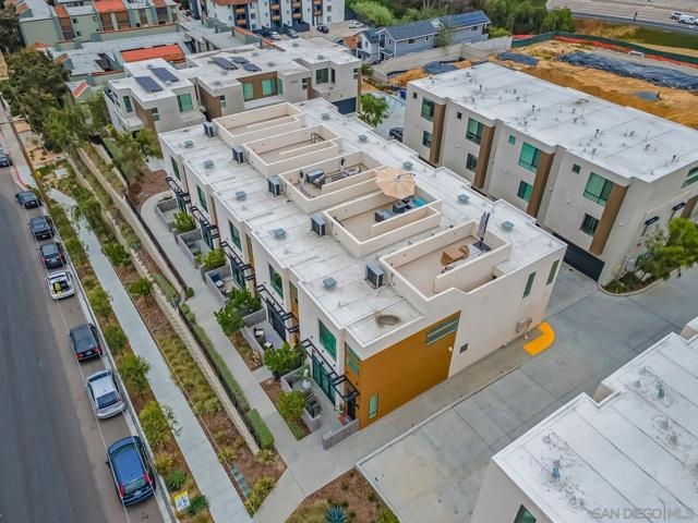 Modern 3-Bedroom Townhome with Rooftop Deck & Prime Location. Built in 2022, this light-filled and stylish 3-bedroom, 2.5-bath townhome combines modern convenience with thoughtful design. Featuring an open floor plan with soaring 12’ ceilings, wood-engineered laminate floors, and recessed lighting throughout, this home offers a bright and airy living space perfect for both relaxing and entertaining. The gourmet kitchen boasts shaker-style cabinetry, quartz countertops, and stainless steel appliances—ideal for home chefs. A spacious private front patio provides a welcoming entry, while the spectacular rooftop deck is the crown jewel—plumbed for gas and power, ready for BBQs, entertaining, or simply taking in stunning panoramic views. Additional highlights include: central A/C and ceiling fan for year-round comfort, primary custom closet and raised panel doors, convenient side-by-side laundry, direct-access 2-car garage with built-in storage, powder room for guests, low HOA dues. Perfectly situated near major freeways, top-rated schools, downtown, restaurants, parks, the waterfront, and the world-famous San Diego Zoo, this home offers unbeatable access to everything San Diego has to offer. Don’t miss this rare opportunity to own a newer-build, move-in ready townhome in the heart of the city. VA Assumable.