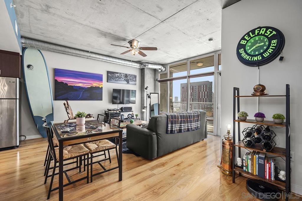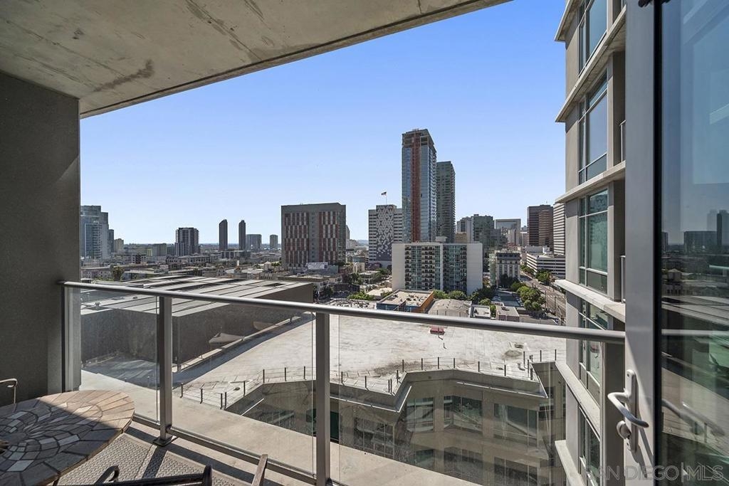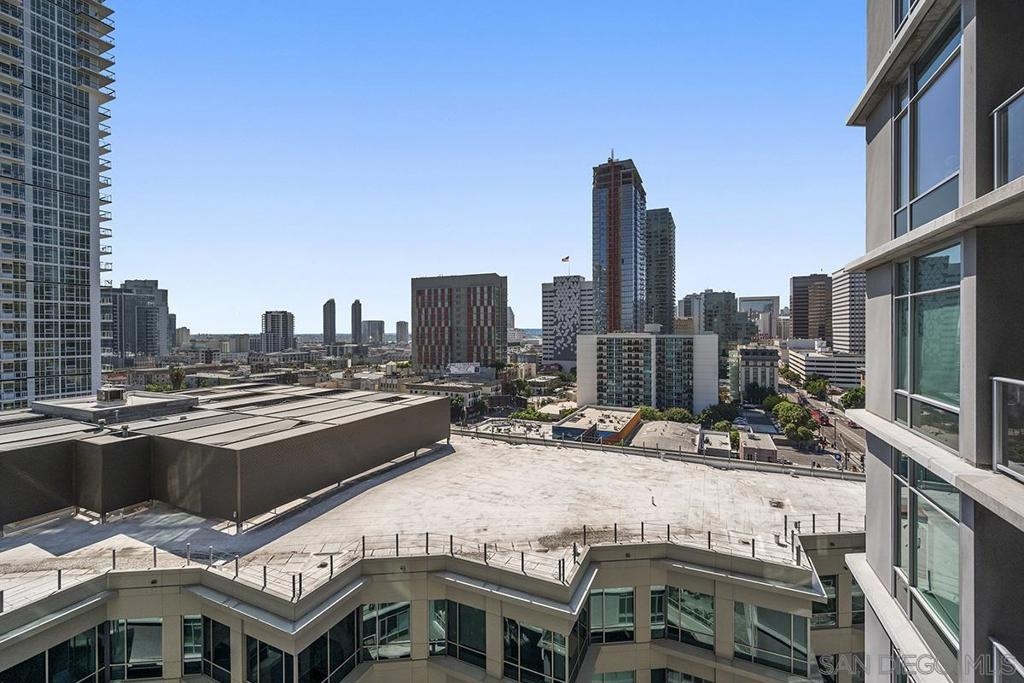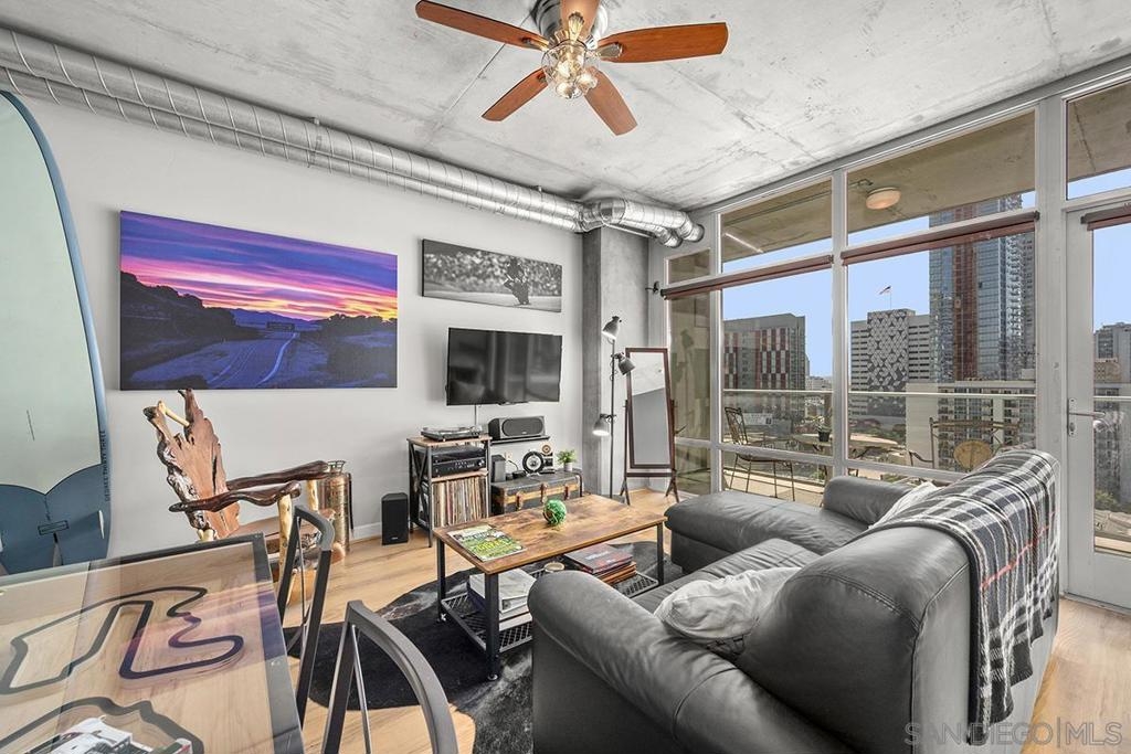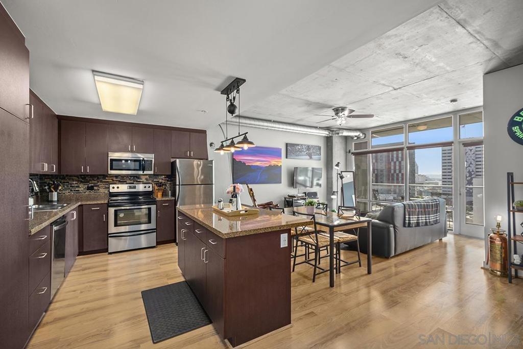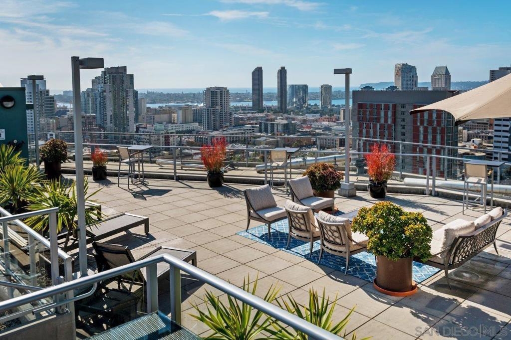 Experience San Diego’s trademark sunset skies from the comfort of your own southwest-facing Smart Corner residence! Situated on the 10th floor, peek bay glimpses and downtown city vistas are on display from both the floor-to-ceiling windows and a private balcony: al fresco evenings, anyone? This condo strikes an urban balance with industrial chic accents and visible ductwork, evoking an authentic loft ambiance. Featuring a sleek remodeled bathroom with custom vanity and an open-concept kitchen with stainless appliances, granite countertops, tile backsplash, and center island. Maximize versatility with a bonus room presently used as a second bedroom; or perfect for a cozy den or a much-desired home office. Details like the laminate wood flooring, sleek ceiling fans, Nest thermostat and top-of-the-line stackable washer & dryer further elevate this abode's appeal. Don't let this opportunity to own a piece of the city's skyline slip away! Smart Corner is an all-encompassing hub of work, play, shop, and live! It is conveniently located near the 163 freeway, I-5, Highway 94, Petco Park, the Gaslamp Quarter, San Diego City College and Balboa Park. A trolley station located below the development ensures Smart Corner has all an urban dweller could want. Amenities include 20th floor roof-top sun deck with forever views, spa, barbecue area, wet bar, and 2nd floor Fitness Center.