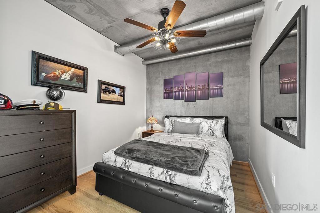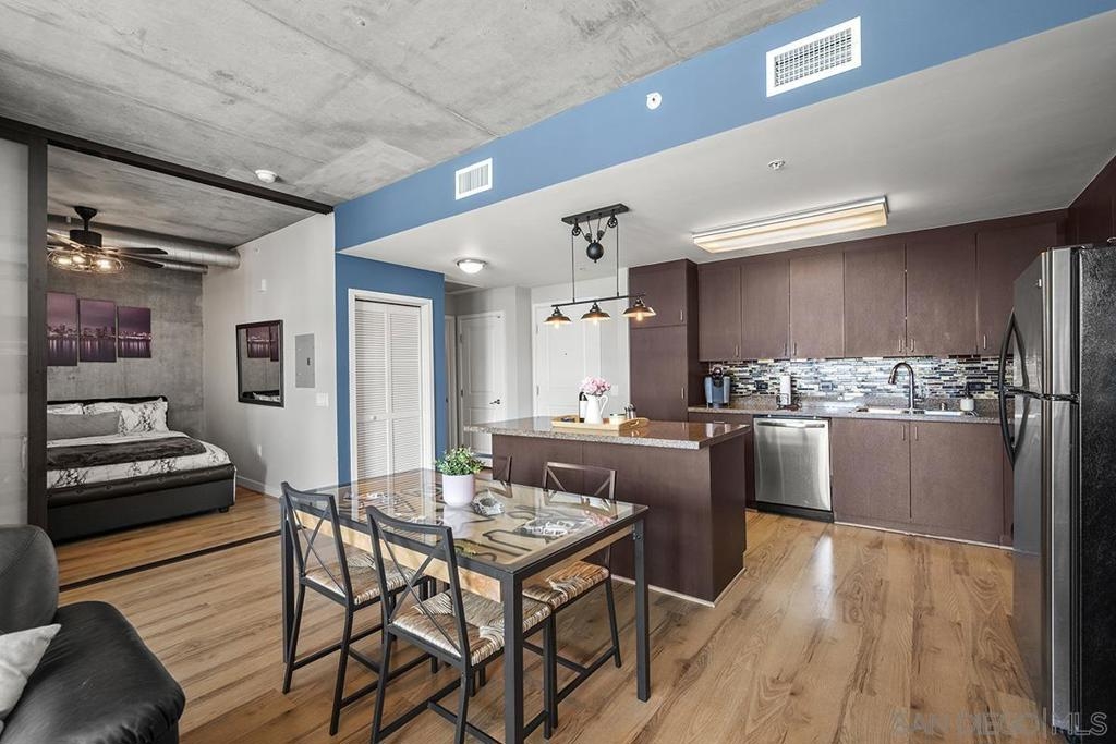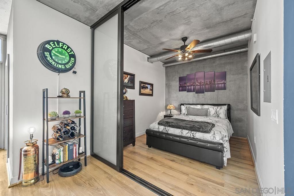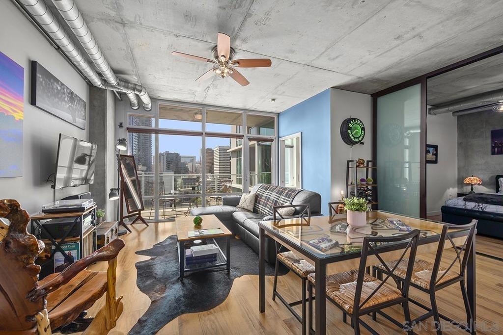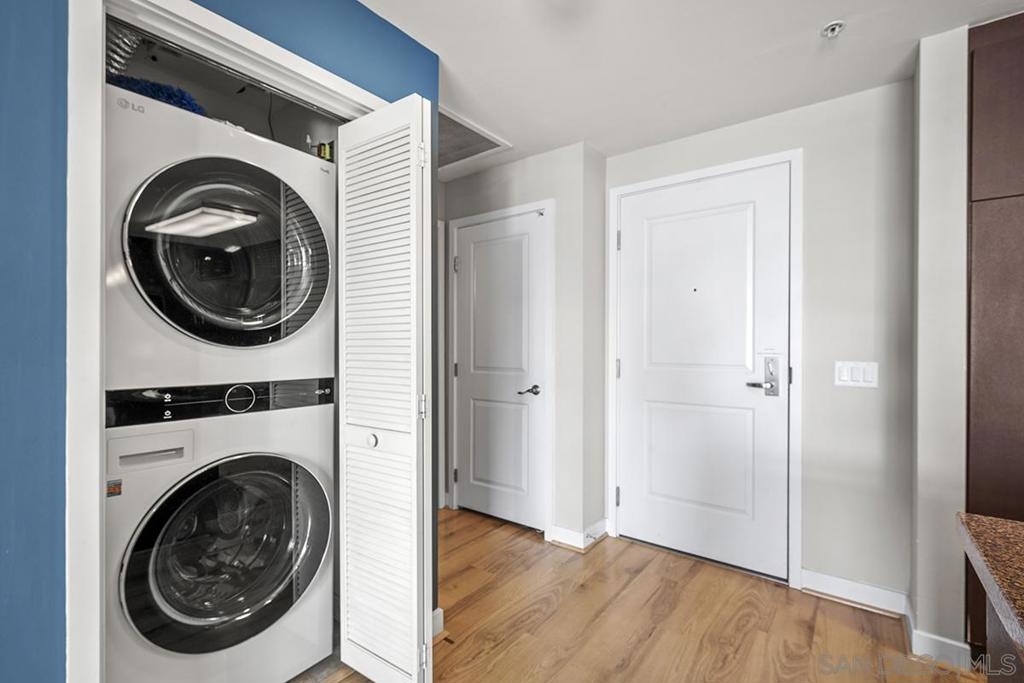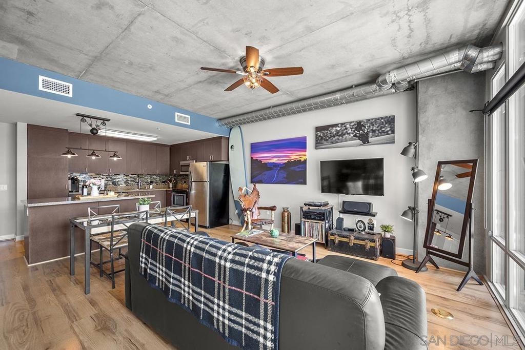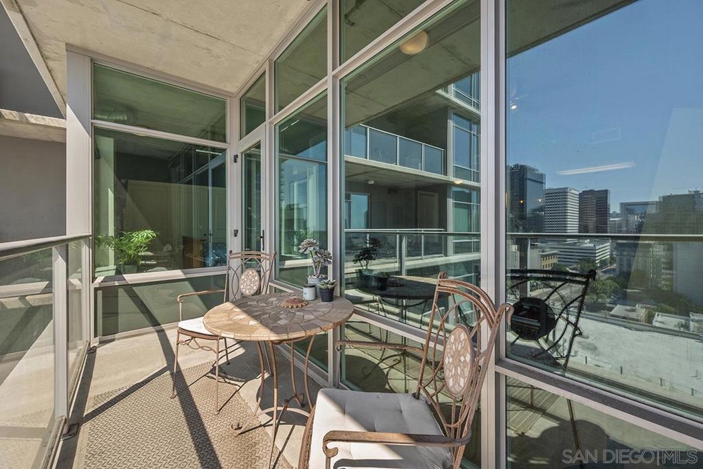 Experience San Diego’s trademark sunset skies from the comfort of your own southwest-facing Smart Corner residence! Situated on the 10th floor, peek bay glimpses and downtown city vistas are on display from both the floor-to-ceiling windows and a private balcony: al fresco evenings, anyone? This condo strikes an urban balance with industrial chic accents and visible ductwork, evoking an authentic loft ambiance. Featuring a sleek remodeled bathroom with custom vanity and an open-concept kitchen with stainless appliances, granite countertops, tile backsplash, and center island. Maximize versatility with a bonus room presently used as a second bedroom; or perfect for a cozy den or a much-desired home office. Details like the laminate wood flooring, sleek ceiling fans, Nest thermostat and top-of-the-line stackable washer & dryer further elevate this abode's appeal. Don't let this opportunity to own a piece of the city's skyline slip away! Smart Corner is an all-encompassing hub of work, play, shop, and live! It is conveniently located near the 163 freeway, I-5, Highway 94, Petco Park, the Gaslamp Quarter, San Diego City College and Balboa Park. A trolley station located below the development ensures Smart Corner has all an urban dweller could want. Amenities include 20th floor roof-top sun deck with forever views, spa, barbecue area, wet bar, and 2nd floor Fitness Center.