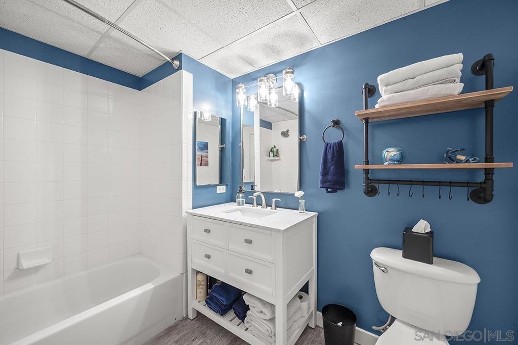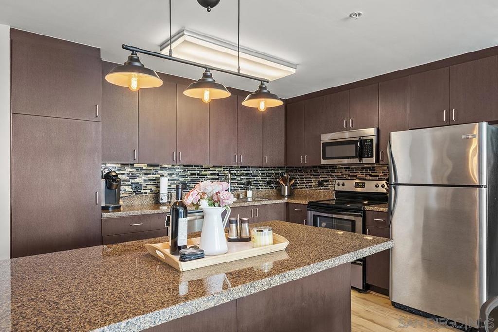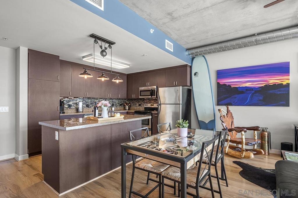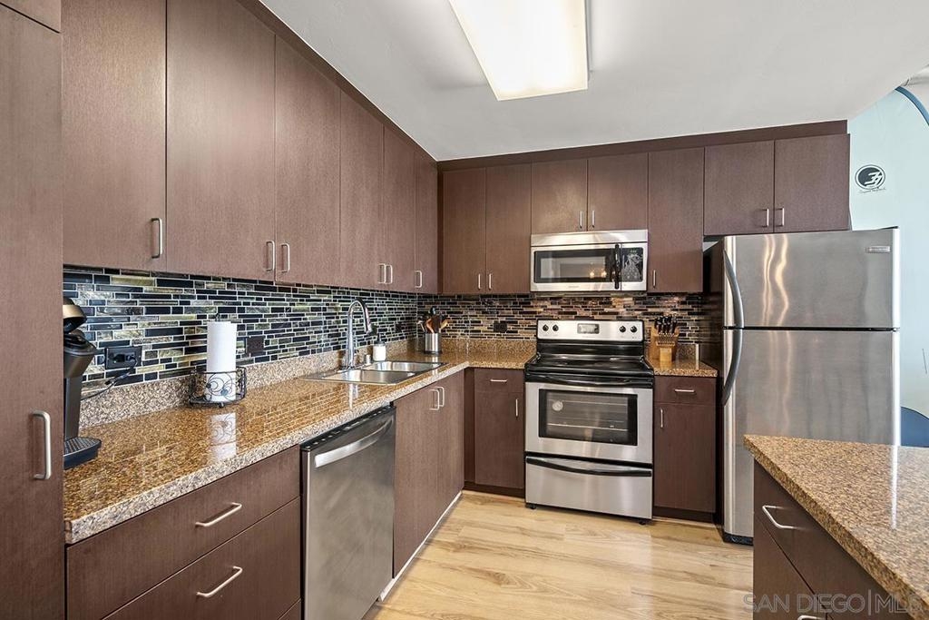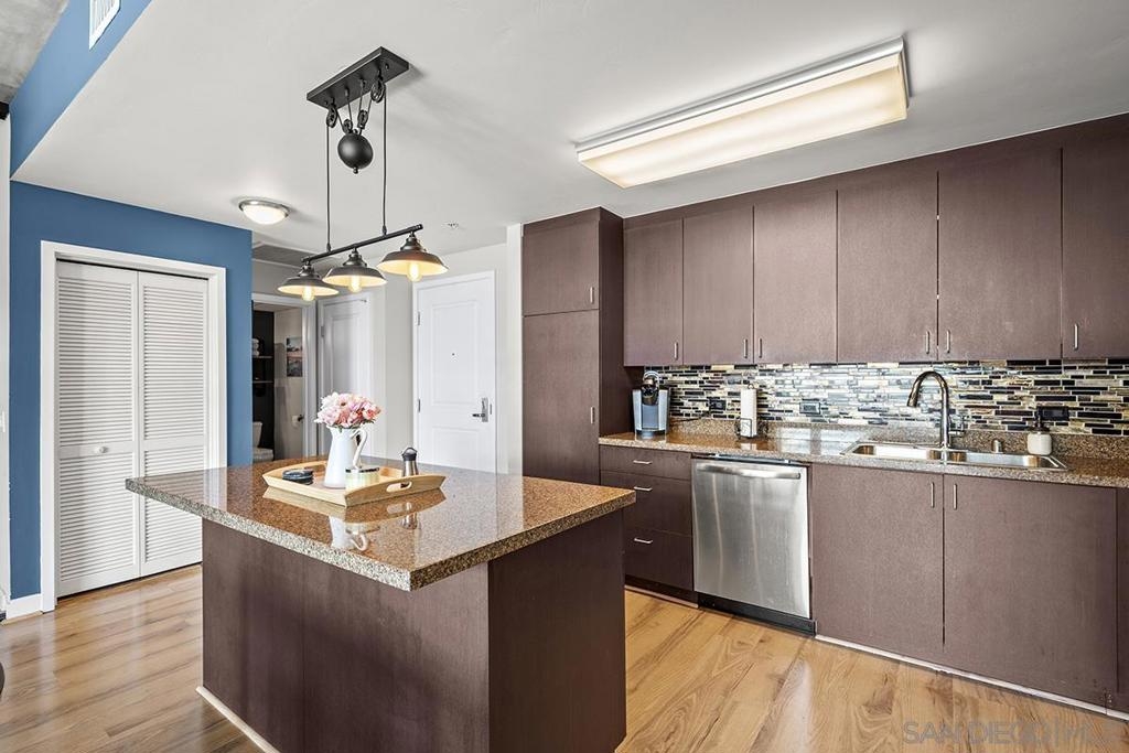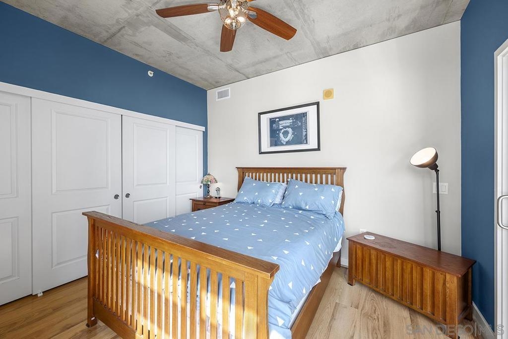 Experience San Diego’s trademark sunset skies from the comfort of your own southwest-facing Smart Corner residence! Situated on the 10th floor, peek bay glimpses and downtown city vistas are on display from both the floor-to-ceiling windows and a private balcony: al fresco evenings, anyone? This condo strikes an urban balance with industrial chic accents and visible ductwork, evoking an authentic loft ambiance. Featuring a sleek remodeled bathroom with custom vanity and an open-concept kitchen with stainless appliances, granite countertops, tile backsplash, and center island. Maximize versatility with a bonus room presently used as a second bedroom; or perfect for a cozy den or a much-desired home office. Details like the laminate wood flooring, sleek ceiling fans, Nest thermostat and top-of-the-line stackable washer & dryer further elevate this abode's appeal. Don't let this opportunity to own a piece of the city's skyline slip away! Smart Corner is an all-encompassing hub of work, play, shop, and live! It is conveniently located near the 163 freeway, I-5, Highway 94, Petco Park, the Gaslamp Quarter, San Diego City College and Balboa Park. A trolley station located below the development ensures Smart Corner has all an urban dweller could want. Amenities include 20th floor roof-top sun deck with forever views, spa, barbecue area, wet bar, and 2nd floor Fitness Center.
