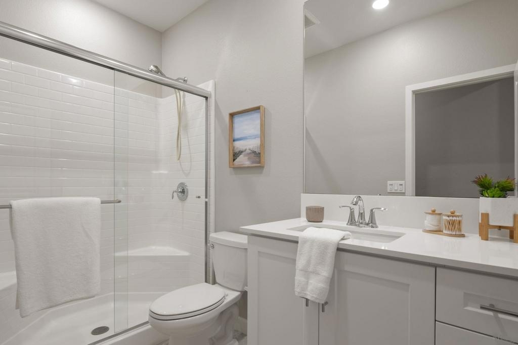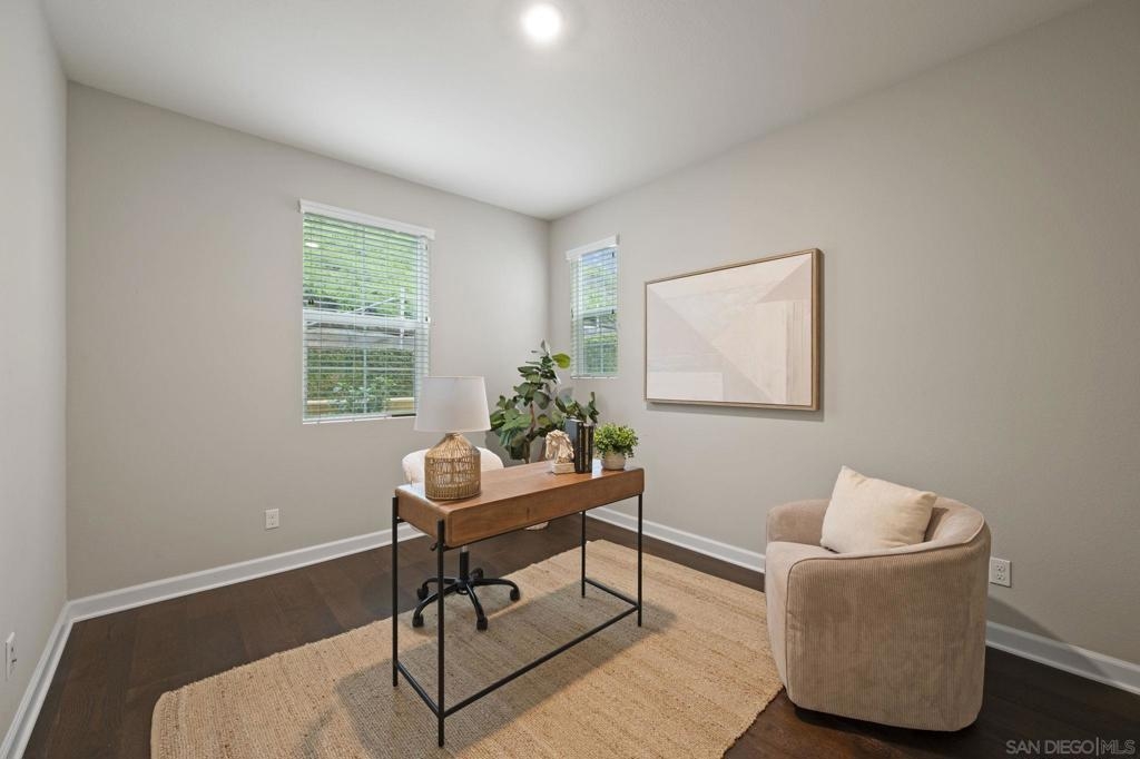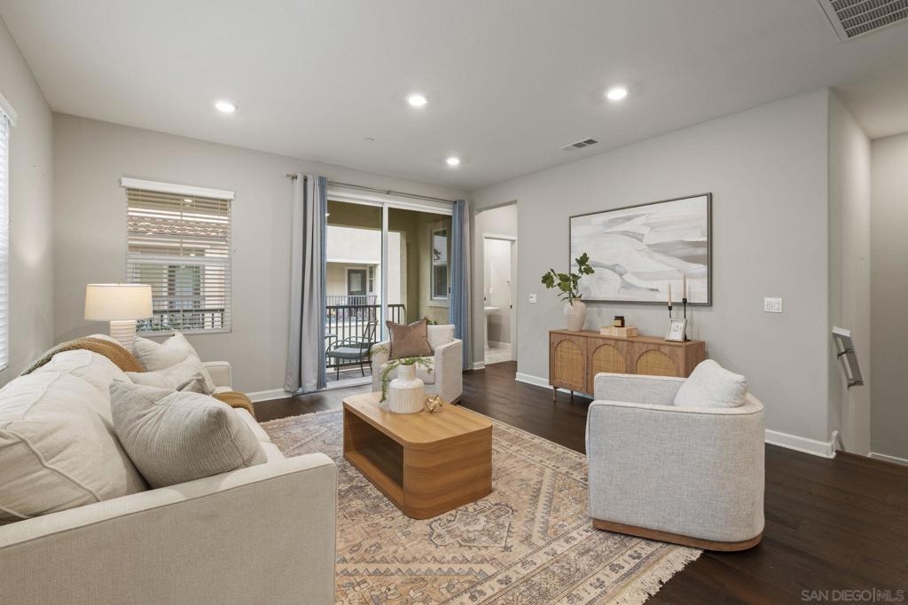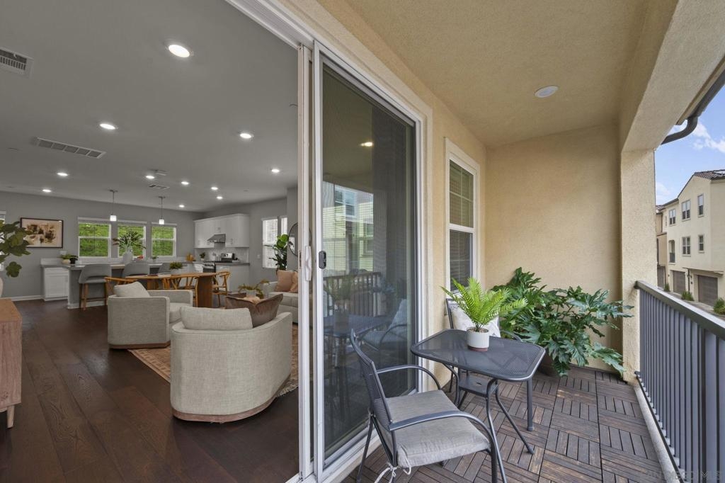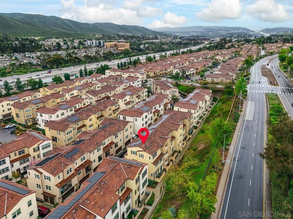 Beautiful 2021-Built End Unit Townhome in the Sought-After Promenade at Pacific Village – No Mello Roos! Welcome to this stunning three-level corner home where modern design meets effortless everyday living. Bathed in natural light from extra windows, this end unit townhome has 200 sq ft more living space than interior units. Featuring 9-foot ceilings and an open-concept living space, the heart of the home is perfect for gathering, relaxing, and entertaining. The modern kitchen boasts quartz countertops, a large island, pantry closet, and generous counter space — blending functionality with style. Step outside to enjoy your morning coffee on the charming front patio or unwind on your balcony on the second level, both ideal for fresh air and our Southern California sunshine. Smart and sustainable living are built right in, with a Solar Power Purchase Agreement (PPA) to help keep energy costs low and a whole-home water softener system for enhanced comfort and efficiency. Thoughtful details include a bedroom and full bathroom on the entry level, ideal for guests or a home office, and a dedicated laundry room for added convenience. Upstairs on the third level, the primary suite offers a peaceful retreat with a walk-in closet and a beautifully finished bathroom. The Promenade at Pacific Village offers resort-style amenities — a sparkling pool, playground, BBQ and picnic areas, and several dog parks. With no Mello Roos, easy access to fwys, shopping, dining, and top-rated Poway Unified schools, this home delivers! Come and see for yourself!