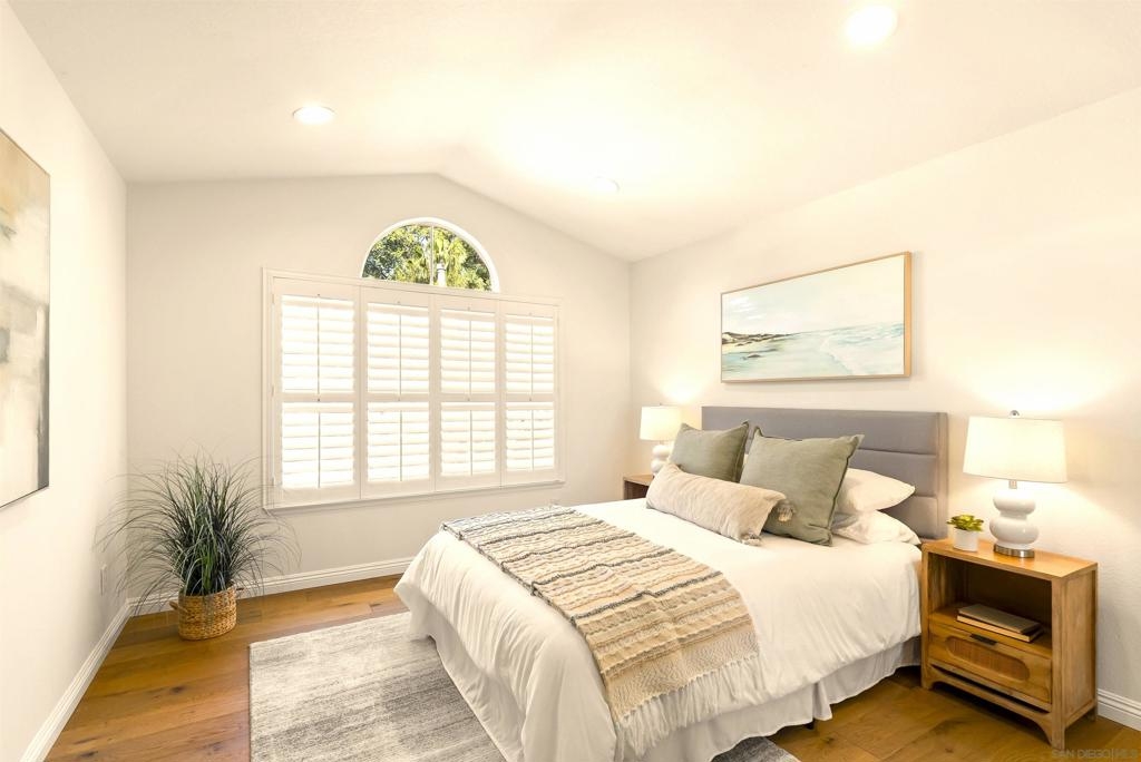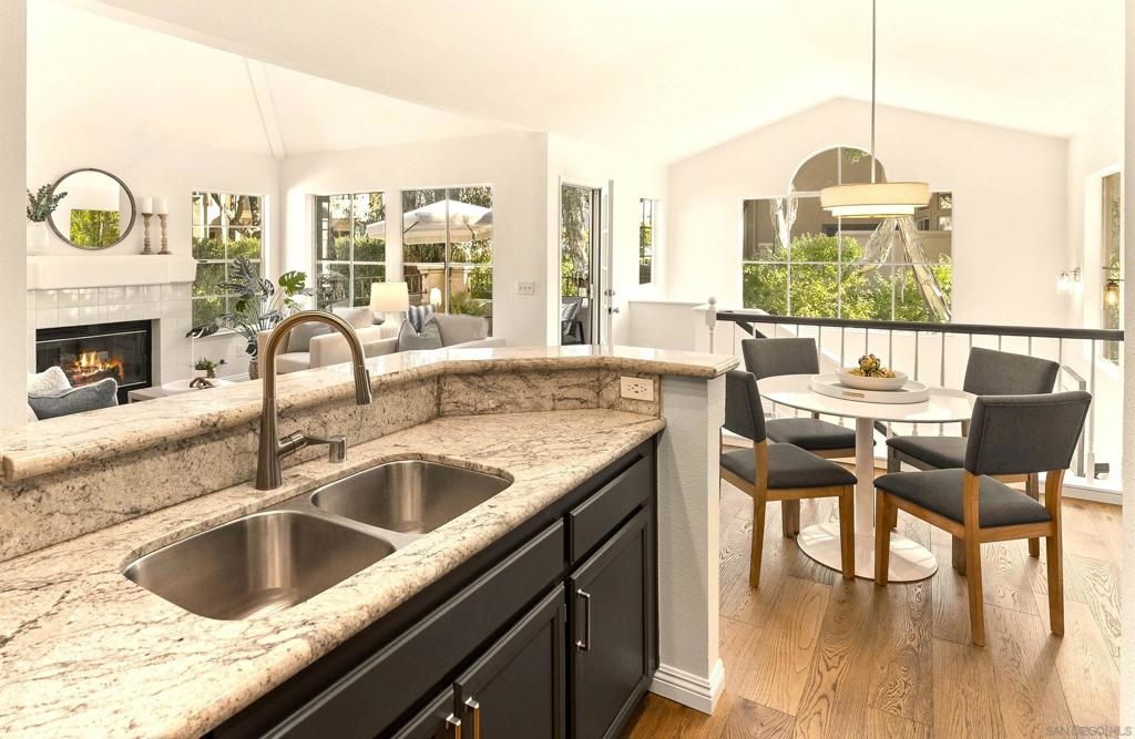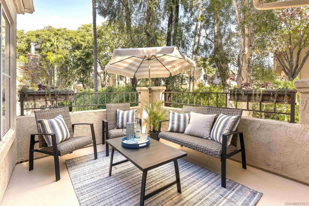 Stunning Upper-Level, 2-Bedroom, 2-Bath Condominium with a Private Corner Location! Features include a bright open floor plan, vaulted ceilings, rich engineered-wood flooring, beautiful kitchen remodel with granite counters and premium stainless steel appliances, large outdoor patio balcony, spacious bedrooms with classic wood shutters, walk-in closet, central heat and air conditioning, one-car attached garage with full-size laundry plus additional covered carport. Enjoy the beautiful Belsera community with sparkling pools, spa, recreation area with volleyball sand court, adjoining Mission Trails Park with endless hiking and biking trails and more!