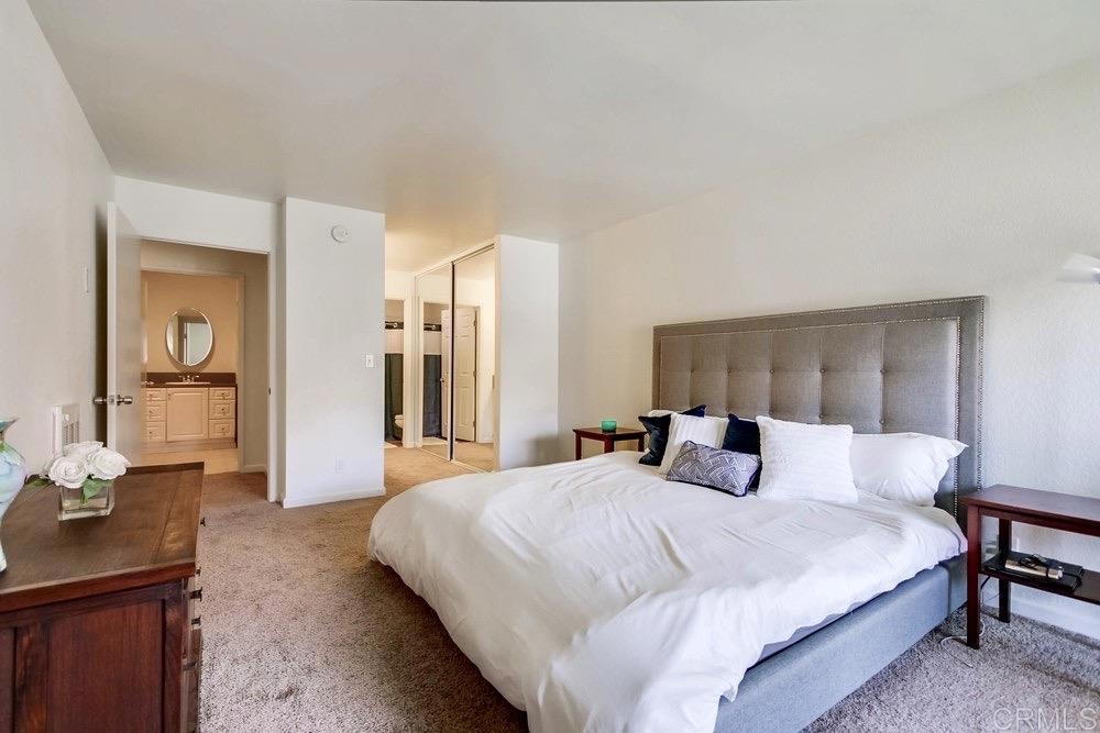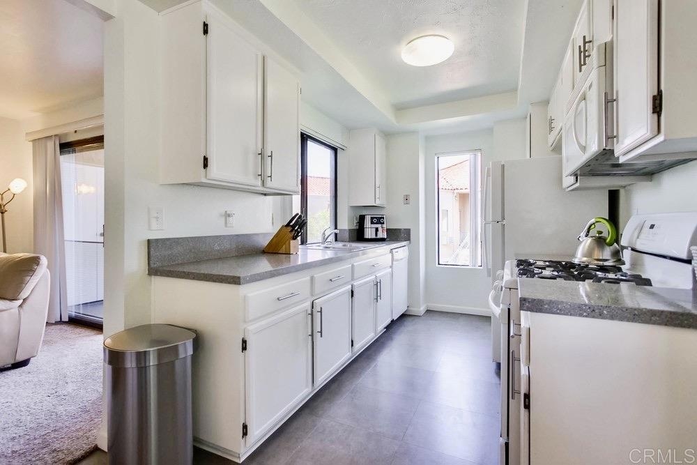 Welcome to Mira Mesa, an Urban Lifestyle you will enjoy. With restaurants, markets, stores, parks, and so much more within walking distance. Welcome home to your bright and open corner condo with tons of storage. The living room features an array of windows allowing for an abundance of natural light to filter into this lovely space. The patio off of the living room is great for a BBQ or outdoor garden area. The high ceilings create an open and airy feeling that you will most definitely enjoy. Huge Primary Suite with attached bathroom and ample additional space for in-home office. Mirrored closet doors throughout make the space feel even larger. Features upgraded countertops throughout, in-unit laundry and plenty of convenient street parking. This home is a must see!