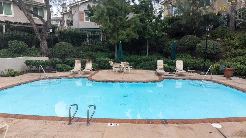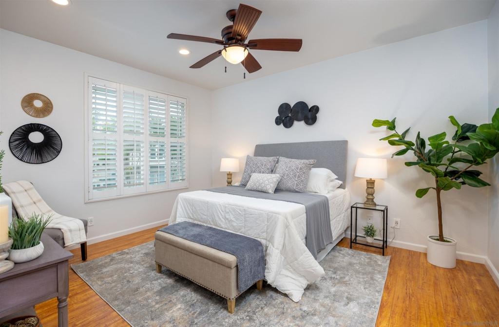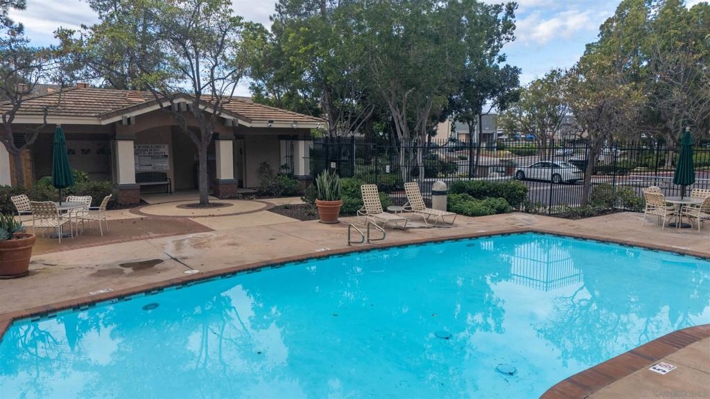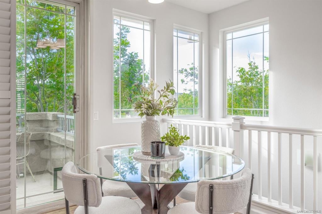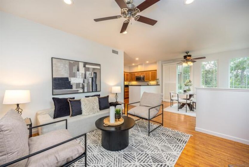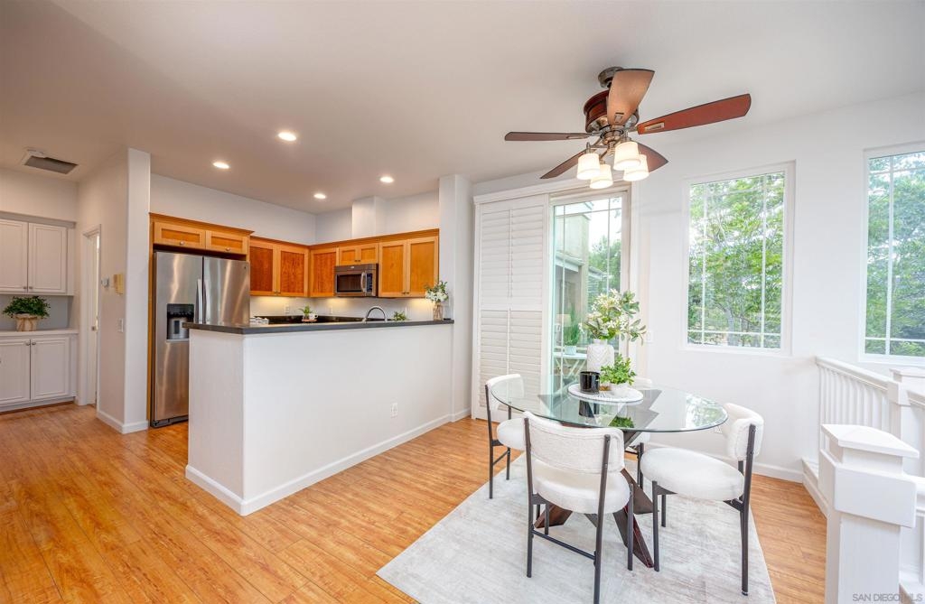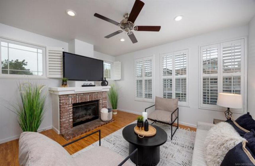 Absolutely GORGEOUS corner-unit condominium in the highly desirable Windham community of Carmel Mountain Ranch. This light and bright end unit features a thoughtfully designed layout that floods the space with natural light from 3 sides, creating an inviting and open feel throughout. The welcoming living room offers a cozy fireplace, perfect for relaxing or entertaining. Pride of ownership shines with upgrades galore, including German-engineered wood flooring, plantation shutters, vaulted ceilings, designer ceiling fans, and freshly painted interiors. The beautifully remodeled galley kitchen boasts top-of-the-line appliances, black granite countertops, and custom hickory cabinetry. Both bathrooms have been updated with new vanities, fixtures, lighting, and mirrors, and the primary bath features a seamless, high-end shower enclosure. Additional highlights include a new ultra-quiet energy-efficient AC unit, central heat and air, in-unit full-size washer and dryer, energy-efficient Craftsman-style dual-pane windows (low utility bills), and an attached 2-car garage with full-speed 60A Tesla EV charger. Enjoy a walkable lifestyle just steps to Starbucks, Trader Joe's, the library, Ralphs, Poway Unified schools, and Sabre Springs transit station—plus minutes to Costco, I-15/SR-56, UTC/downtown (20-25 min). Community perks include being steps from the pool, spa, and BBQ area (HOA covers all exterior maintenance, including a recent complete re-roof). This must-see condominium offers exceptional upgrades, location, and lifestyle.