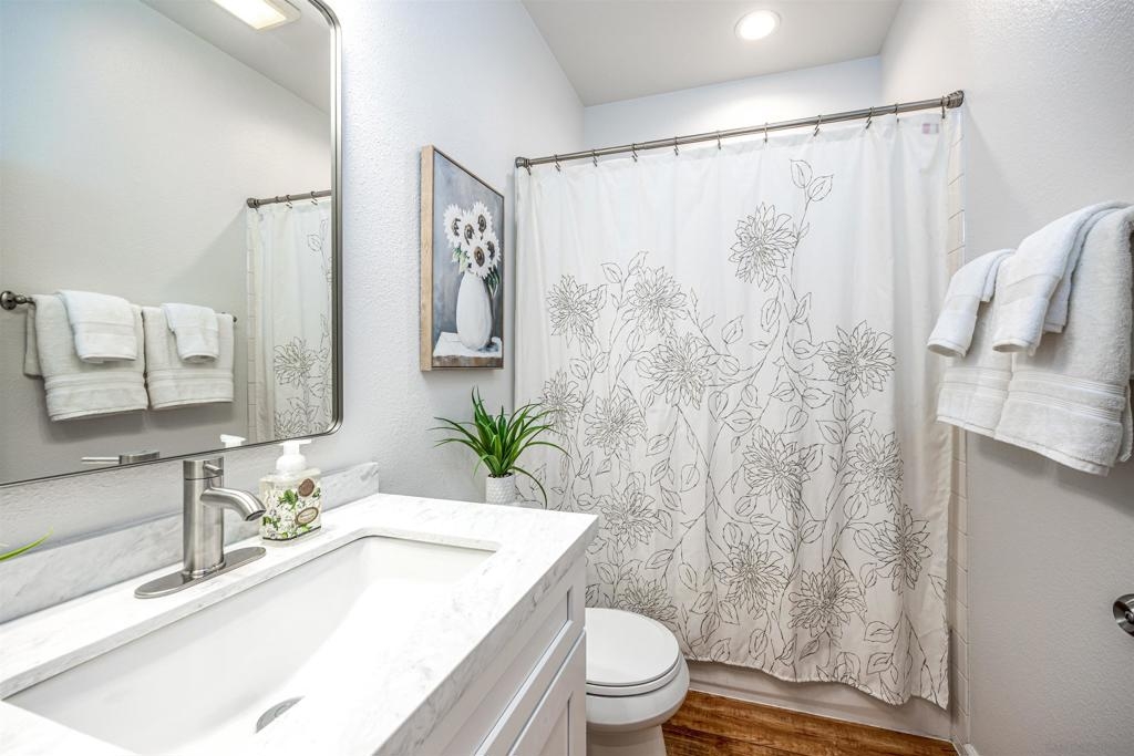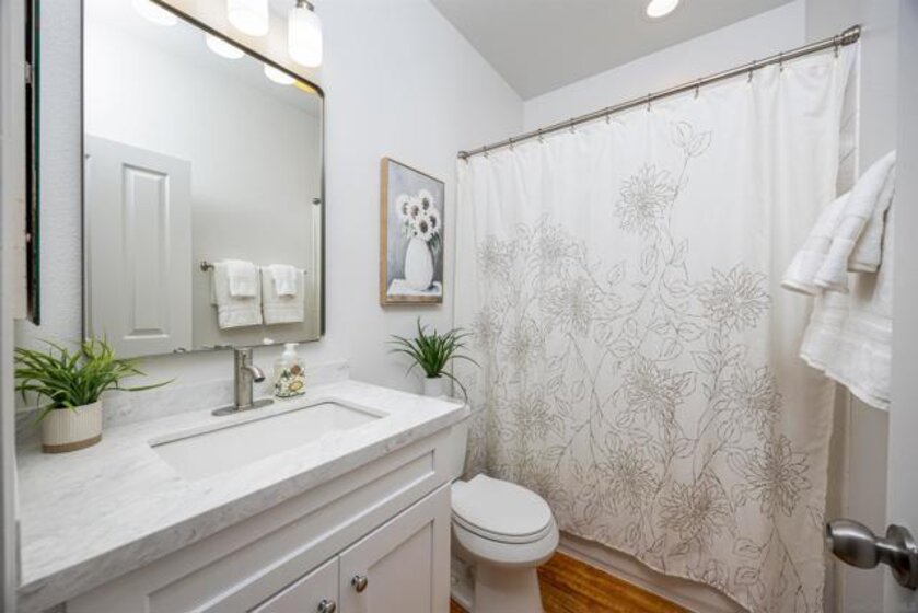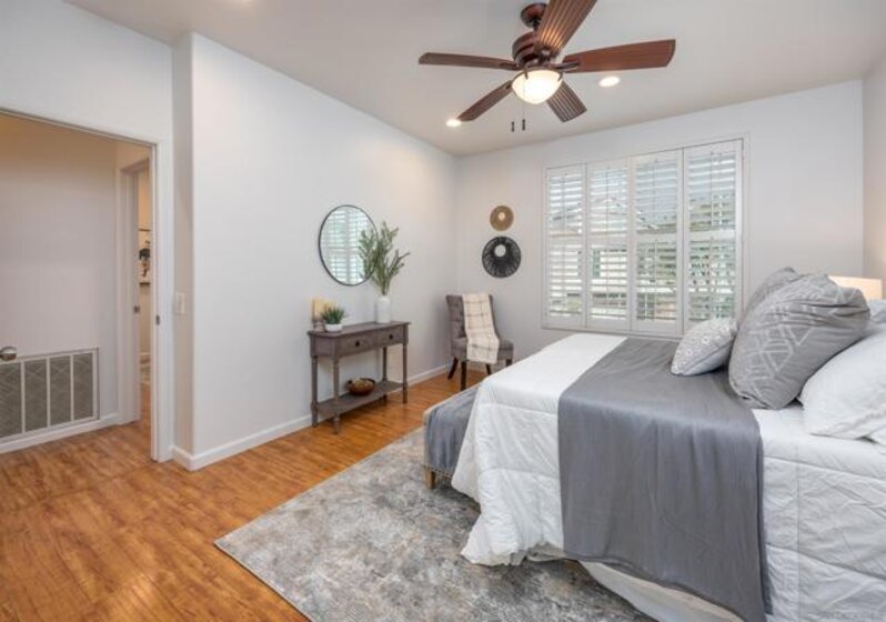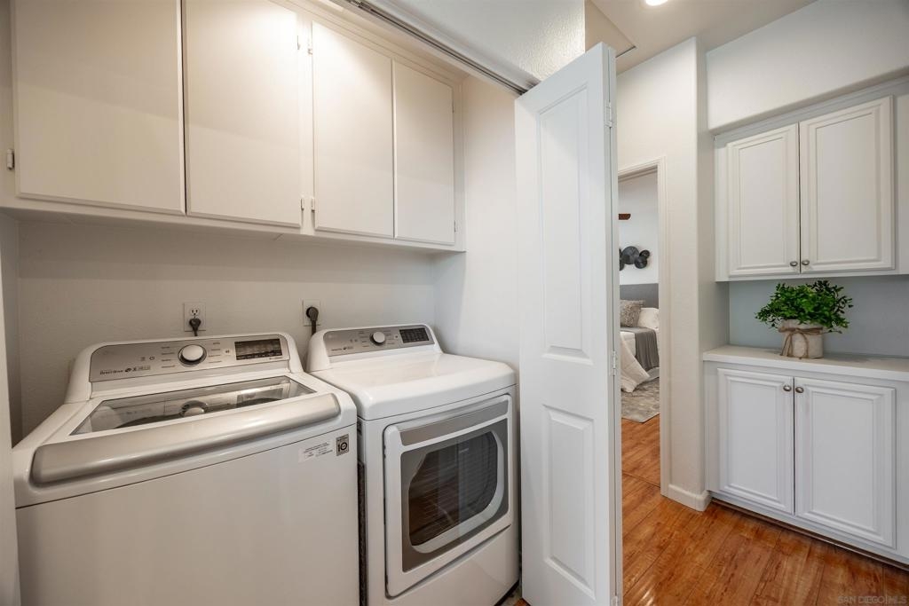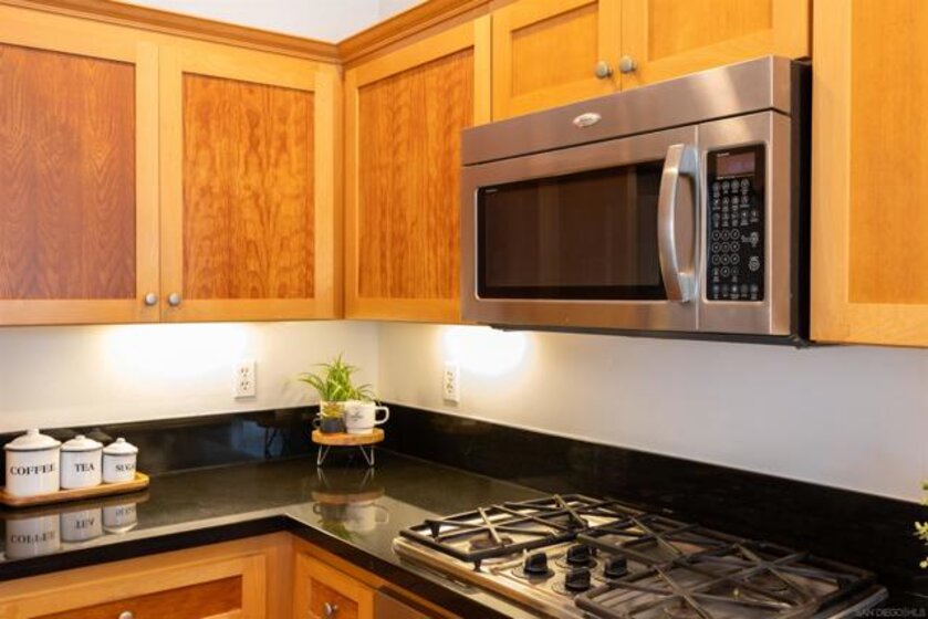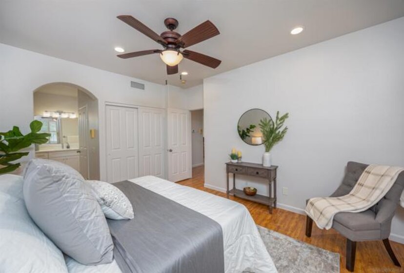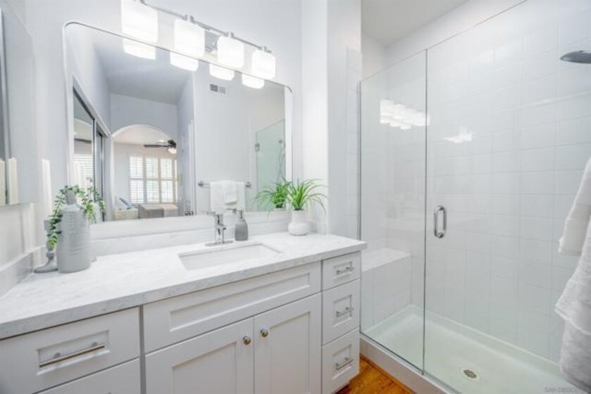 Absolutely GORGEOUS corner-unit condominium in the highly desirable Windham community of Carmel Mountain Ranch. This light and bright end unit features a thoughtfully designed layout that floods the space with natural light from 3 sides, creating an inviting and open feel throughout. The welcoming living room offers a cozy fireplace, perfect for relaxing or entertaining. Pride of ownership shines with upgrades galore, including German-engineered wood flooring, plantation shutters, vaulted ceilings, designer ceiling fans, and freshly painted interiors. The beautifully remodeled galley kitchen boasts top-of-the-line appliances, black granite countertops, and custom hickory cabinetry. Both bathrooms have been updated with new vanities, fixtures, lighting, and mirrors, and the primary bath features a seamless, high-end shower enclosure. Additional highlights include a new ultra-quiet energy-efficient AC unit, central heat and air, in-unit full-size washer and dryer, energy-efficient Craftsman-style dual-pane windows (low utility bills), and an attached 2-car garage with full-speed 60A Tesla EV charger. Enjoy a walkable lifestyle just steps to Starbucks, Trader Joe's, the library, Ralphs, Poway Unified schools, and Sabre Springs transit station—plus minutes to Costco, I-15/SR-56, UTC/downtown (20-25 min). Community perks include being steps from the pool, spa, and BBQ area (HOA covers all exterior maintenance, including a recent complete re-roof). This must-see condominium offers exceptional upgrades, location, and lifestyle.