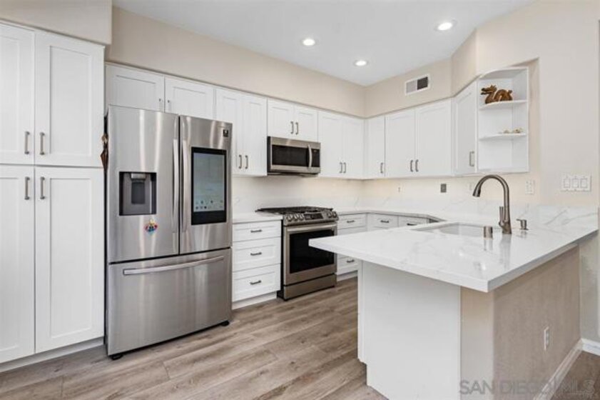 A wow unit in Sabre Terrace! All new carpet and luxury vinyl flooring, newer kitchen with quartz counters, stainless appliances, new HVAC system, recessed lighting, private patio/garden area. Light and bright, Laundry room off of 2 car attached garage with plenty of storage. Quiet section of the complex. Super light and bright unit in Sabre Springs! Remodeled with newer cooks kitchen, carpets,Luxury vinyl wood plank flooring in downstairs area. Well located in complex with great privacy.