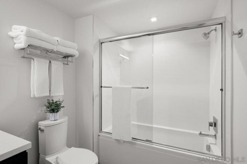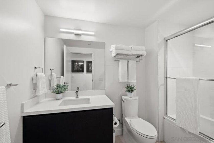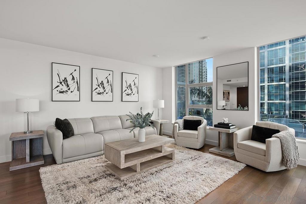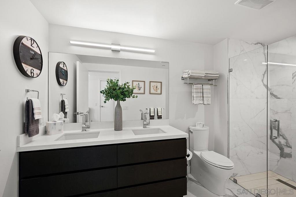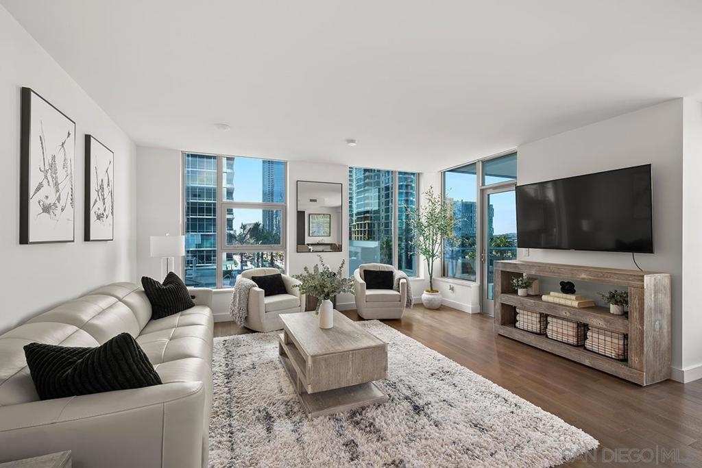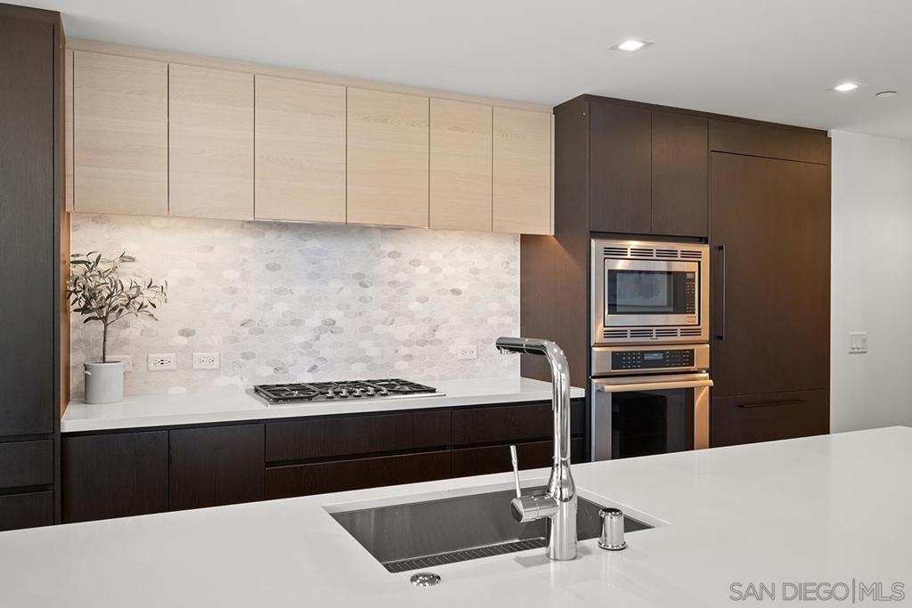 “Pride of Ownership” and “Model-Ready” in Savina’s coveted southwest corner offering the perfect blend of luxury and location! Expansive windows bathe the interior in natural light framing city & bay views while the west-facing balcony sets the stage for enjoying sunset evenings. The open-concept interior is finished with engineered wood flooring, designed for both comfort and entertaining. The gourmet kitchen features premium Thermador stainless appliances, discreet cabinet-front refrigerator, designer tile backsplash, and a striking quartz waterfall island. The primary suite includes a generous walk-in closet, spa-inspired bathroom with dual vanities and a walk-in rain shower. Both bedrooms are large enough to fit king beds and are outfitted with blackout shades. Overlooking Savina’s tranquil and tropical-inspired, courtyard featuring pool, spa, cascading waterfall and all the accoutrements for luxury-resort living, this residence has it all! Additional features include a sizable storage space (4th floor) and secured parking space (P2). All of this is located within one of Downtown’s most sought-after full-service developments, just moments from waterfront parks, the charm of Little Italy, and the very best of San Diego’s coastal urban lifestyle. Savina by Bosa is one of San Diego’s newest high-rise buildings located just steps away from Little Italy, listed as one of Forbes “Best Neighborhoods.” Savina’s first-class amenities include amazing outdoor pool and spa, fitness center with outdoor yoga deck, steam room & sauna, dog wash and pet park, bicycle repair room, and club house/game room with BBQ deck for entertaining. Literally steps away from Waterfront Park, enjoy an array of concerts and outstanding local events. When it’s time to get away, take advantage of your close proximity to the airport, cruise terminal, and train/trolley stations. Whether winding down on the private balcony or making your way to one of Little Italy’s countless renowned restaurants, Savina is city living at its finest.