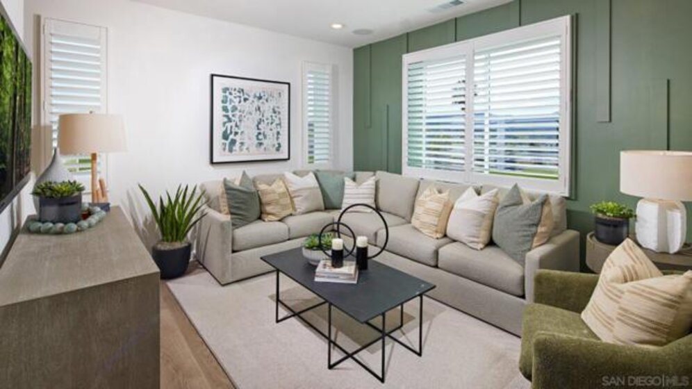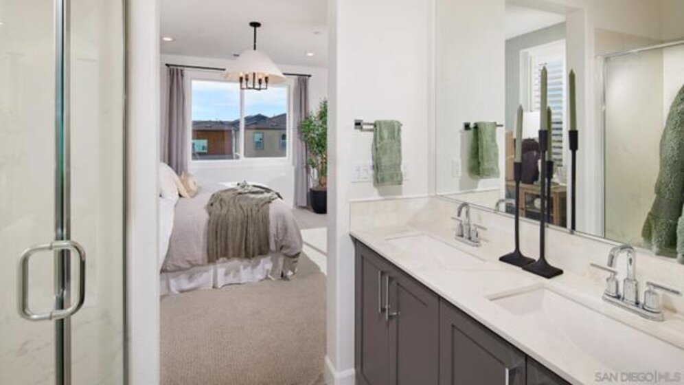 This home is a former model home and ready for a quick move-in. It has upgraded backsplashes and flooring. The kitchen shares a footprint with the Great Room on the second floor of this new three-story townhome, and a deck is easily accessible off the main living area for seamless indoor-outdoor transitions. Two bedrooms can be found upstairs, including the luxurious owner’s suite, complete with a private bathroom and walk-in closet. A two-bay garage completes the home. The Trails is a brand-new masterplan with single-family and attached homes in Carmel Mountain Ranch, San Diego, CA. Five communities of attached homes now selling! Lavender is a collection of brand-new townhomes for sale within The Trails masterplan in San Diego, CA. Residents enjoy a great central location and easy access to I-15 and 56 freeways for simplified commutes and getting around. The community is conveniently close to shopping at Carmel Mountain Ranch and UTC, 4S Ranch, Del Sur and more. Students will attend schools within the Poway School District.