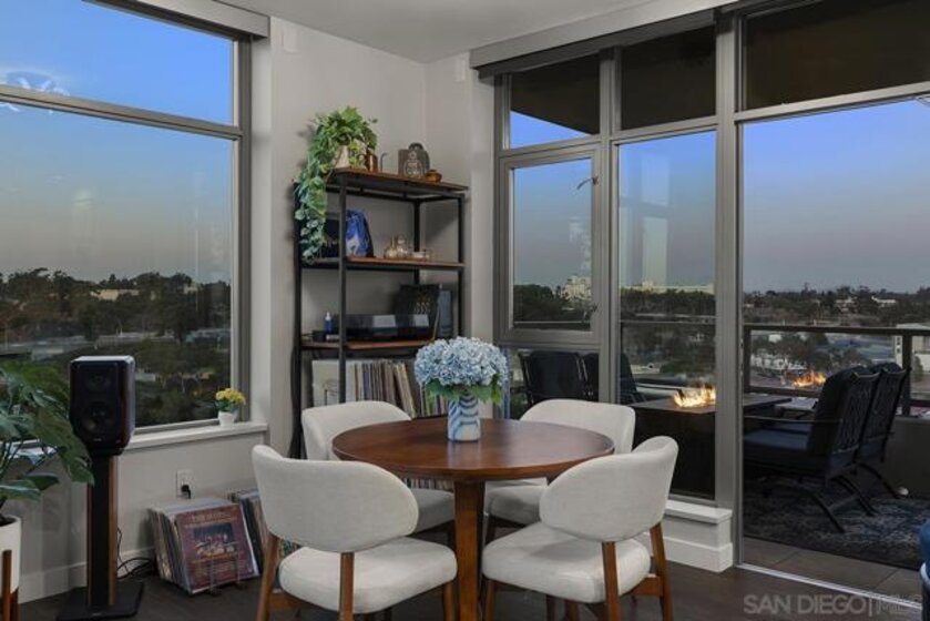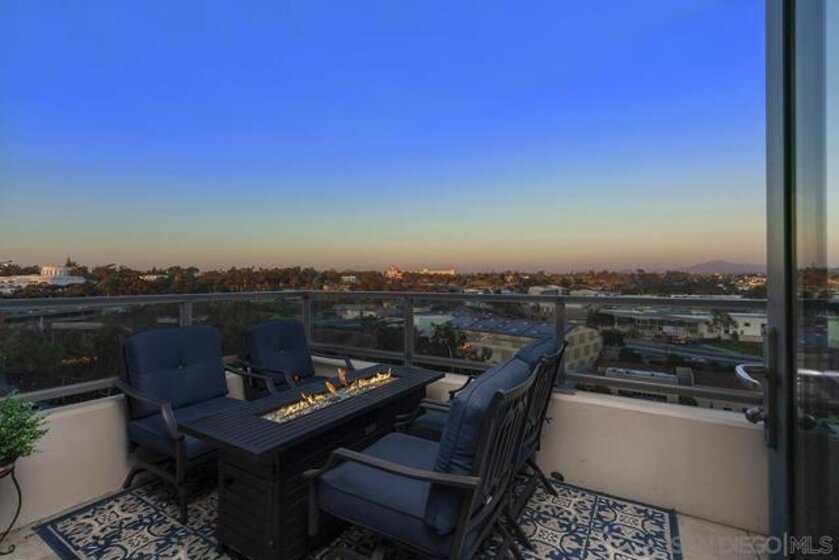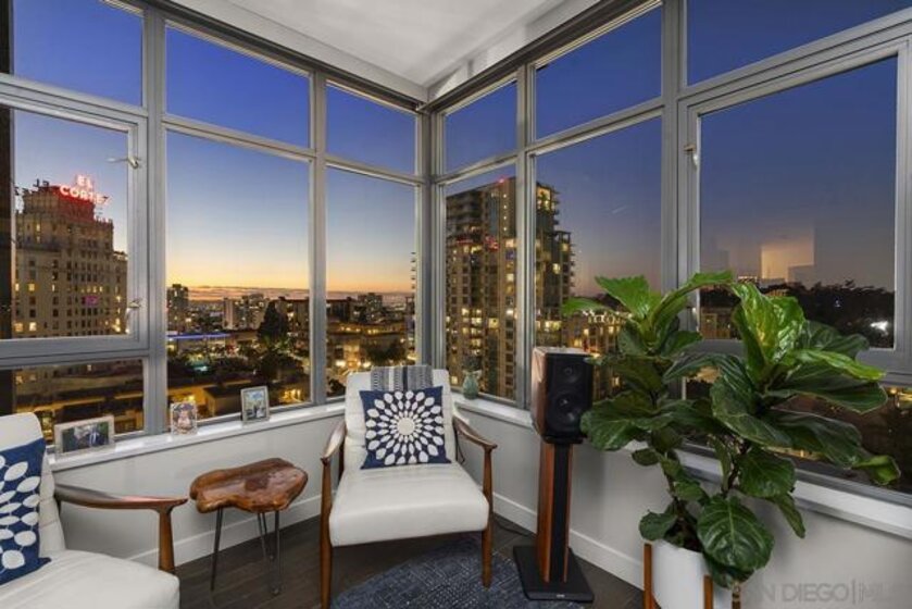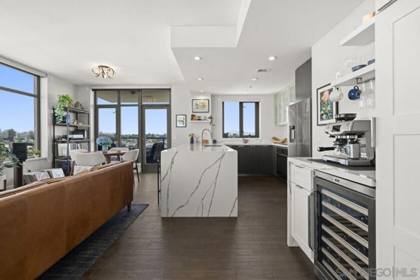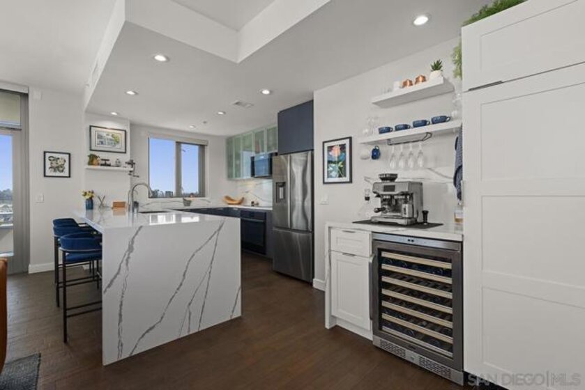 Perched on the 14th floor, this northeast corner residence at Aria impresses with sweeping 270° views of the city skyline, Balboa Park, distant mountains, and even glimpses of the Bay and Coronado Bridge. Enjoy the vibrant Downtown energy from your spacious private balcony—perfect for morning coffee or soaking in peaceful sunrises. Inside, the open living area dazzles with sleek ceramic wood-look tile flooring, floor-to-ceiling windows, motorized shades, and airy 9-foot ceilings that create a seamless blend of comfort and sophistication. The chef-inspired kitchen is a true showpiece, featuring Calacatta quartz countertops with a waterfall edge and backsplash, an extended eat-at bar, Bosch induction cooktop, convection oven with air fryer, dual-drawer dishwasher, instant hot water faucet, and Gallery microwave. A custom-built coffee bar and beverage chiller elevate everyday convenience with a touch of luxury. The primary suite includes blackout shades and a beautifully upgraded ensuite bath with a glass shower enclosure and dual vanity, while the guest bathroom features a custom-built linen cabinet for added storage. Additional highlights include tandem parking and a private storage room conveniently located directly in front of the parking spaces. Set within the sought-after Cortez Hill neighborhood, Aria offers a serene residential feel just moments from Downtown’s finest dining, culture, and entertainment—modern luxury perfectly balanced with urban excitement. Located atop Cortez Hill, the highest point in San Diego, Aria was completed in 2008 and comprises 137 units. This prime location is set away from the city's hustle and bustle, offering both tranquility and convenience. Residents can enjoy a short stroll or drive to Balboa Park and the vibrant offerings of Downtown San Diego, coupled with excellent freeway access for broader travels. Aria residences boast spacious outdoor balconies and terraces, enhancing the living experience with modern comforts and stunning views of the bay, Balboa Park, and the city skyline. The building's amenities include a fitness center, lap pool and spa, club room with a catering kitchen and wet bar, all designed to elevate the quality of life for its residents.