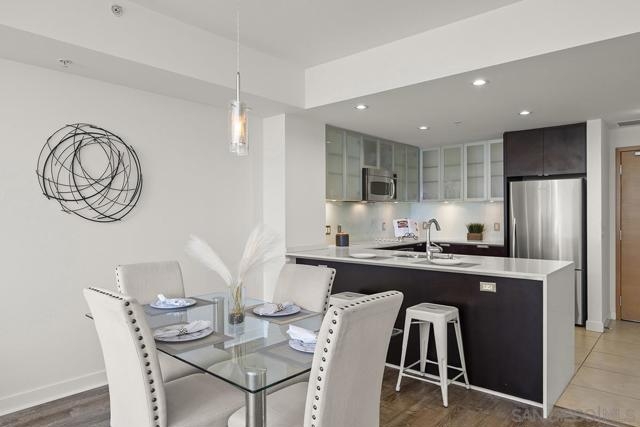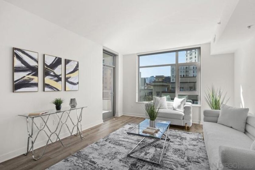 Capture the best of Downtown San Diego living in this 6th-floor, west-facing Aria residence. Enjoy city views and sunset skies from your private balcony. Inside, this spacious one-bedroom features modern "Woodacres Oak" luxury vinyl flooring, abundant natural light, and an open layout ideal for both relaxation and entertaining. The kitchen impresses with stainless appliances, recessed lighting, quartz counters and a stylish eat-at bar with a waterfall edge that is perfect for casual dining. The bedroom offers comfort and privacy with an ensuite bathroom and generous closet space. Added conveniences include in-unit stackable washer/dryer and a secured parking space. Perched in the highly sought-after Cortez Hill neighborhood, residents enjoy a serene, residential atmosphere just minutes from Downtown San Diego’s premier dining, shopping, cultural attractions, and the vibrant Gaslamp Quarter. Discover modern luxury living in one of Downtown’s most charming and well-connected communities. Located atop Cortez Hill, the highest point in San Diego, Aria was completed in 2008 and comprises 137 units. This prime location is set away from the city's hustle and bustle, offering both tranquility and convenience. Residents can enjoy a short stroll or drive to Balboa Park and the vibrant offerings of Downtown San Diego, coupled with excellent freeway access for broader travels. Aria residences boast spacious outdoor balconies and terraces, enhancing the living experience with modern comforts and stunning views of the bay, Balboa Park, and the city skyline. The building's amenities include a fitness center, lap pool and spa, club room with a catering kitchen and wet bar, all designed to elevate the quality of life for its residents.
