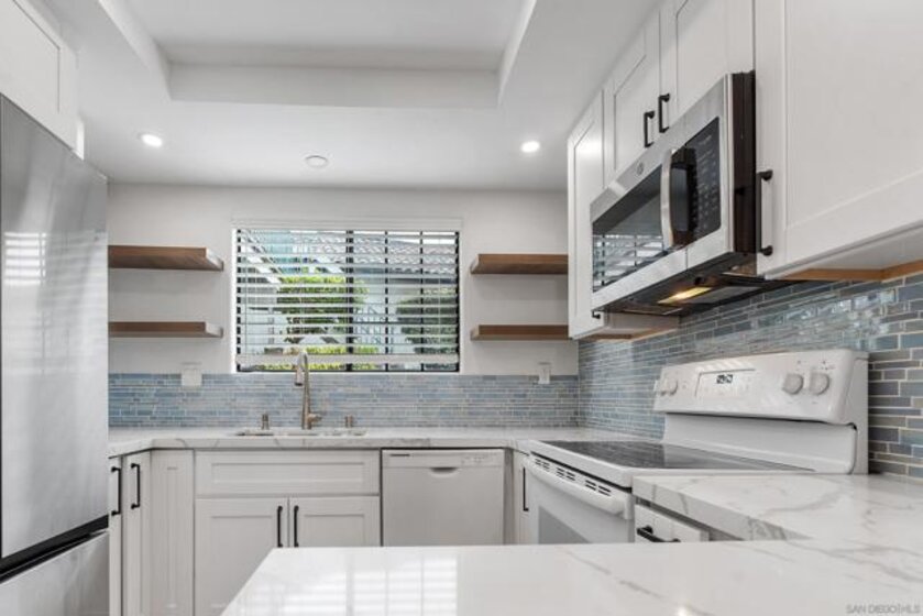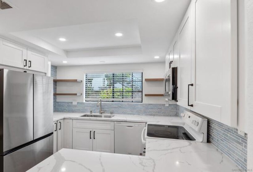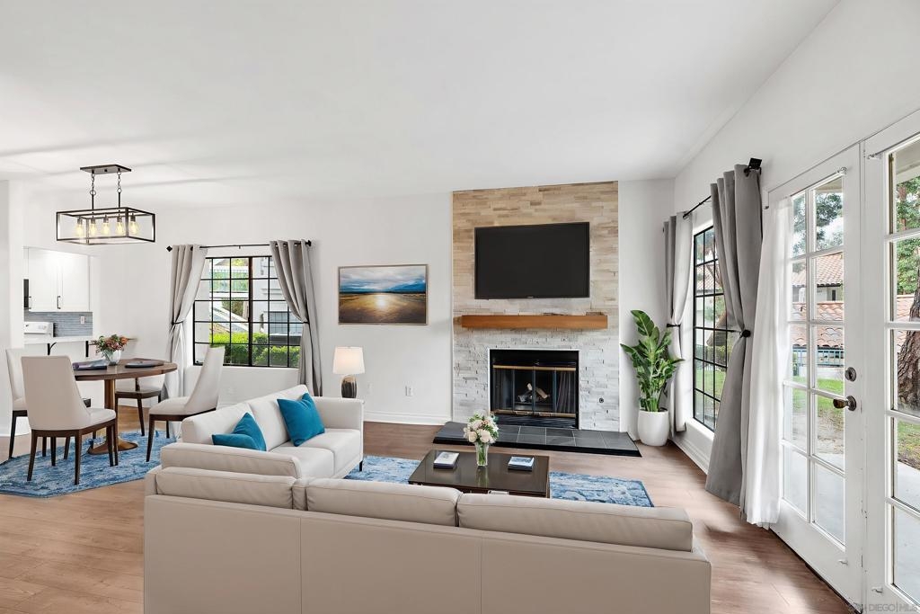 Refined single-story, first floor living awaits in the highly coveted Bernardo Heights community of Mira La Paz. This light-filled three-bedroom, two-bath end-unit residence offers privacy and effortless flow. Thoughtfully upgraded, this home showcases a beautifully remodeled kitchen with soft-close cabinetry and elegant quartz countertops. Wide-plank luxury vinyl flooring extends throughout, complemented by an upgraded gas fireplace, fresh interior paint, new trim and baseboards, and curated designer finishes. Additional highlights include: a newer water heater installed in 2022 and a detached TWO-car garage providing generous parking and storage. The HOA offers exceptional value, covering water, trash, cable, internet, exterior building maintenance/landscaping, and membership to the exclusive Bernardo Heights Clubhouse. The Bernardo Heights Clubhouse features a fitness center, 2 pools (main pool heated to 82 degrees F), wading pool, spa, locker rooms, tennis courts, 4 pickleball courts, 2 electric-gas grills, 2 basketball hoops, ping pong table, 2 pool tables, foosball, and a swim instructor and private tennis pro are available for lessons (fee-based). Lucido Park (close by) features 4 tennis courts, a playing field, 2 charcoal BBQs, and a children's play area. Ideally located within the award-winning Poway Unified School District and mere minutes away from freeway access, this gem won't last long! Come see it today before it's too late!