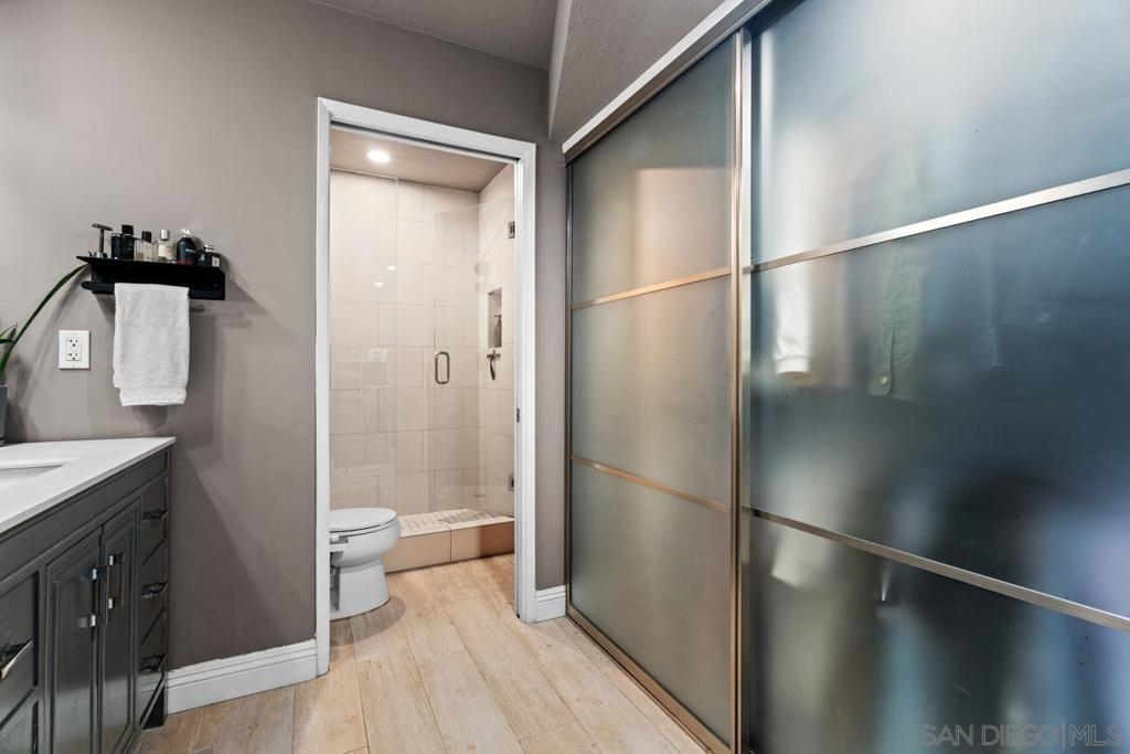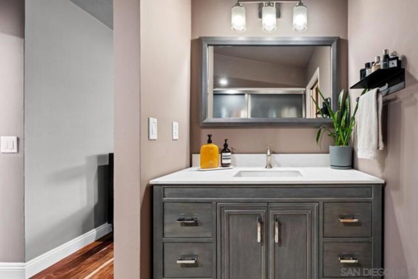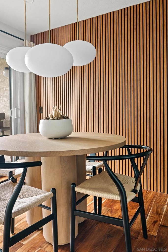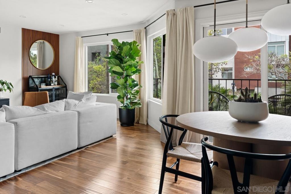 Tucked into the heart of Cortez Hill at Park View, this southwest-facing corner residence offers a rare blend of natural light, privacy, and design. Perched above a quiet, tree-lined street, the home is wrapped in windows and filled with light throughout the day, creating an open, inviting feel that’s hard to find downtown. Just moments from Little Italy and Balboa Park, the location delivers both walkability and a more residential setting. Extensively updated, the home features acacia wood floors, smooth-coated walls, and curated finishes throughout. The living and dining areas are anchored by custom wood slat accent walls and designer lighting, including a Crate & Barrel chandelier and CB2 fixtures, adding warmth and architectural interest. The kitchen offers granite countertops, stainless steel appliances, and a seamless connection to the main living space. Both bedrooms are generously sized, including a primary suite with an ensuite bath, ample closet space, and motorized blackout shades. Bathrooms have been tastefully remodeled with a clean, modern design. Additional highlights include a large in-unit laundry room, two side-by-side parking spaces with EV charging, and a brand new HVAC system. New windows and southwest exposure enhance natural light throughout. Smart home features include Philips Hue lighting, smart switches, Nest thermostat, and SimpliSafe security system. The home blends thoughtful design with modern convenience in one of downtown San Diego’s most desirable neighborhoods.