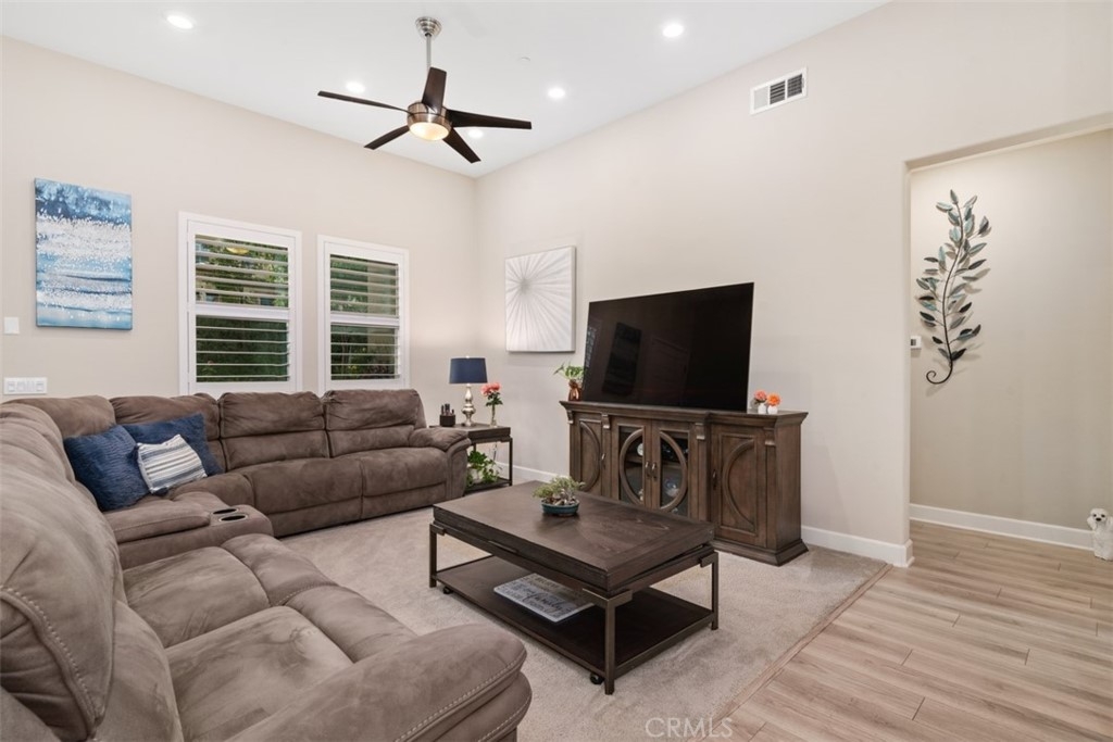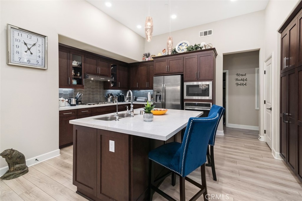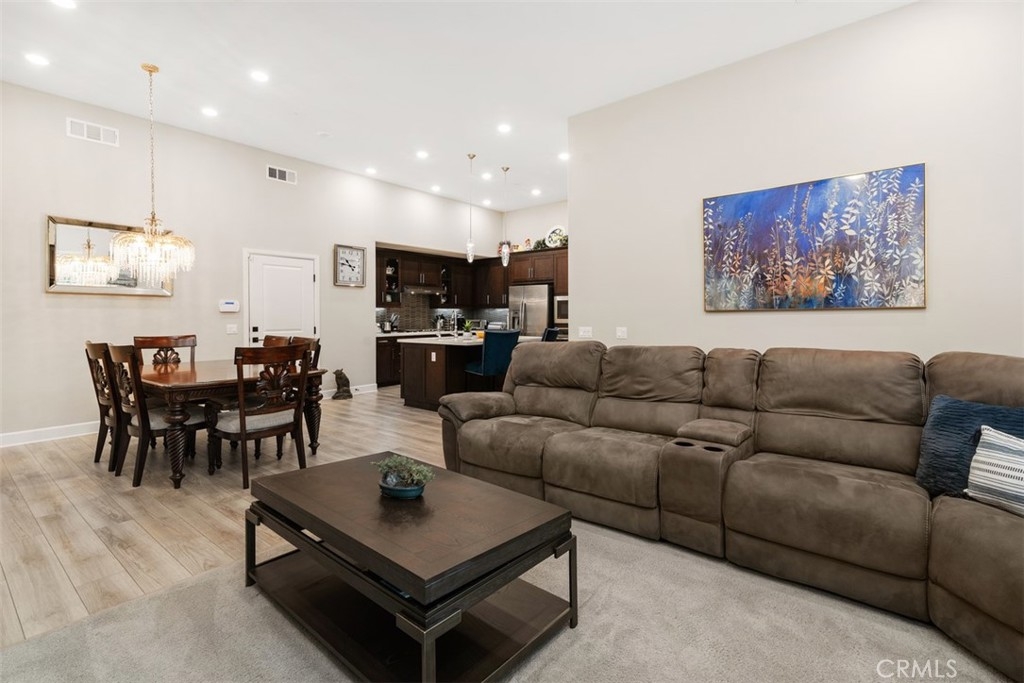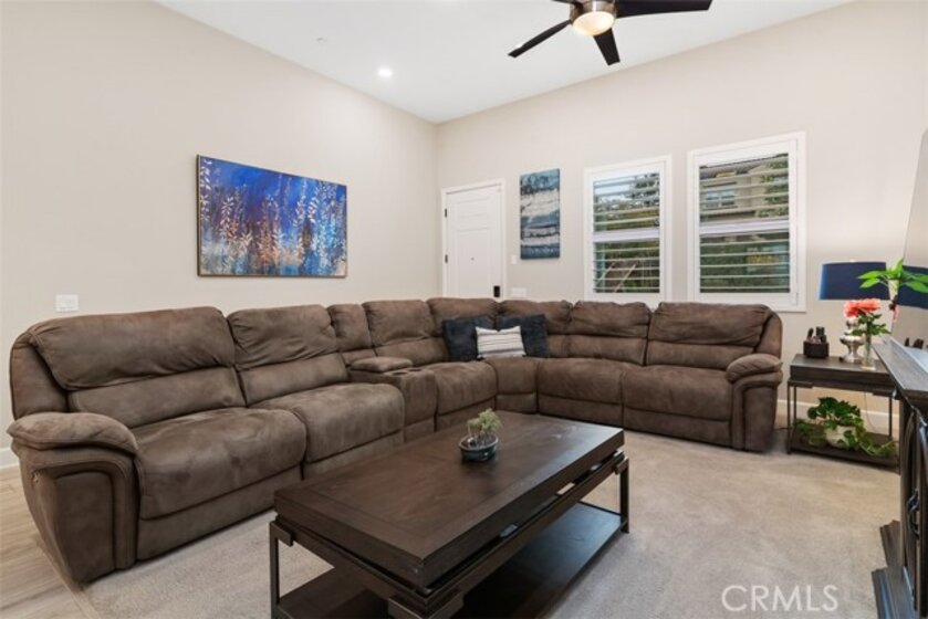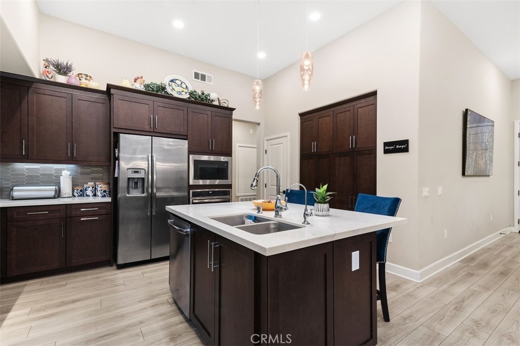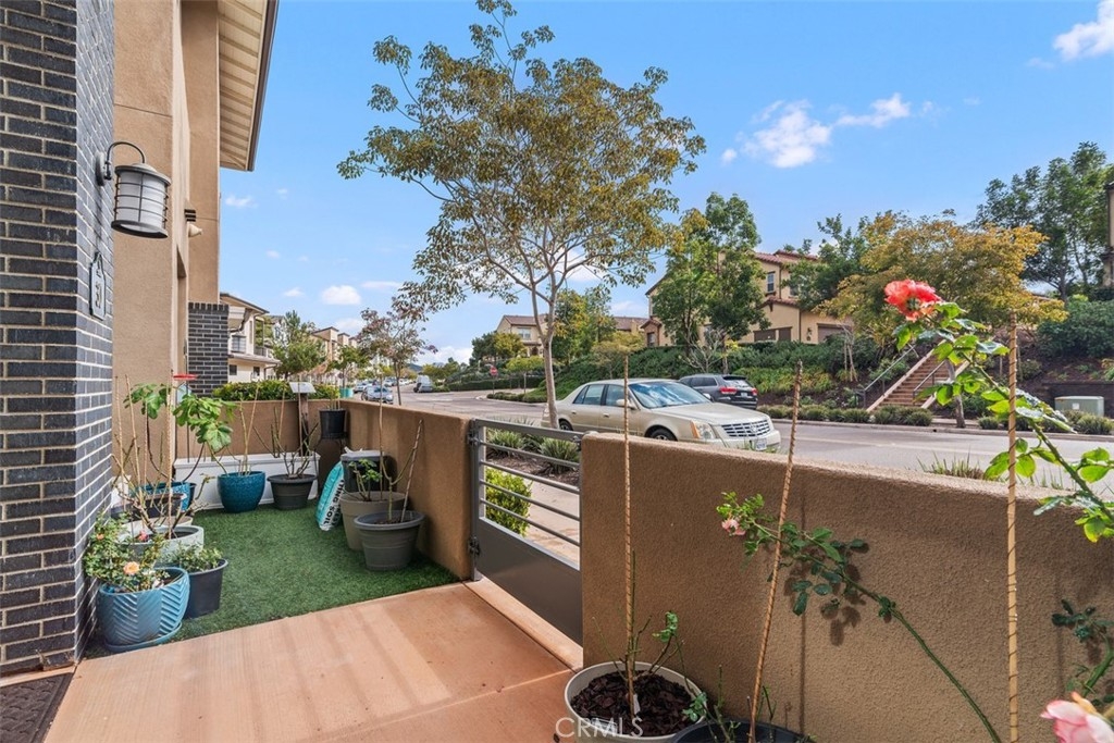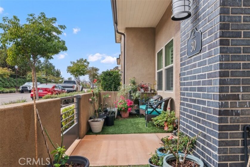Elegant SINGLE STORY, 3 bedroom, 2 bath townhouse in Avante 55+ gated community. Built in 2018 and is conveniently located in the heart of Del Sur, and within walking distance to Del Sur Town Center. Avante is part of the Del Sur Master Planned Community, which grants homeowners access to 11 pools, trails, numerous parks, dog parks, and year-round neighborhood events. This stunning home has a spacious open floor plan with a modern kitchen and high ceilings (12 feet!). Stainless steel appliances, washer and dryer, quartz counter tops, designer tile backsplashes and a large kitchen island with a built-in dishwasher, disposal, and a reverse osmosis water filtration system. It has luxurious plank flooring, upgraded carpet in the bedrooms and living room, plus you’ll find crown molding in the master, a large custom designed walk-in closet, a tiled shower and double sinks in the en suite master bathroom. This home is also equipped with 8 solar panels, ceiling fans, a security system, smoke and carbon monoxide detectors, and sprinklers. The attached 2 car garage has custom epoxy flooring and a tankless water heater. Enjoy a low maintenance lifestyle while relaxing on the sunny front patio! Avante has a beautiful private clubhouse, heated pool, jacuzzi, gym, fire pit, and 2 barbeques areas. Live comfortably in this spacious and conveniently located gem.