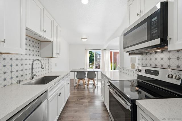 Welcome home to this freshly painted, upgraded end-unit home in the gated Harbor Vista community. This desirable one-bedroom, one-bath home features an in-unit washer and dryer for added convenience. Modern kitchen features newer appliances, recessed lighting, granite counters, and decorative backsplash. Community amenities include an assigned parking space, two heated pools with spas, a picnic area, laundry facilities, and a clubhouse. HOA fees cover water, hot water, trash, security, and pool maintenance. Just steps from Euclid Avenue’s restaurants, banks, gym, and convenience stores, with easy access to CA-94. Conveniently located less than 10 minutes from Downtown and Mission Valley, and minutes to major military bases, this home offers the perfect blend of comfort, privacy, and accessibility!