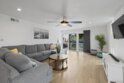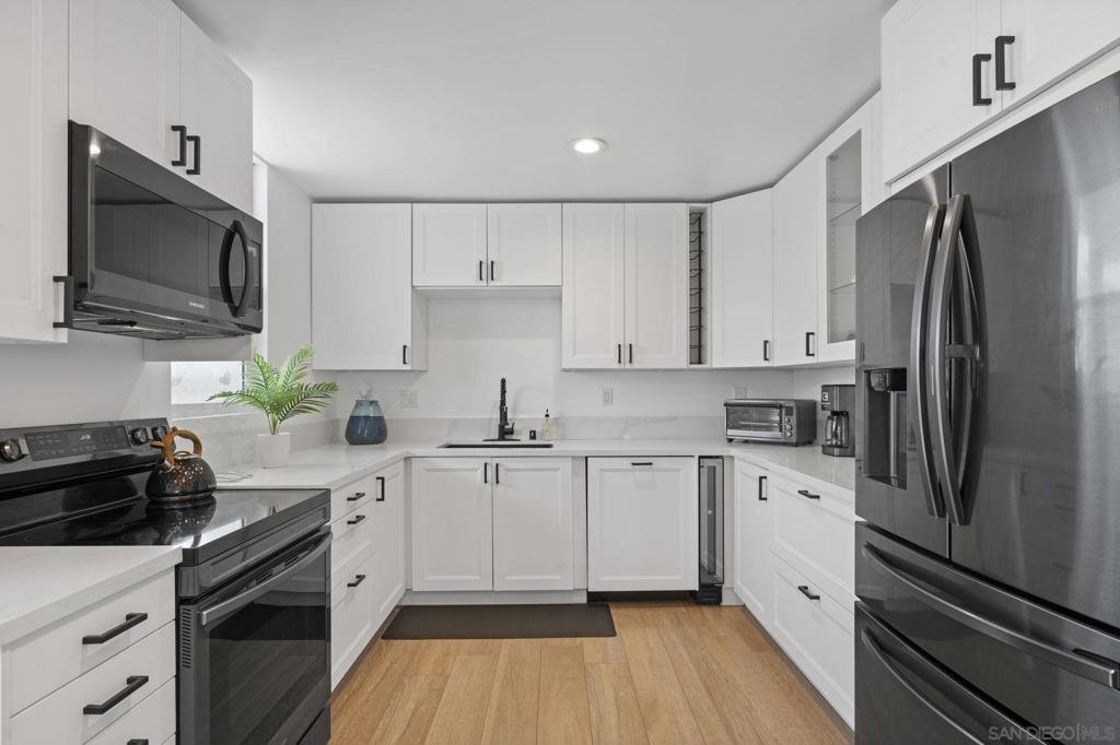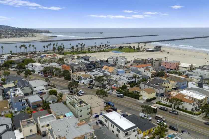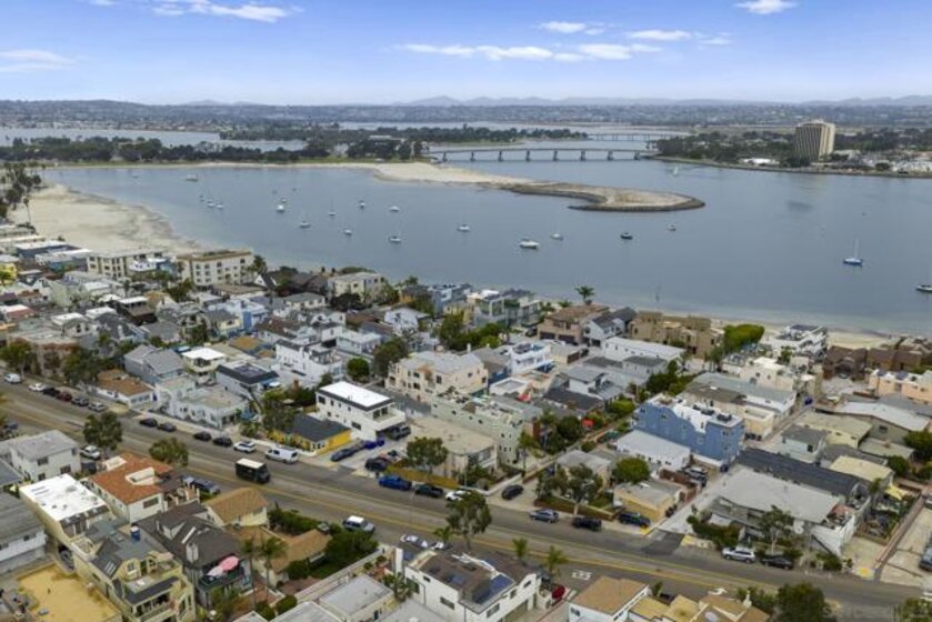 Welcome to this modern interior designed single level beach home. You will love the spacious two-bedroom, two-bath which was completely renovated in 2022. The open-concept layout creates an expansive great room that is ideal for both relaxing and entertaining. The gourmet kitchen features premium white cabinetry, stone countertops, and black stainless steel appliances. The living space extends outdoors to a huge private patio area, providing a seamless indoor-outdoor lifestyle. Primary bathroom has dual vanities and both bathrooms have custom, built-in showers. This home comes fully equipped with high-end furnishings, a rare bonus for the new owner or vacation rental. Full washer/dryer in the closet. It includes two dedicated parking spaces: a one-car garage plus one assigned spot.You are steps away from the sandy beaches, Belmont park and a quick drive to Seaworld and downtown. No HOA fee.
