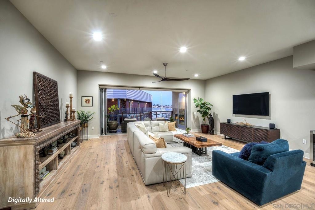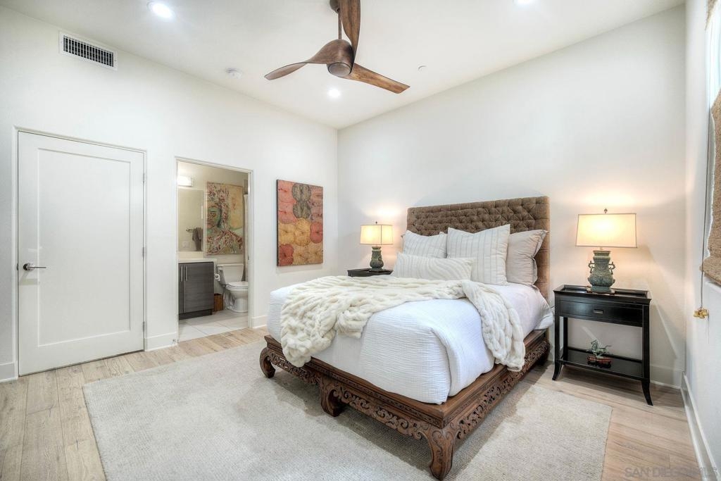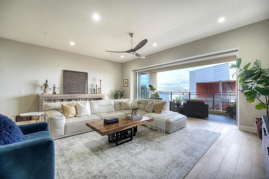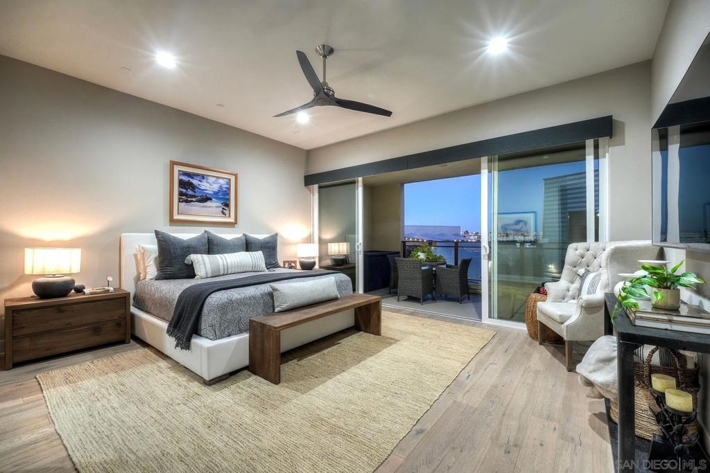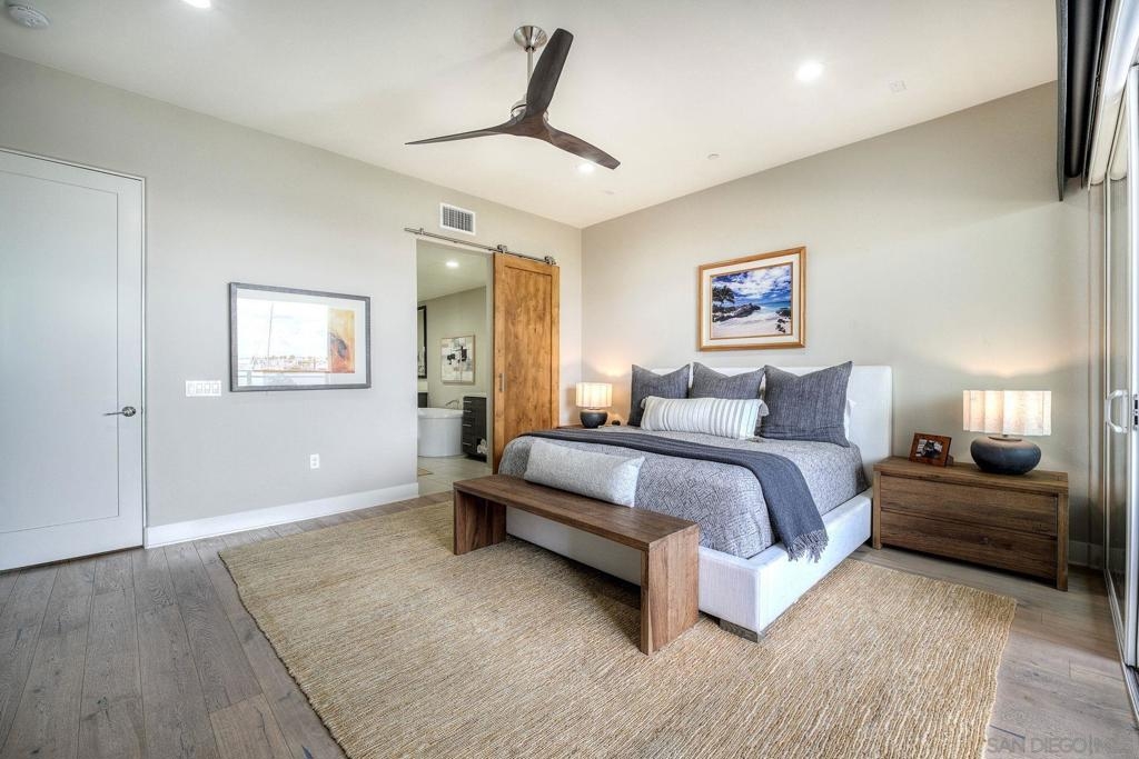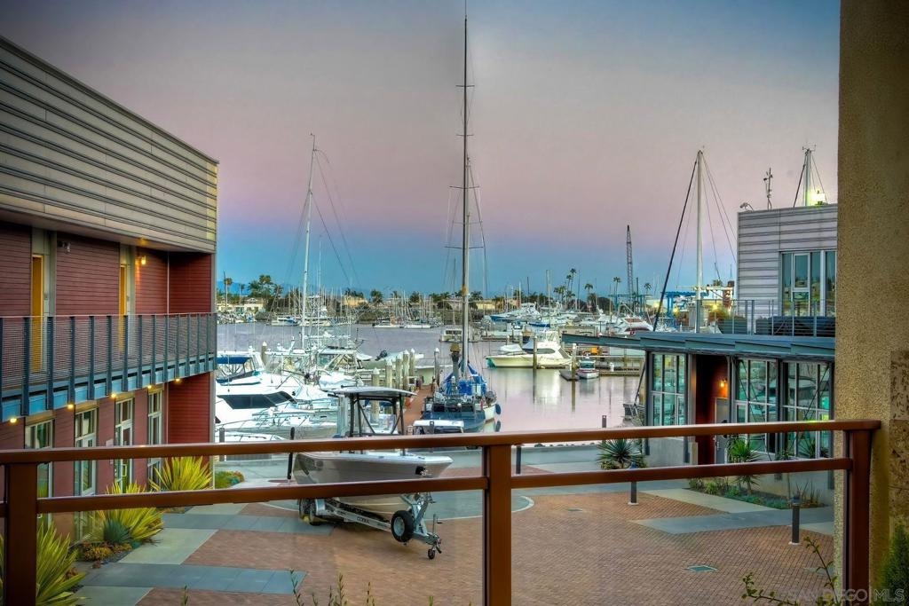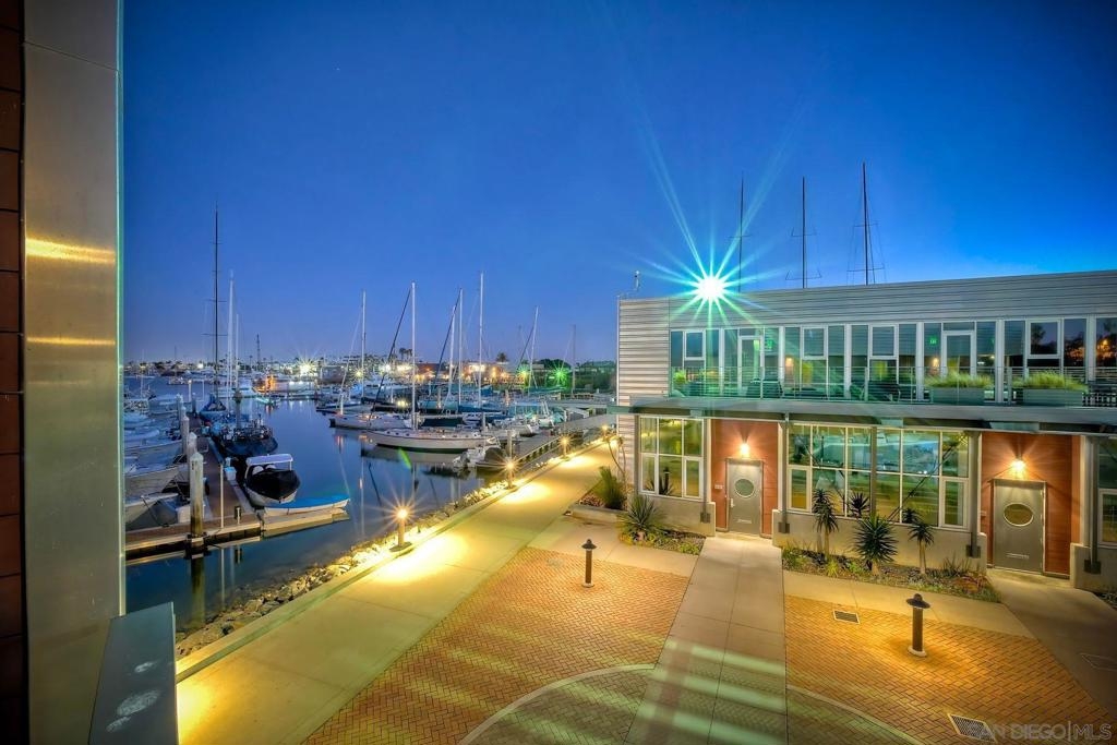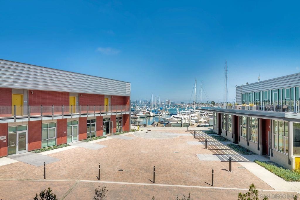 Welcome to Waterpoint, one of Point Loma's most coveted waterfront communities. This exquisite single-level residence offers an expansive 2,214 sq. ft. of refined coastal living space with sweeping views of the downtown SD skyline and bay. Designed for effortless luxury, this home features 10 ft ceilings, 3 full baths, 2 expansive primary-style suites plus a versatile office/den which can easily be converted into a 3rd bedroom. The chef's kitchen showcases European-style cabinetry, Bosch appliances, a wine fridge & generous prep space ideal for entertaining on a grand scale. The open living area flows seamlessly through LaCantina stacking doors to a private outdoor patio complete with a cozy fireplace - the perfect setting to enjoy coastal breezes & the glittering skyline. The primary suite features a spa-inspired bathroom offering a spacious walk-in shower and a floating soaking tub. The dreamy walk-in closet complete with built-ins has plenty of space for all of your luxury items, and you don't want to miss the sliding glass doors leading to your second private patio - perfect for your morning coffee. Thoughtful items and upgrades to note; hardwood flooring throughout, LED recessed lighting fixtures throughout, modern barn doors on primary bathroom and office/den space creating privacy, motorized blackout shades in the primary bedroom, gas stub out on patio for your BBQ, & pull out shelves throughout the kitchen. Waterpoint is conveniently located directly behind numerous waterfront paths leading to restaurants, coffee shops, and multiple docks for our boat lovers. You are also just a few minutes away from the SD Yacht Club, Liberty Station and the SD Airport.
