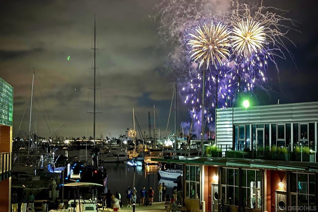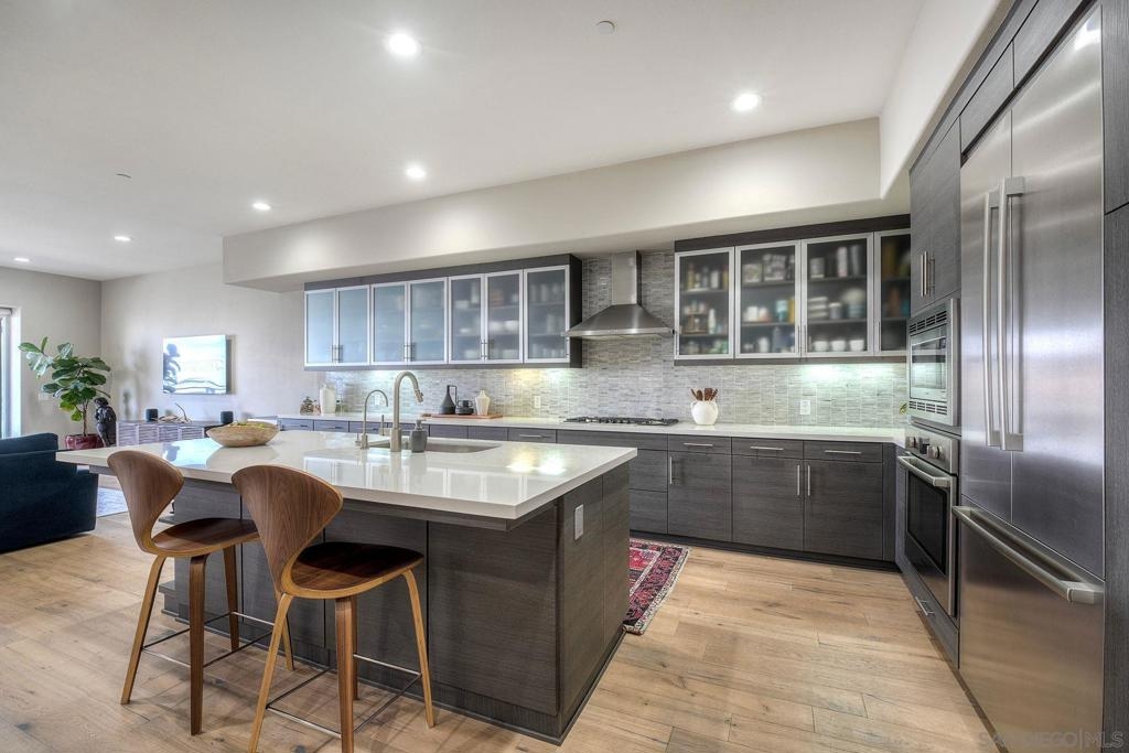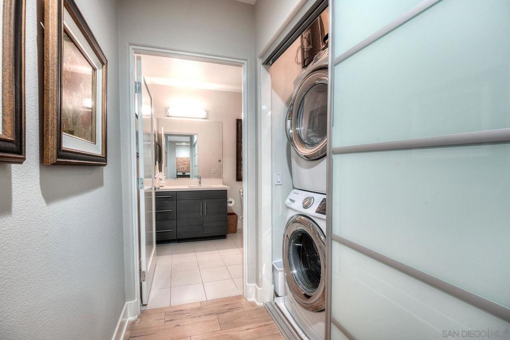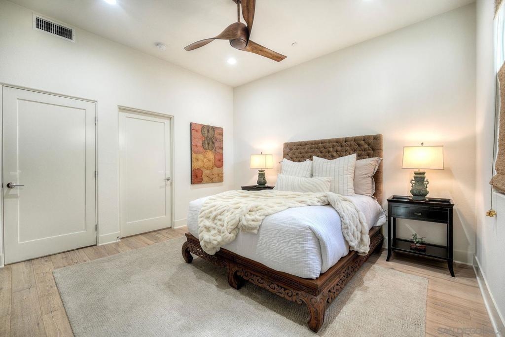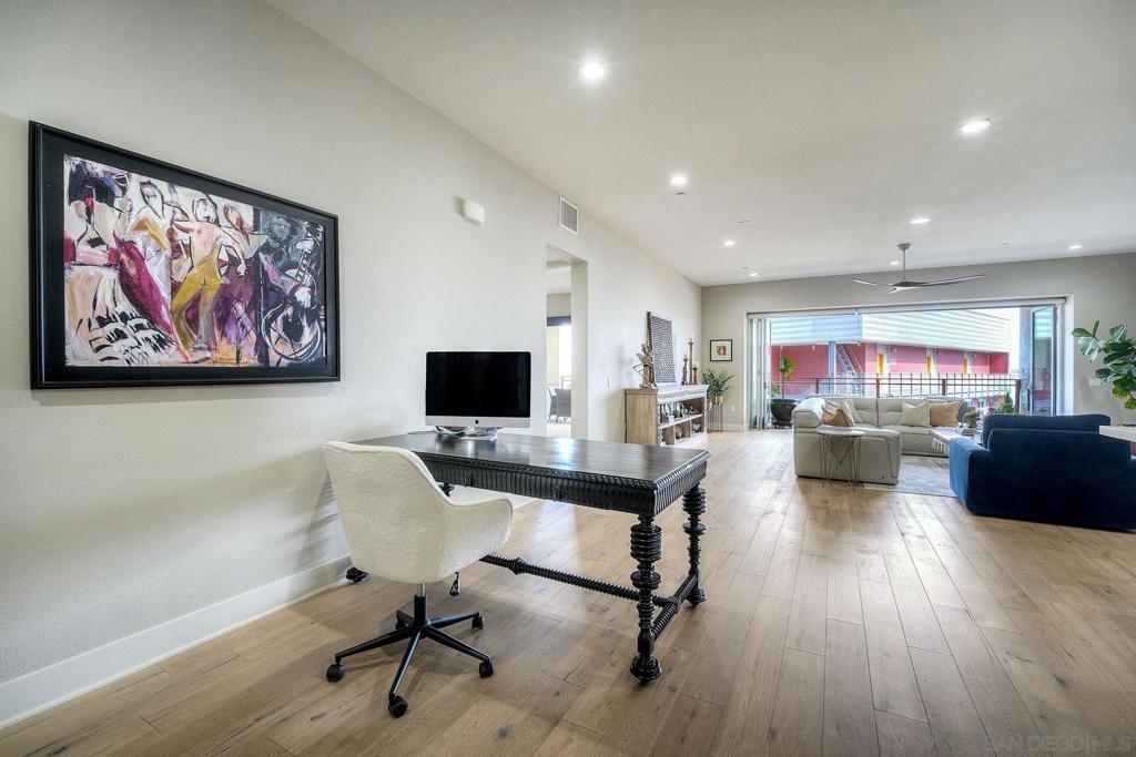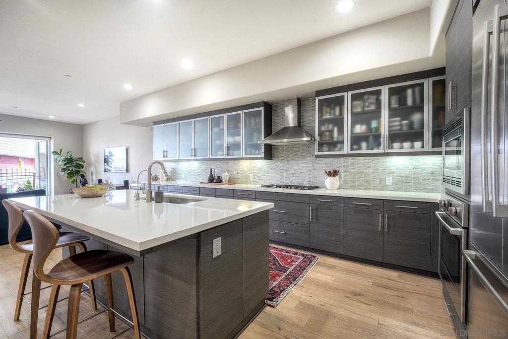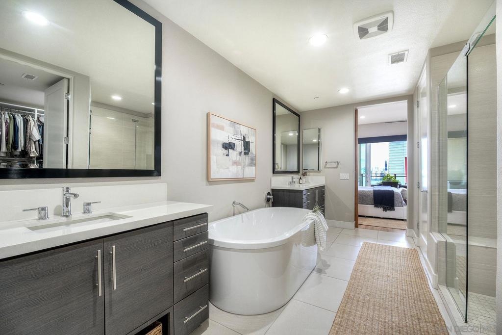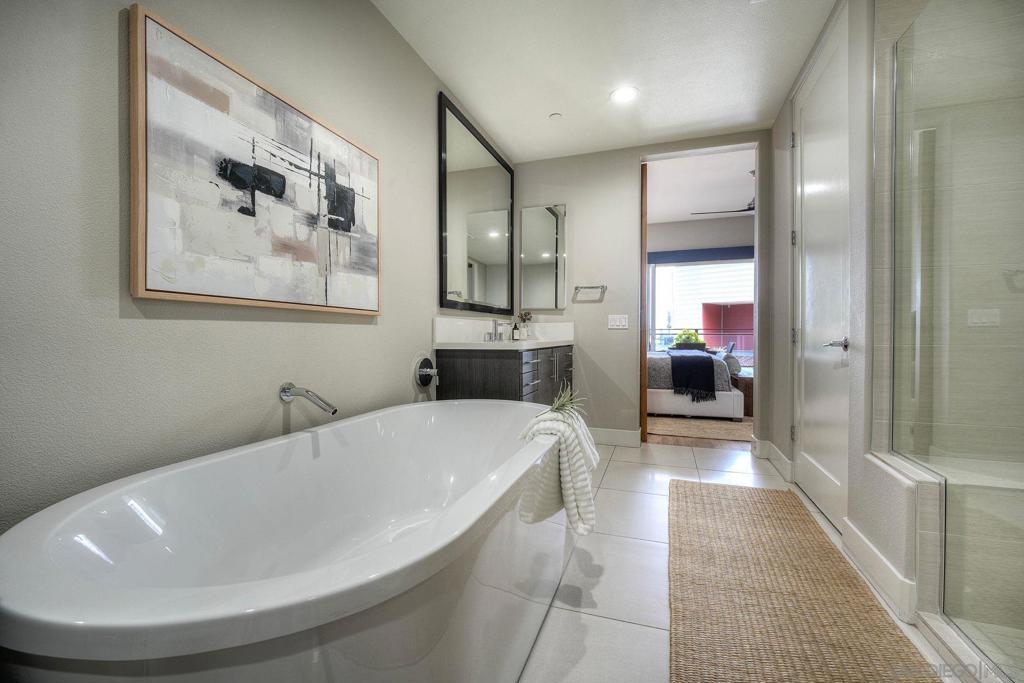 Welcome to Waterpoint, one of Point Loma's most coveted waterfront communities. This exquisite single-level residence offers an expansive 2,214 sq. ft. of refined coastal living space with sweeping views of the downtown SD skyline and bay. Designed for effortless luxury, this home features 10 ft ceilings, 3 full baths, 2 expansive primary-style suites plus a versatile office/den which can easily be converted into a 3rd bedroom. The chef's kitchen showcases European-style cabinetry, Bosch appliances, a wine fridge & generous prep space ideal for entertaining on a grand scale. The open living area flows seamlessly through LaCantina stacking doors to a private outdoor patio complete with a cozy fireplace - the perfect setting to enjoy coastal breezes & the glittering skyline. The primary suite features a spa-inspired bathroom offering a spacious walk-in shower and a floating soaking tub. The dreamy walk-in closet complete with built-ins has plenty of space for all of your luxury items, and you don't want to miss the sliding glass doors leading to your second private patio - perfect for your morning coffee. Thoughtful items and upgrades to note; hardwood flooring throughout, LED recessed lighting fixtures throughout, modern barn doors on primary bathroom and office/den space creating privacy, motorized blackout shades in the primary bedroom, gas stub out on patio for your BBQ, & pull out shelves throughout the kitchen. Waterpoint is conveniently located directly behind numerous waterfront paths leading to restaurants, coffee shops, and multiple docks for our boat lovers. You are also just a few minutes away from the SD Yacht Club, Liberty Station and the SD Airport.