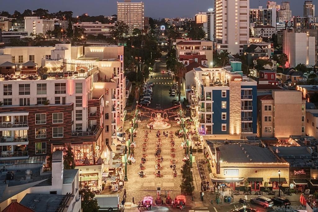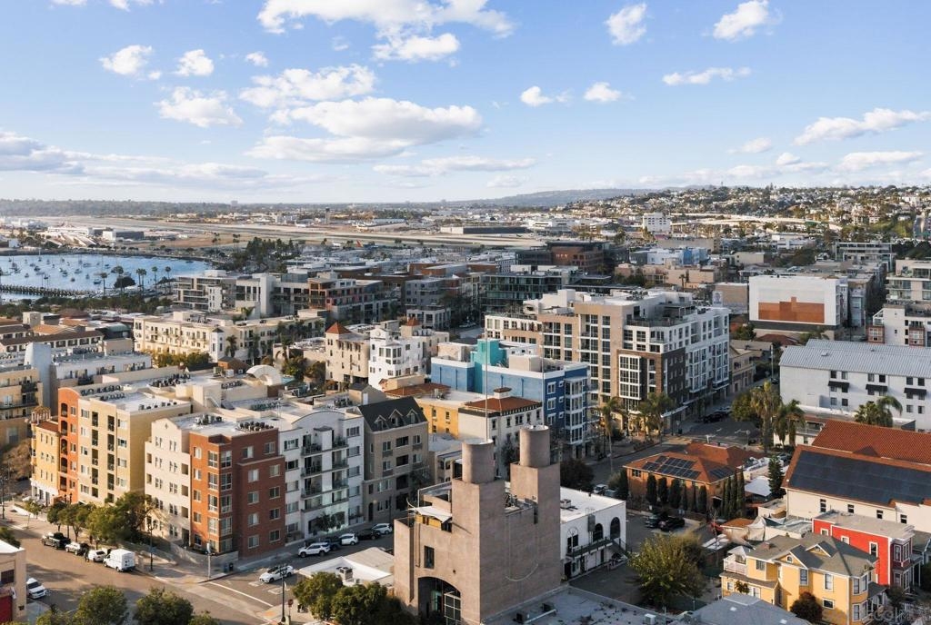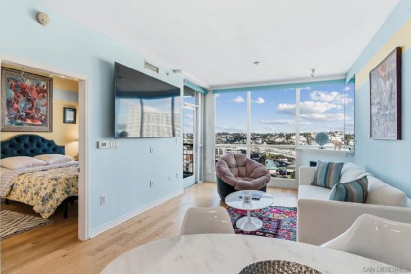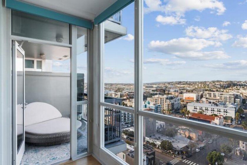 Exceptional one bedroom residence atop of La Vita, in the heart of Little Italy! Expansive floor-to-ceiling windows frame breathtaking panoramic views from the 17th floor, showcasing the bay and waterfront, Little Italy, Balboa Park, and distant mountain vistas. The desirable north-facing orientation fills the residence with natural light while capturing the dynamic cityscape below. Recently remodeled, the home features natural maple engineered hardwood flooring throughout, a stunning backlit translucent quartzite waterfall countertop and an oversized pantry offering exceptional storage. A cozy fireplace anchors the light-filled, glass-enclosed living space, extending to a generous patio perfect for indoor–outdoor enjoyment. Residents of La Vita enjoy resort-style amenities including a heated pool and spa, fitness center, and community room. The award-winning courtyard — affectionately referred to by residents as “Heaven on Earth” — creates a serene oasis in the middle of the city. Courtyard amenities include three separate private barbecue areas, cleaned daily by La Vita staff, offering an impeccably maintained outdoor experience. Perfectly situated in the heart of Little Italy, La Vita offers one of the neighborhood’s most coveted locations — placing you just steps from San Diego’s best dining, cafés, and vibrant street life. Directly across the street sits local favorite Pappalecco, beloved for its authentic Italian espresso, gelato, and lively European atmosphere. La Vita's prime setting delivers the quintessential Little Italy lifestyle right outside your door.