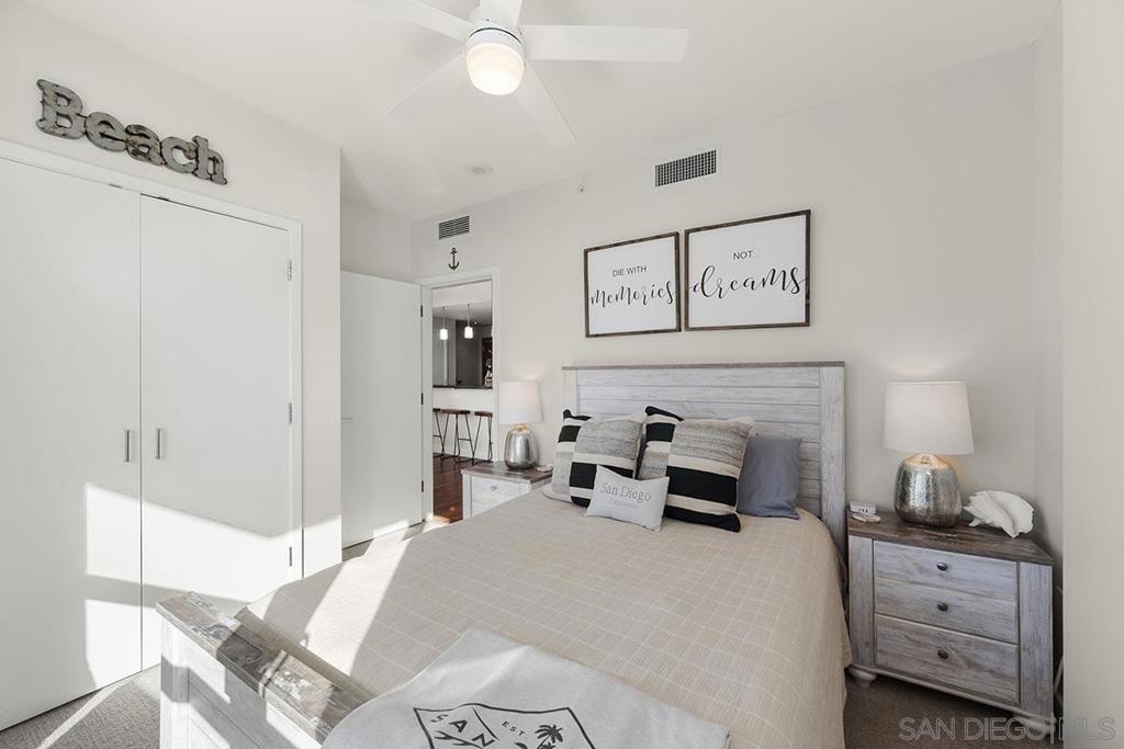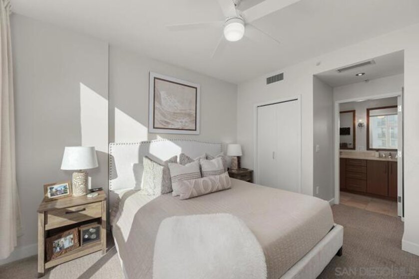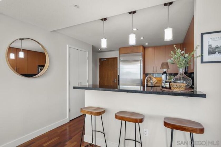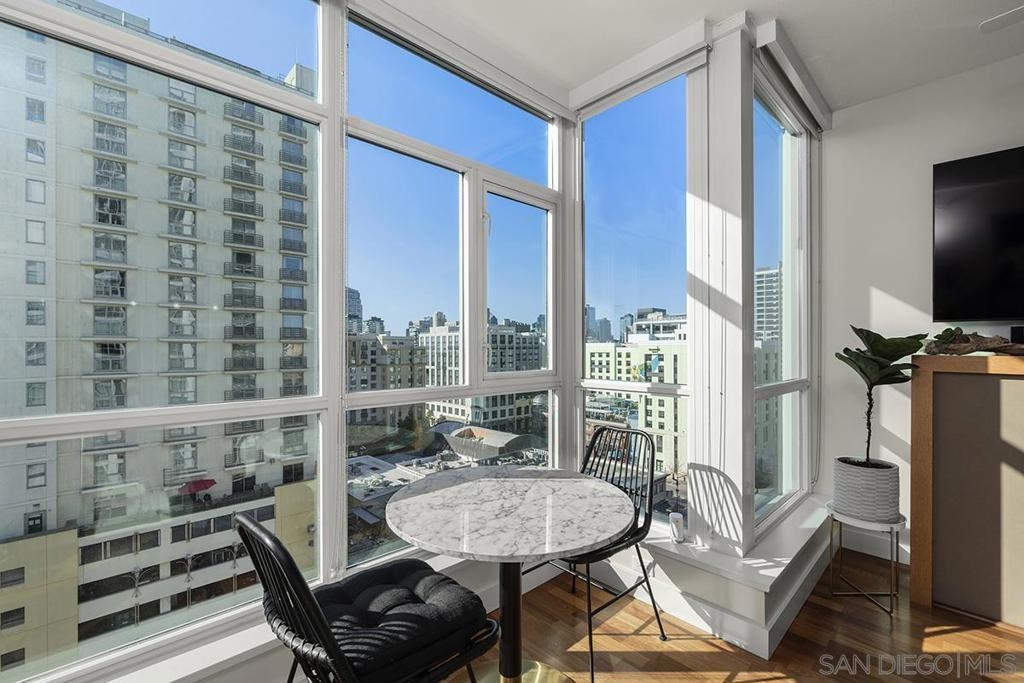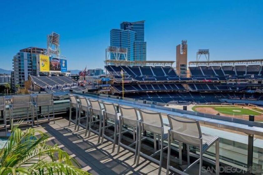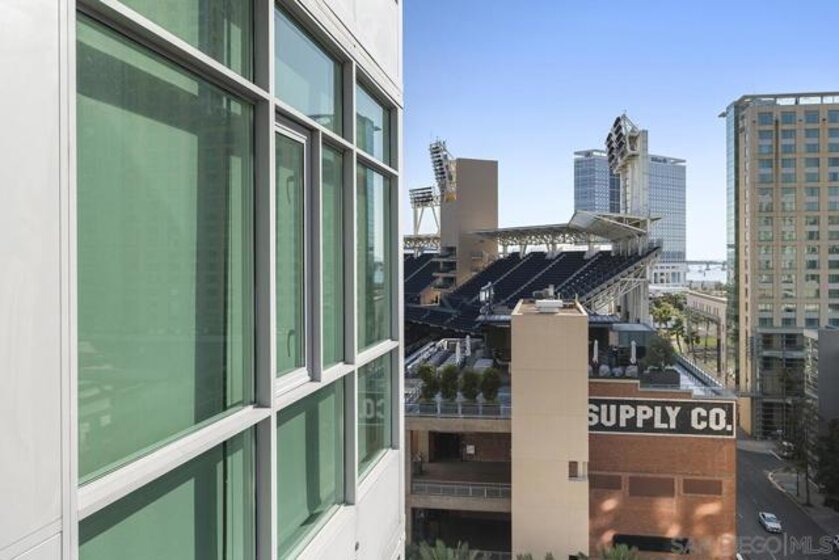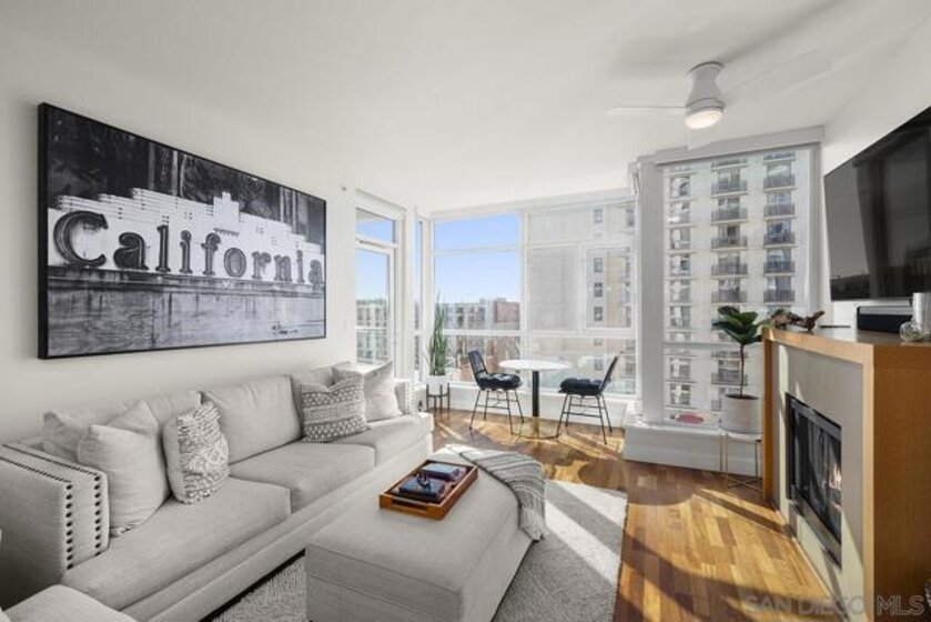 Pride of ownership shines in this impeccably maintained, move-in-ready residence at The Legend. West-facing with peek bay views, the private balcony is the perfect spot to soak in San Diego’s signature sunset skies. Cherry wood floors, an ambient fireplace, and walls of windows flood the home with natural light, while the split floor plan offers ideal privacy. The kitchen features stainless GE Profile appliances, recessed lighting, and a breakfast bar with statement drop lighting. The primary suite includes an ensuite bath with dual vanity and step-in shower. With Petco Park next door, enjoy games and concerts from the iconic 7th-floor Legend Terrace. PLUS secured parking and storage. Live where the energy is and Downtown living truly delivers. The Legend is the only residential high-rise to be built inside the gates of a Major League Ballpark and the only residential tower to be built on the three-acre Park at the Park! This iconic building overlooking the Padres Ballpark will be treasured for generations with historic detailing preserved by Bosa to create a world class residential tower. Centrally located next to the Gaslamp Quarter and Marina District for convenient access to shopping and endless dining options. The Legend’s amenities include a second-floor rooftop deck looking out over Petco Park complete with pool and spa, a fully equipped fitness room, roof garden, barbeque area, steam, sauna and changing rooms. Your guests and clients will love 'Club Legend' located on the seventh floor, complete with a huge roof deck overlooking Petco Park and an outdoor fireplace lounge fully-equipped with indoor and outdoor kitchen and BBQ. An elegant courtyard entrance, creating a private enclave approaching the lobby provides a fitting and impressive sense of arrival for residents and their guests. The concierge service and 24-hour security add a sense of belonging while an ambiance of refinement and contemporary sophistication is apparent throughout the building.