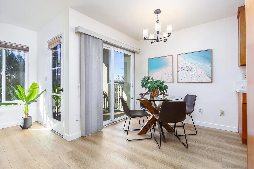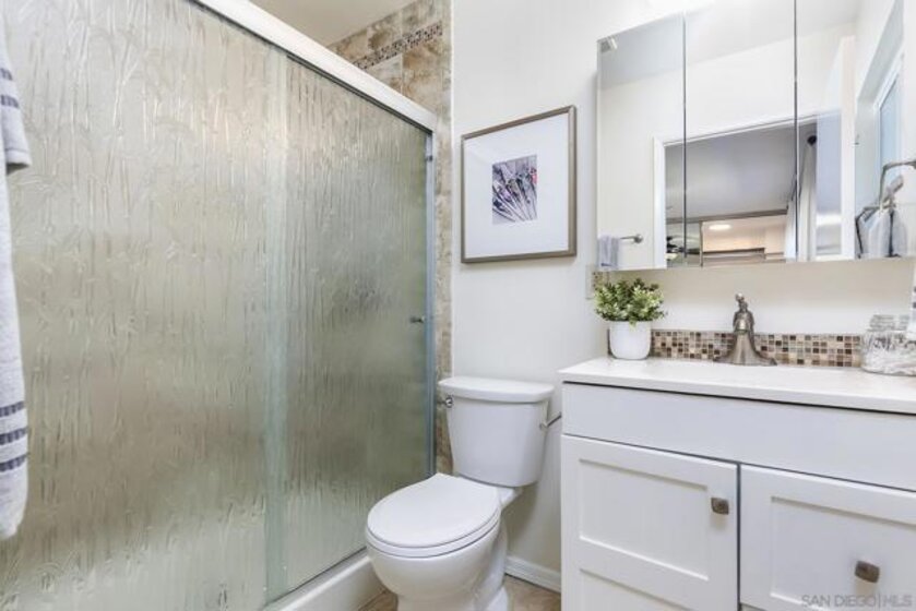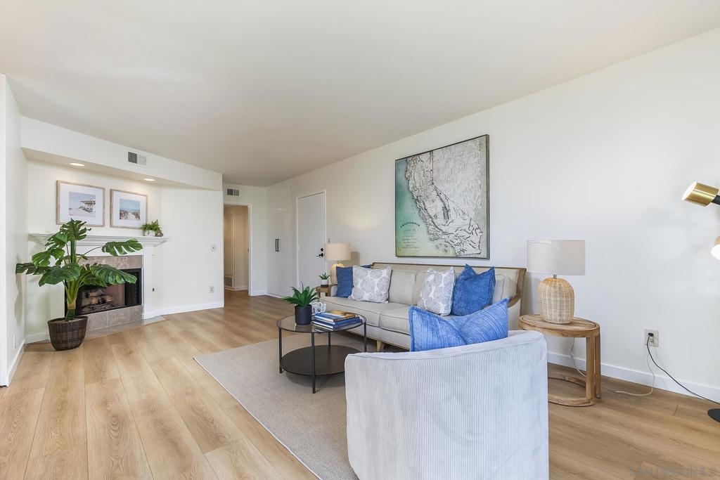 Welcome to 3888 Groton Street #3! This rare single-level end unit with 2-bedroom, 2-bath condo offers 1,018 sq. ft. of comfortable, thoughtfully updated living space. Freshly painted with updated flooring throughout, it’s move-in ready and filled with natural light. The open living area features a cozy fireplace, perfect for relaxing or entertaining—while the well-appointed kitchen with new appliances is ideal for both everyday cooking and hosting. The primary suite includes a private ensuite bath and a spacious walk-in closet, and the spacious second bedroom is directly across from the hall bath, great for guests or a home office. Enjoy morning coffee or evening relaxation on your private balcony. An in-unit washer and dryer add everyday convenience. 2 parking spaces! Upgraded electrical. Community amenities include a sparkling pool, spa, clubhouse, and covered carport parking. Ideally located just steps from Barron’s Market and close to shopping and dining, this home offers the perfect blend of comfort and convenience in the heart of Point Loma.