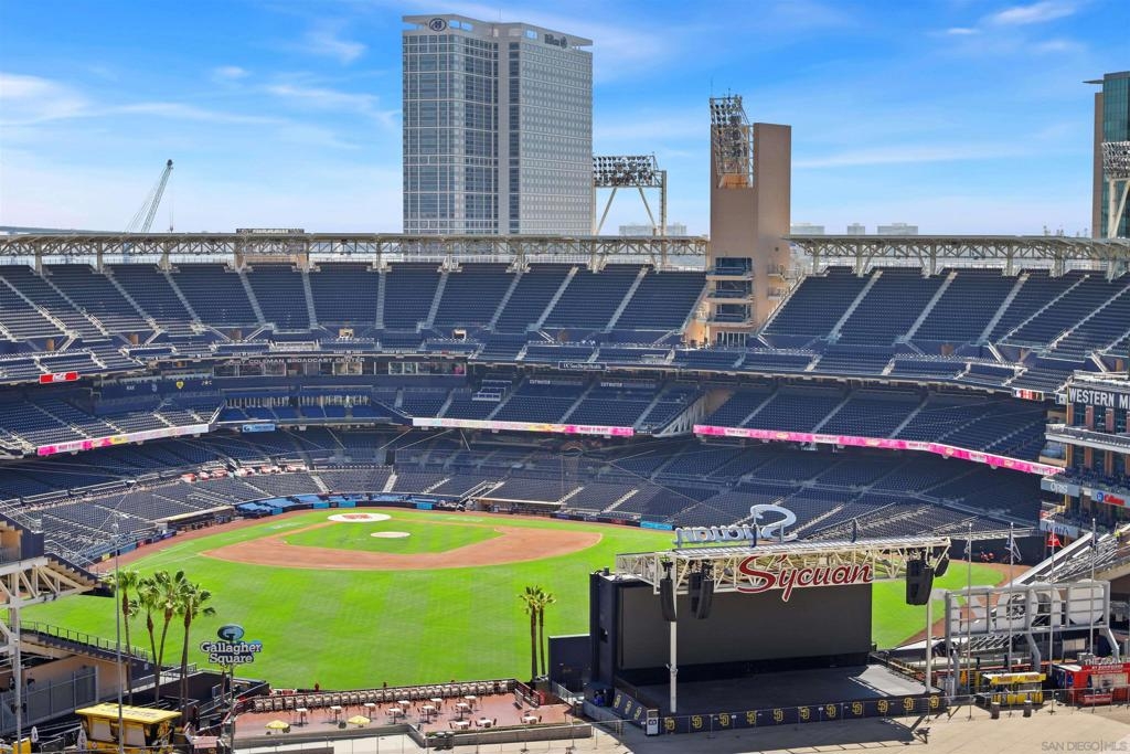 With a clear bird’s eye view into Petco Park, you might never want to leave home—enjoy FREE PADRES’ HOME GAMES, FREE CONCERTS, and FREE EVENTS right from your private 12th-floor balcony and living room. Take in stunning sunsets and panoramic sights of the city and Bay while you relax in comfort. Diamond Terrace features resort-style amenities and a prime Downtown location, so you can easily walk to everything that makes San Diego amazing—no driving necessary! Take in the energy of the city from the premium, covered community entertainment deck, or retreat indoors to peaceful serenity thanks to thick, noise-resistant floor-to-ceiling windows that fill your home with natural light. The open, flowing layout is beautifully finished with sleek laminate flooring throughout. The upgraded kitchen features quartz countertops, shaker cabinetry, and a bonus pantry for extra storage. Blackout shades in the bedroom provide restful sleep, while the spa-inspired bathroom includes a luxurious step-in shower with custom tile detailing. Enjoy the convenience of an in-unit laundry closet and an assigned parking space that makes parking effortless. Situated in the vibrant East Village, you're just steps from bars, restaurants, shops, entertainment, parks, dog areas, and the waterfront. Diamond Terrace boasts a stylish lobby, top-floor community room, fitness center, and an outdoor lounge deck with BBQs—perfect for catching events at Petco Park. With quick access to the 5, 163, and 94 freeways, this home is a true gem!
