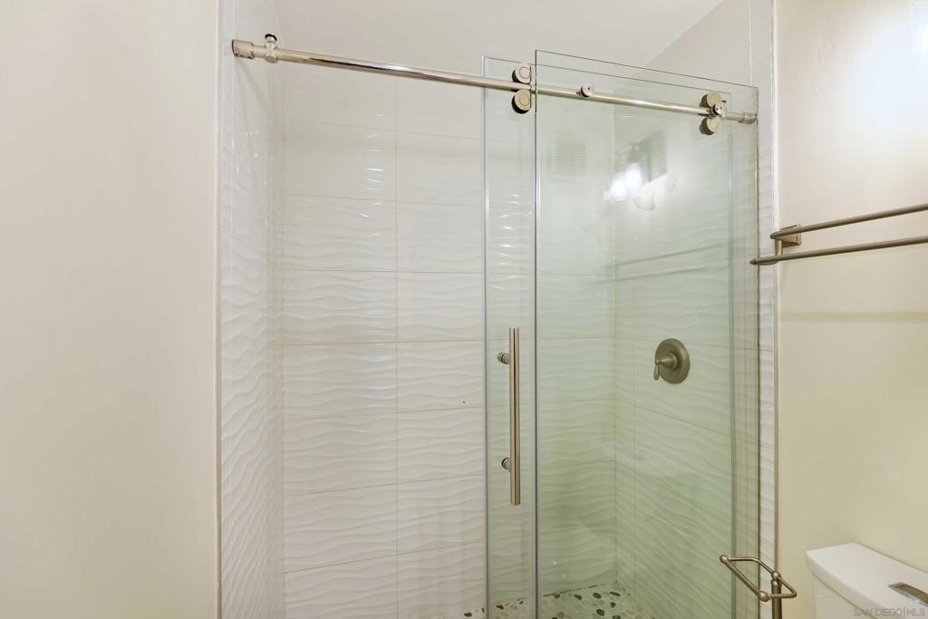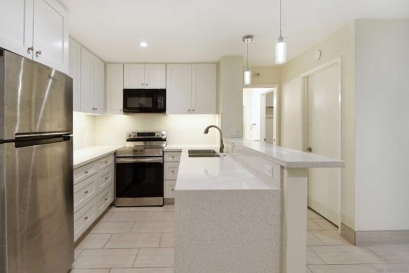 Step into your newly renovated, first floor, end unit in the heart of Pacific Beach. This home has been freshly painted and recently remodeled, with neutral grey tiled floors, newer canned lighting, and large windows to brighten up your living space. The open concept design, features, remodeled kitchen with stainless steel appliances, white cabinets, self closing drawers and a large sink. Newer sliding glass doors lead out to your private patio with tile flooring, overlooking trees and greenery. Dual entrances to the bedroom, with 2 separate closets. Perfectly positioned toward the end of its hallway for privacy and close proximity to the tennis courts, pool, and designated parking. The resort-like community features numerous pools and spas, a sauna, an athletic facility, and tennis courts, plus game rooms and lounges. Conveniently located just steps from the nearby grocery stores, and restaurants, and just down the road from some of San Diego's most famous beaches and parks. On-site management and security. New split system air conditioning and heat in living and bedroom.