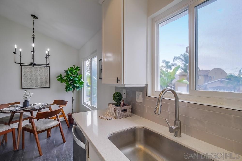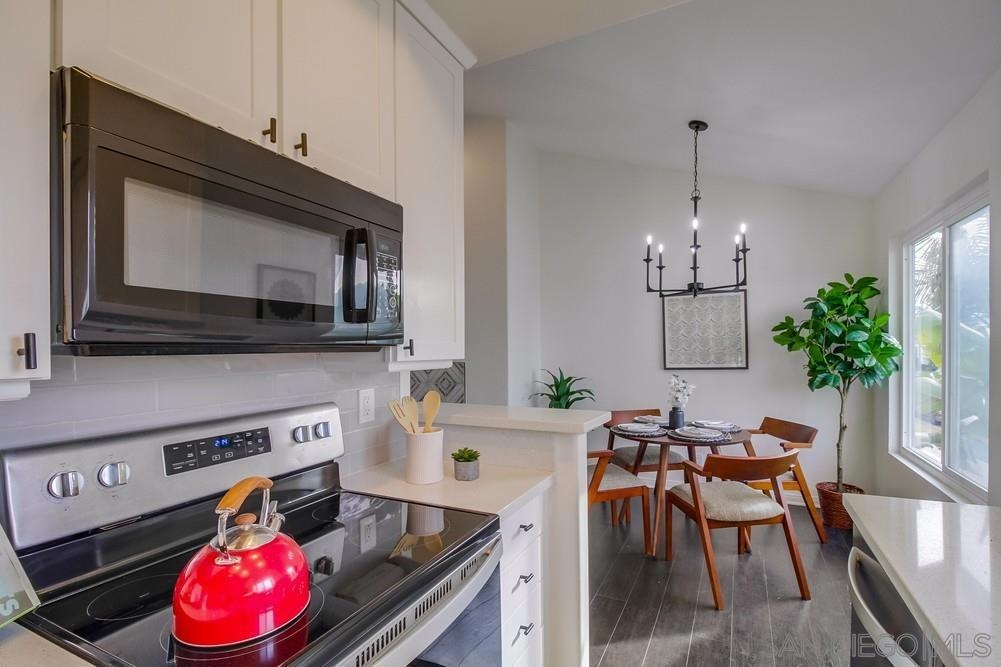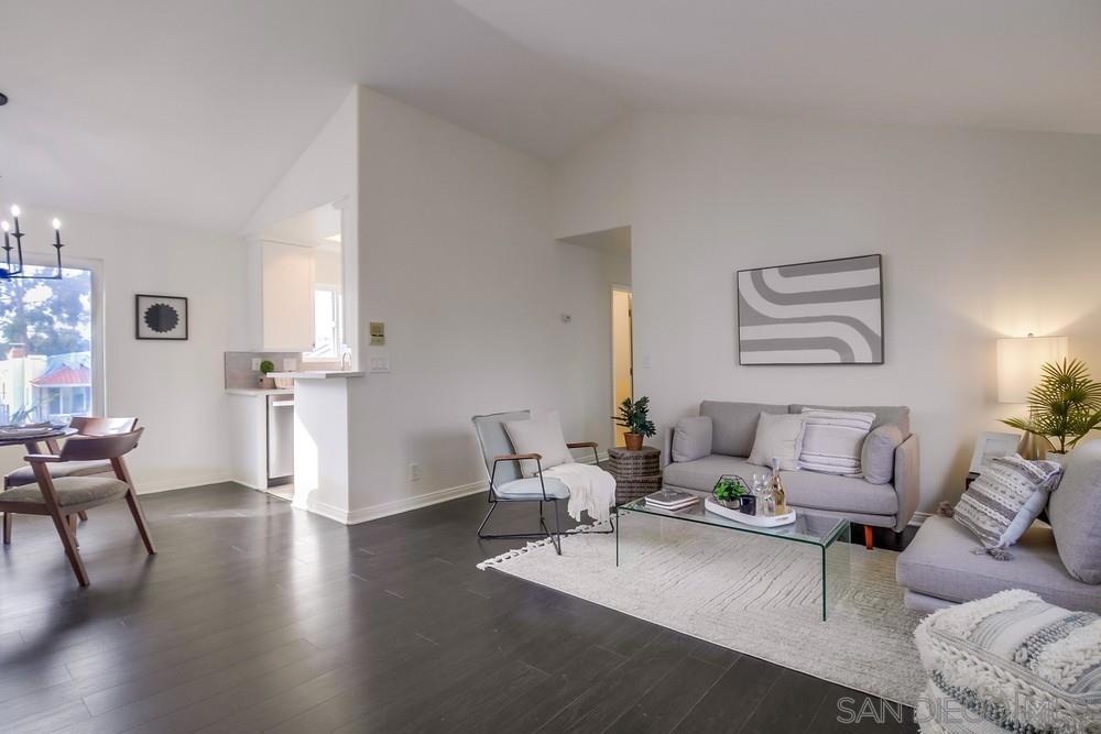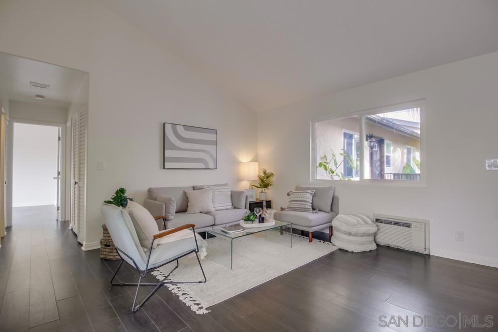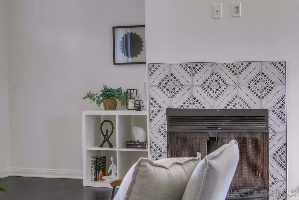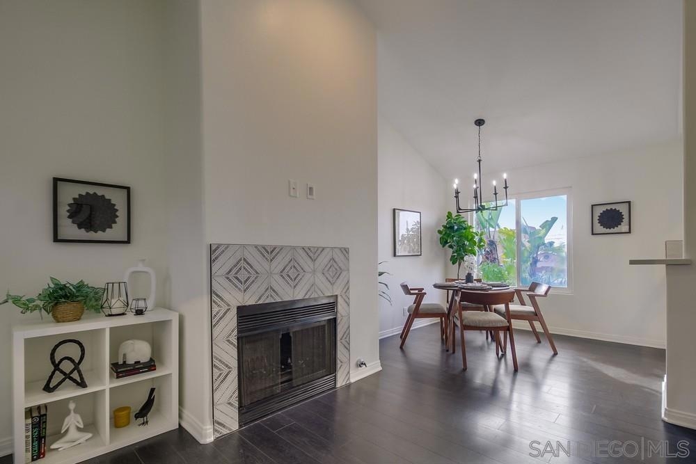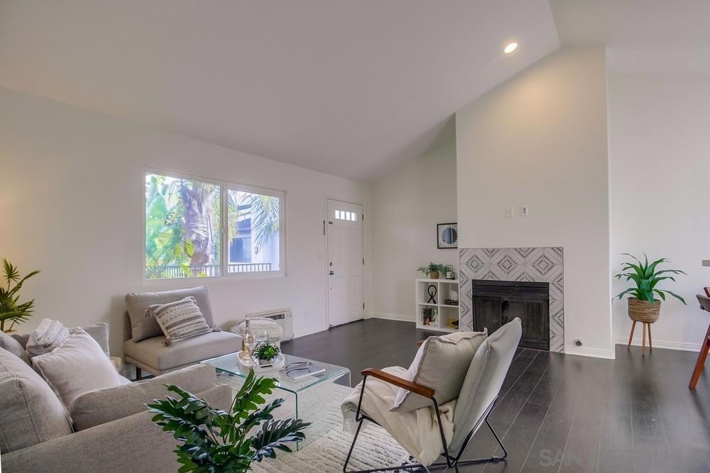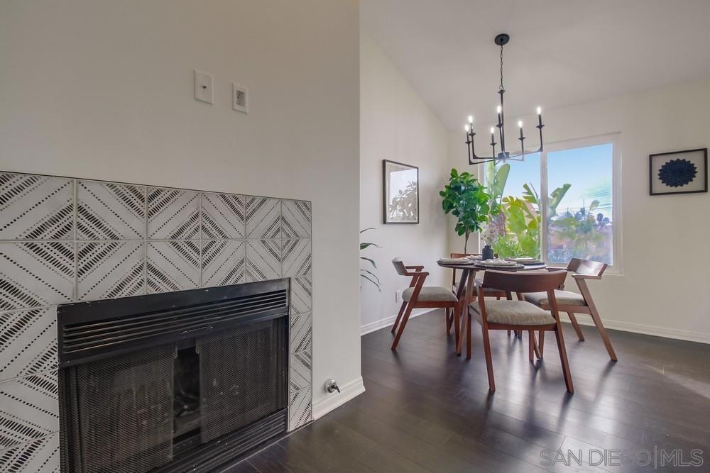 GORGEOUS RENOVATED 2bd/2ba condo in walkable Normal Heights! Newly painted with Walnut LVP floors and pitched ceilings throughout. STUNNING kitchen with quartz counters, new Artisan Mist tile backsplash, single basin sink with pulldown faucet, new matte black t-bar knobs, stainless steel appliances, and recessed lighting. New farmhouse chandelier at dining area and new bohemian tile surround at fireplace. Primary bedroom with new door, dual closets, balcony. Enjoy new weathered tan vanities with quartz... counters in both bathrooms and a tiled shower in the en suite primary bathroom. Ceiling fans in both bedrooms, new window screens, and new window at dining area. 2 assigned tandem parking spots. Unbeatable location on a quiet street within a short walking distance of coffee shops, eateries, bars, theatre and more!