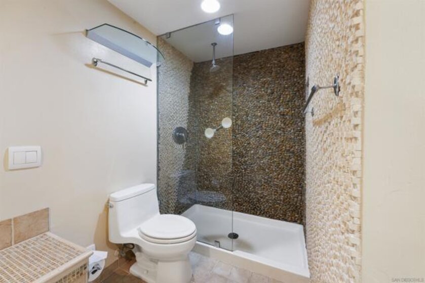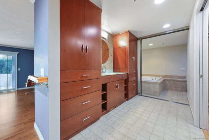 Don't miss this rare opportunity to own a private ground floor corner unit that is also the largest 3 bedroom floorplan at Presidio Place. This gorgeous home has abundant light from all of the windows, a beautiful open floorplan with upgraded kitchen - including a double oven and granite countertops! Pergola flooring throughout this home leads you through a dining room and large family room with sliding doors to a wrap around patio and even a lawn! In the family room you'll find a beautiful wet bar and fireplace. As you make your way down the hall you'll find updated hall bathroom and bedrooms with built in closet organizers. At the end of the hall you'll find the spectacular primary suite. Stunning wood cabinets and large walk in closet with built in organizers boast an abundance of storage. The updated primary bathroom make this a spa experience with a soaking tub and custom tiled separate walk-in shower. This home also comes with 2 assigned parking spots directly across from the elevator and is located steps across from the elevator on the 1st floor.....All of this in the heart of San Diego minutes away from dining, entertainment, shopping, beaches and even the airport. Presidio Place boasts 24/7 security with guard on-site, a heated pool you can use year-round and discount membership to state of the art gym at the YMCA (Did someone say Pickleball??). Also included in the HOA fee is your gas, water, trash, and sewage. This truly is a rare opportunity to live near everything but be in your own your quiet private oasis.