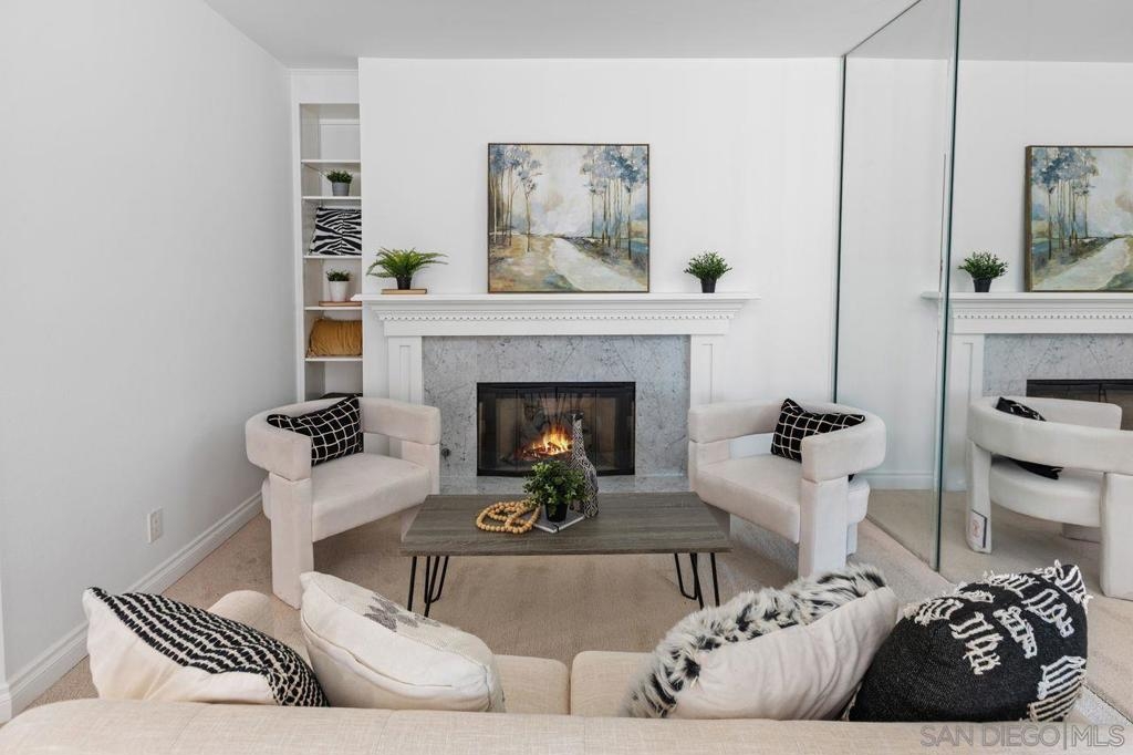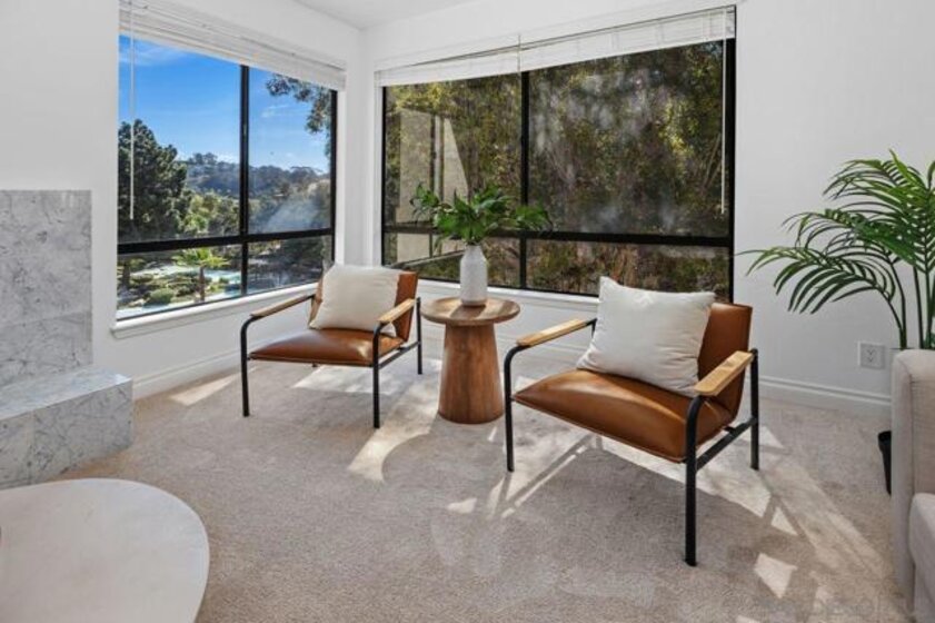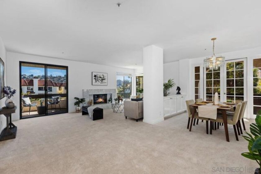 Welcome to the highly sought after gated community of The Courtyards in Mission Valley, where space, style, and serenity come together in one exceptional top floor corner residence. This rarely available 3 bedroom, 2 bath home offers an expansive 1,969 square feet of beautifully remodeled living space, filled with natural light and designed for both everyday comfort and entertaining. As a desirable top floor corner unit, you’ll enjoy added privacy along with three private balconies that invite in the breezes and allow the enjoyment of the gorgeous views. As a desirable top floor corner unit, you’ll enjoy added privacy along with three private balconies that invite in the breezes and allow the enjoyment of the gorgeous views. The floor plan is generous and thoughtfully designed, featuring a large living room with fireplace, a formal dining room for special gatherings, and a stunning, remodeled kitchen complete with breakfast nook. The finishes throughout are modern yet timeless; neutral tones, updated flooring, designer paint, and tastefully renovated bathrooms create a cohesive, move-in ready home that feels both elegant and welcoming. The primary suite is truly a retreat of its own, offering a spacious bedroom with a balcony plus an oversized sitting area with a custom fireplace, the perfect place to unwind at the end of the day. Two additional bedrooms provide flexibility for guests, office space, or whatever suits your lifestyle. In unit laundry adds everyday convenience. Residents of The Courtyards enjoy resort style amenities including peaceful walking paths around a tranquil pond, sparkling pools, tennis court, a clubhouse/meeting room, library, and beautifully maintained grounds. All of this just moments from upscale shopping, dining, banking, and every service you could need. Immaculate, extensively remodeled, and truly turnkey, this is elevated Mission Valley living at its finest! Please note: Fireplaces flame has been digitally staged.