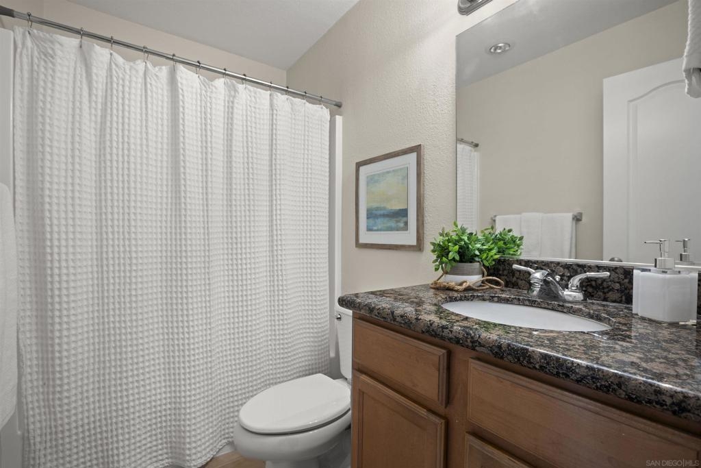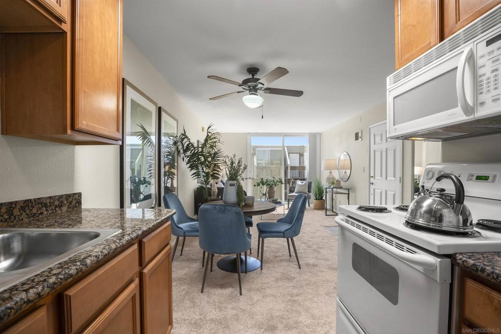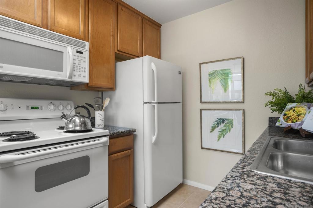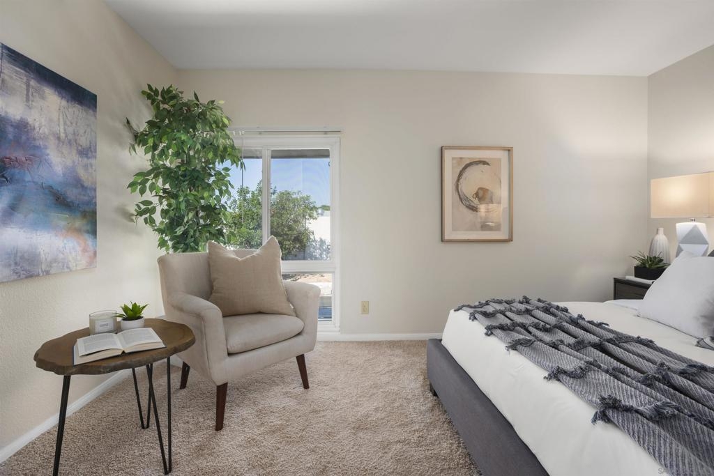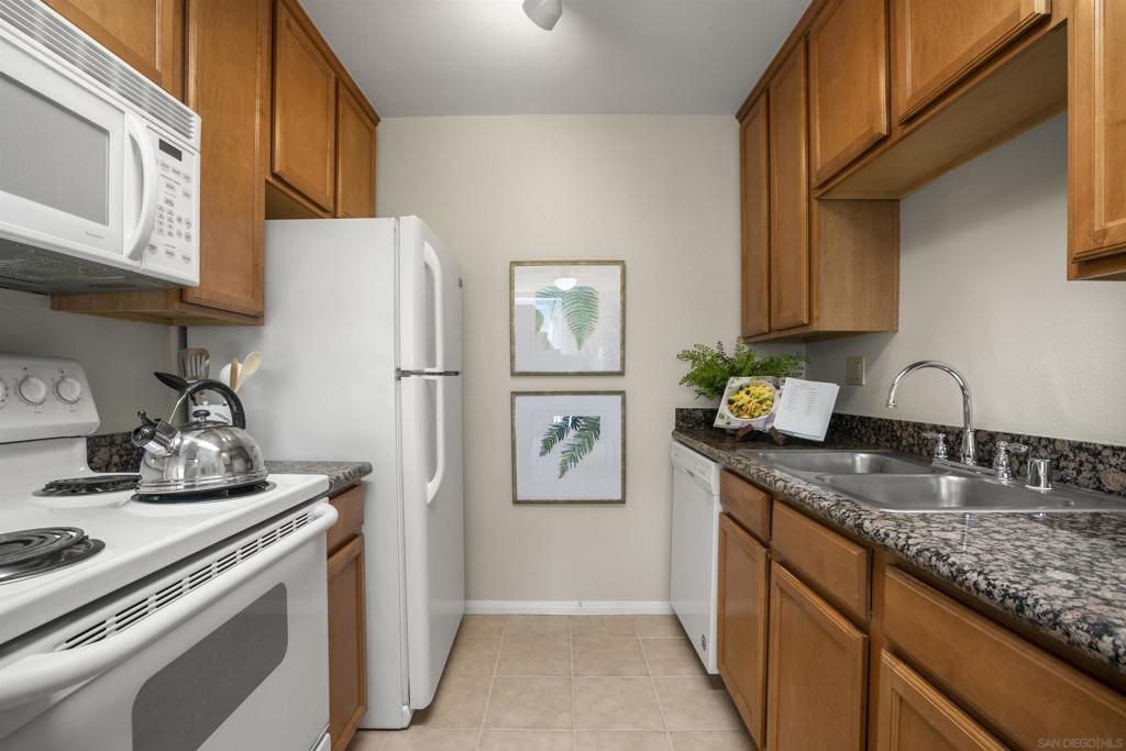 Light, bright & airy! This terrific top floor unit is located in the heart of Clairemont close to shopping, schools & just a short drive to the beach. The unit features a wonderful open concept layout, vinyl windows, fresh paint & new carpet. The kitchen boasts maple cabinets with granite counter tops. Tons of natural light streams into the unit from both the newer skylight above the kitchen & the large vinyl slider that leads to the balcony. The complex has a well maintained exercise room & a terrific pool. Welcome home!