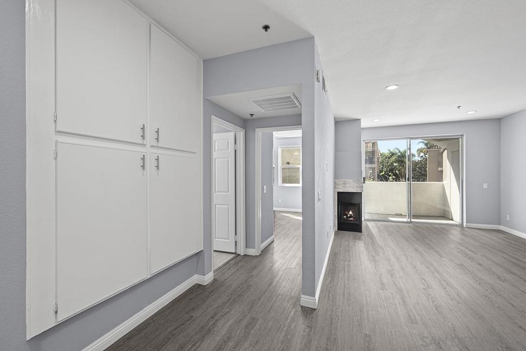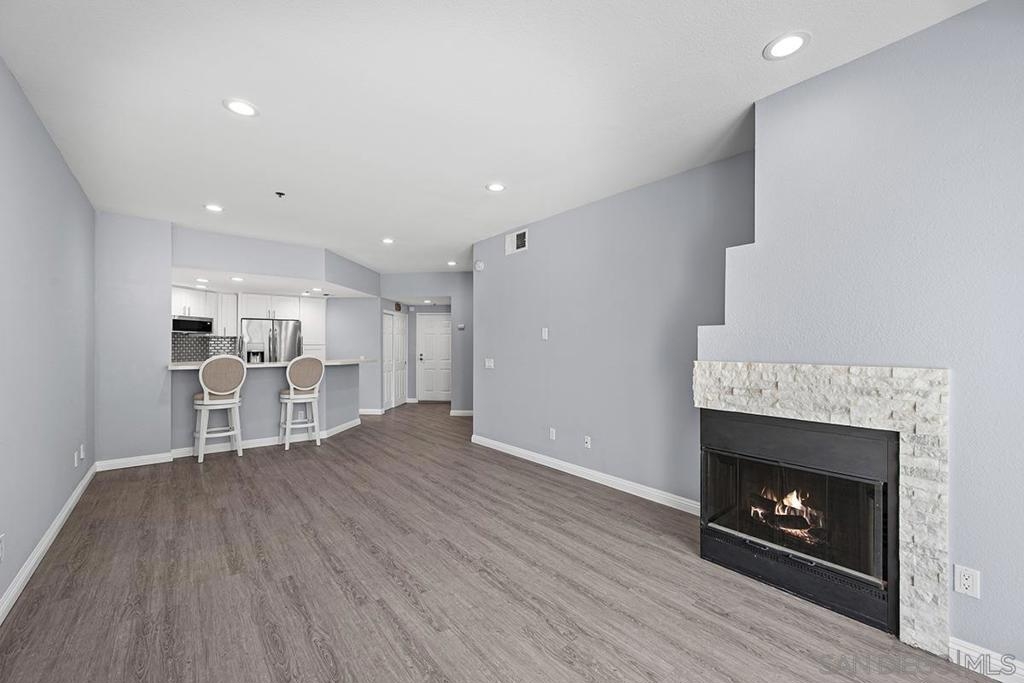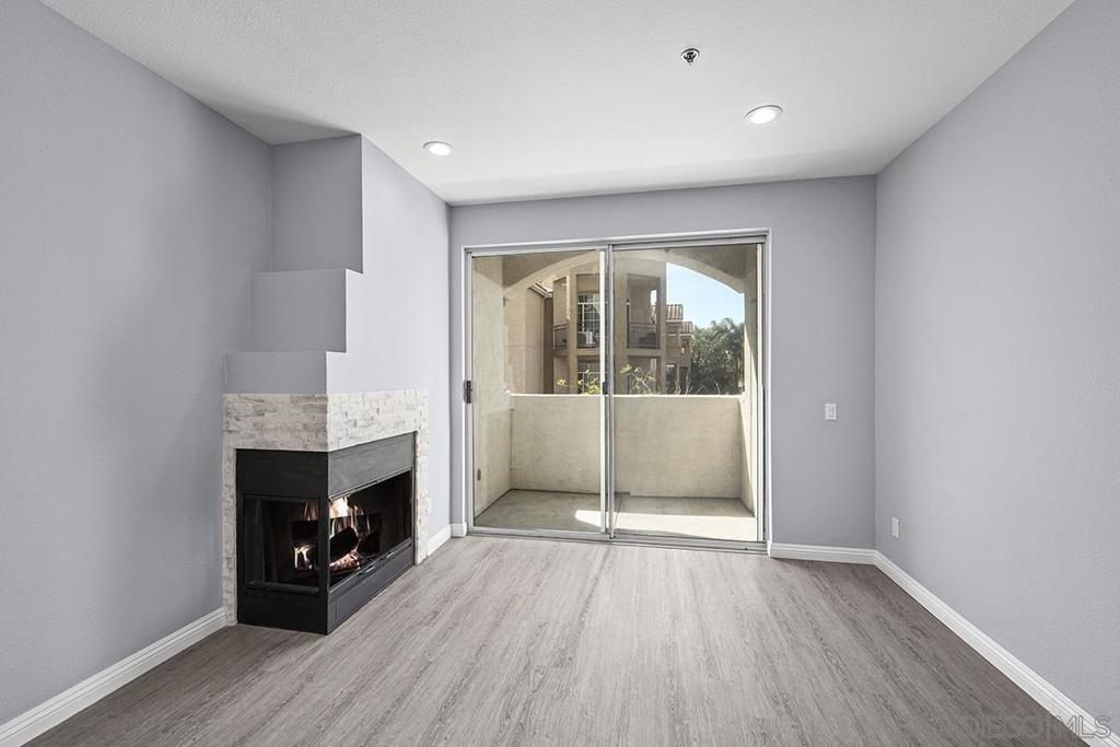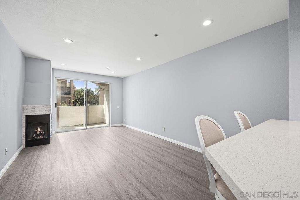 This stylishly renovated condo at Rio del Oro offers modern living in the heart of Mission Valley. Step inside to find a bright, contemporary interior featuring luxury vinyl plank flooring, crisp white cabinetry, and gleaming white quartz countertops throughout the kitchen and bath. The kitchen is equipped with stainless appliances, custom glass tile backsplash, and a convenient eat-at bar, perfect for casual dining and entertaining. The living space is warmed by a fireplace featuring a modern stacked stone façade, and abundant recessed LED lighting, creating an inviting ambiance day and night. Step out onto your private west-facing balcony with additional storage ideal for enjoying San Diego's stunning sunsets. The bedroom is a true retreat, complete with blackout shades and a spacious walk-in closet. The bathroom features a soaker tub, updated white quartz counters, and modern finishes. An in-unit washer and dryer adds everyday convenience. This home combines stylish upgrades with an unbeatable Mission Valley location with guest parking that is near shopping, dining, freeways, and transit. Don't miss this one! Rio Del Oro is a highly sought-after community nestled alongside the scenic walking and biking trails of the San Diego River and offers guest parking. Residents enjoy resort-style amenities including a pool and spa, fitness center, lush park-like common areas, and a private community room. The location is unbeatable: just steps from Fashion Valley Mall's premier shopping and dining, movie theatres, and the San Diego Trolley. Everyday conveniences are right at your doorstep with Mission Valley West just a short walk away, home to Trader Joe's, King's Fish House, Shake Shack, Lazy Dog, and much more. This is Mission Valley living at its finest.