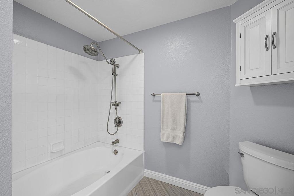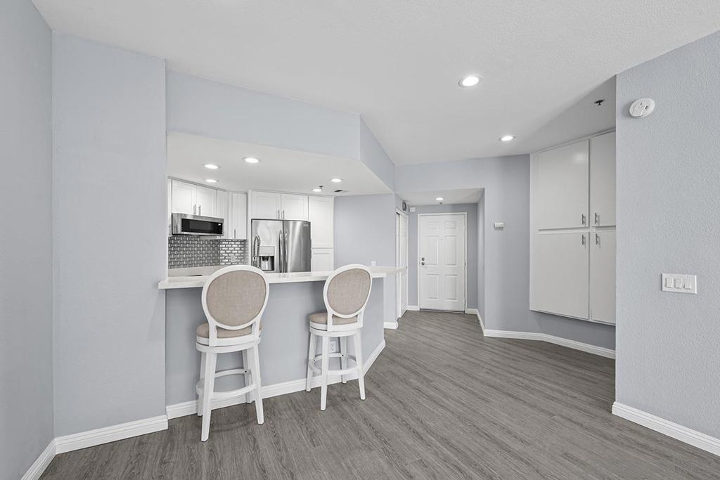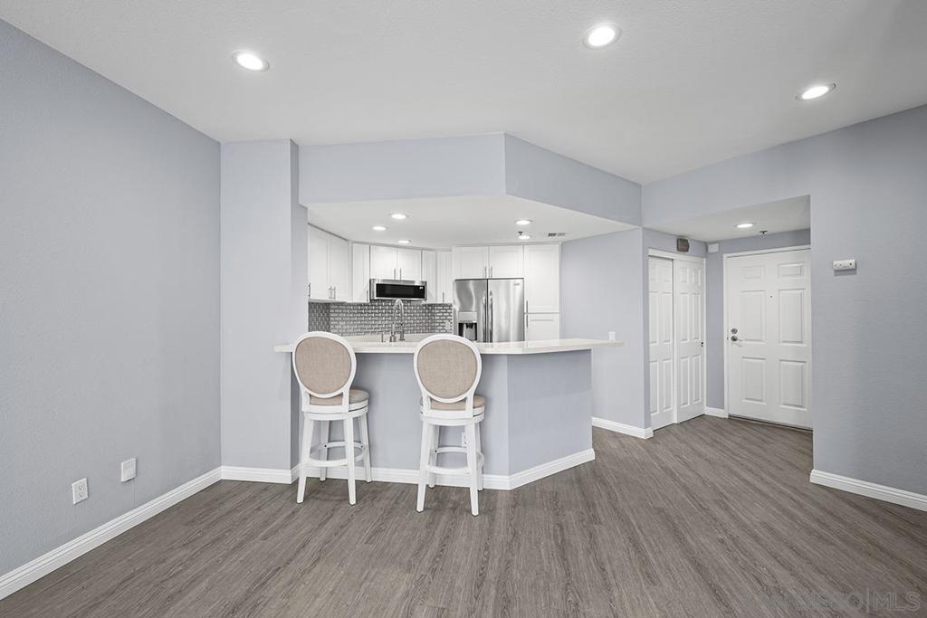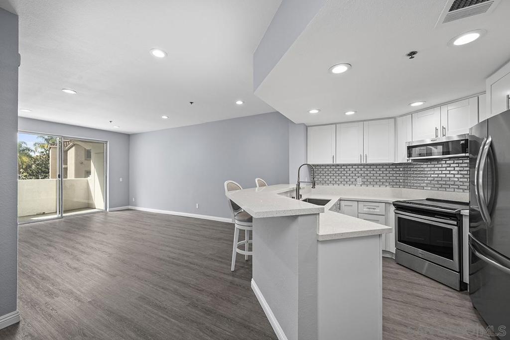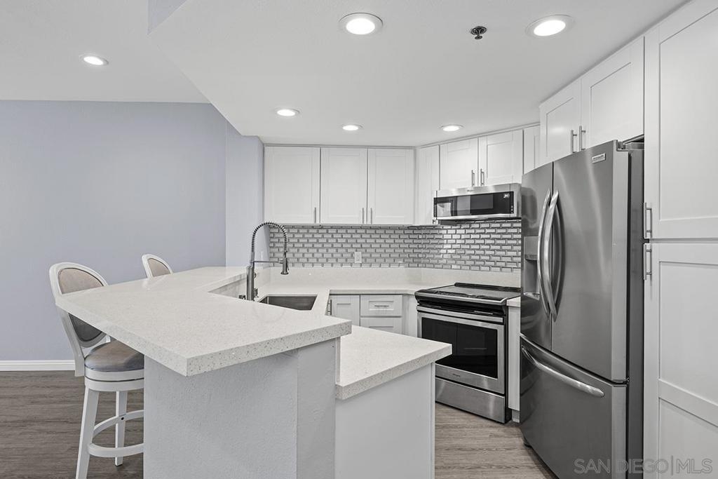 This stylishly renovated condo at Rio del Oro offers modern living in the heart of Mission Valley. Step inside to find a bright, contemporary interior featuring luxury vinyl plank flooring, crisp white cabinetry, and gleaming white quartz countertops throughout the kitchen and bath. The kitchen is equipped with stainless appliances, custom glass tile backsplash, and a convenient eat-at bar, perfect for casual dining and entertaining. The living space is warmed by a fireplace featuring a modern stacked stone façade, and abundant recessed LED lighting, creating an inviting ambiance day and night. Step out onto your private west-facing balcony with additional storage ideal for enjoying San Diego's stunning sunsets. The bedroom is a true retreat, complete with blackout shades and a spacious walk-in closet. The bathroom features a soaker tub, updated white quartz counters, and modern finishes. An in-unit washer and dryer adds everyday convenience. This home combines stylish upgrades with an unbeatable Mission Valley location with guest parking that is near shopping, dining, freeways, and transit. Don't miss this one! Rio Del Oro is a highly sought-after community nestled alongside the scenic walking and biking trails of the San Diego River and offers guest parking. Residents enjoy resort-style amenities including a pool and spa, fitness center, lush park-like common areas, and a private community room. The location is unbeatable: just steps from Fashion Valley Mall's premier shopping and dining, movie theatres, and the San Diego Trolley. Everyday conveniences are right at your doorstep with Mission Valley West just a short walk away, home to Trader Joe's, King's Fish House, Shake Shack, Lazy Dog, and much more. This is Mission Valley living at its finest.