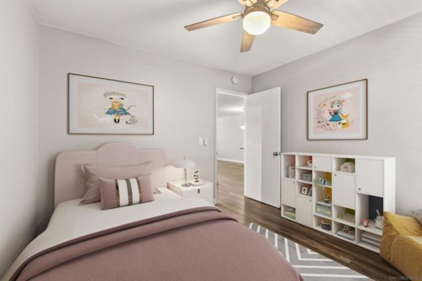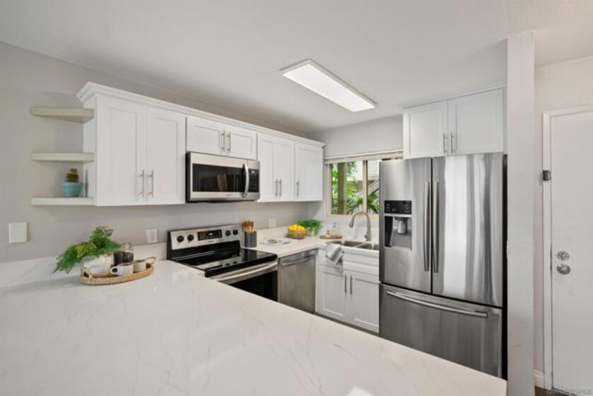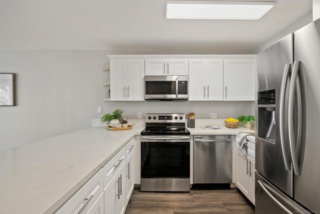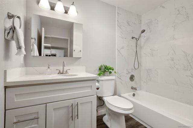 Step into a beautifully remodeled 2-bedroom, 1-bath condo that perfectly blends modern style with everyday comfort. Perched above the greens of Admiral baker Golf Club, this home offers panoramic golf course views from your living room and your private balcony—an ideal spot for morning coffee or evening relaxation. Inside, thoughtful upgrades elevate the living experience, including new flooring, custom kitchen cabinetry, elegant quartz countertops, and a sleek, spa-like bathroom featuring a Carrara-style tub and vanity. Located in the gated community of Valley meadows North, residents enjoy desirable amenities such as a spa, exercise room, and laundry facilities. Just minutes from SDSU, Mission Valley, shopping, restaurants, and San Diego’s iconic beaches, this property puts you right at the heart of it all.