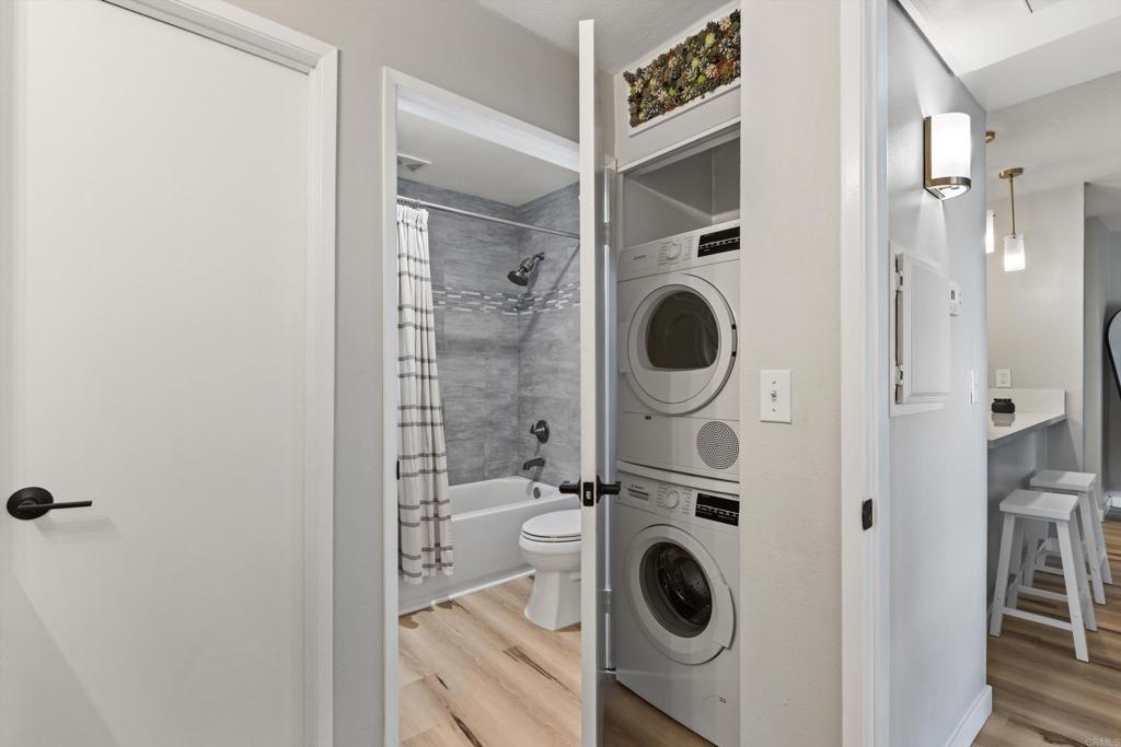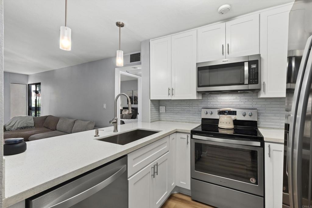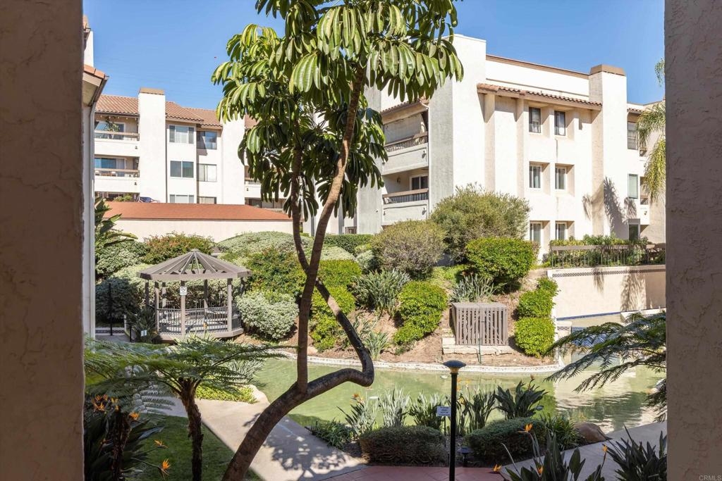 Welcome home to this beautifully remodeled 1-bedroom, 1-bath condo offering 644 square feet of stylish, low-maintenance living in the heart of Mission Valley. Perfect for a first-time home buyer, this well-located unit features peaceful views of the interior courtyard with a lovely pond and gazebo and is tucked away in a quiet area of the complex—away from nearby construction and Friars Road. The remodeled interior showcases luxury vinyl plank flooring, a cozy gas fireplace, and an updated kitchen with quartz countertops. The bathroom features tile in the shower, while the bedroom includes a walk-in closet for generous storage. An additional storage closet in the hallway near the kitchen adds even more everyday convenience. The AC unit was replaced in 2018, providing efficient, year-round comfort. This home includes two parking spaces and two separate storage areas, with all appliances conveying including the washer and dryer, making it truly move-in ready. Enjoy resort-style community amenities including an oversized pool, spa, exercise room, and sauna. The HOA covers cable, Wi-Fi, water and trash, helping keep monthly expenses predictable and stress-free—an ideal setup for first-time buyers. Located just steps from Fashion Valley Mall, with easy access to shopping, dining, transit, and major freeways, this condo offers an unbeatable combination of location, comfort, and value. A rare opportunity to stop renting and start building equity in one of San Diego’s most desirable neighborhoods. Call today to see this great home! VA approved complex.