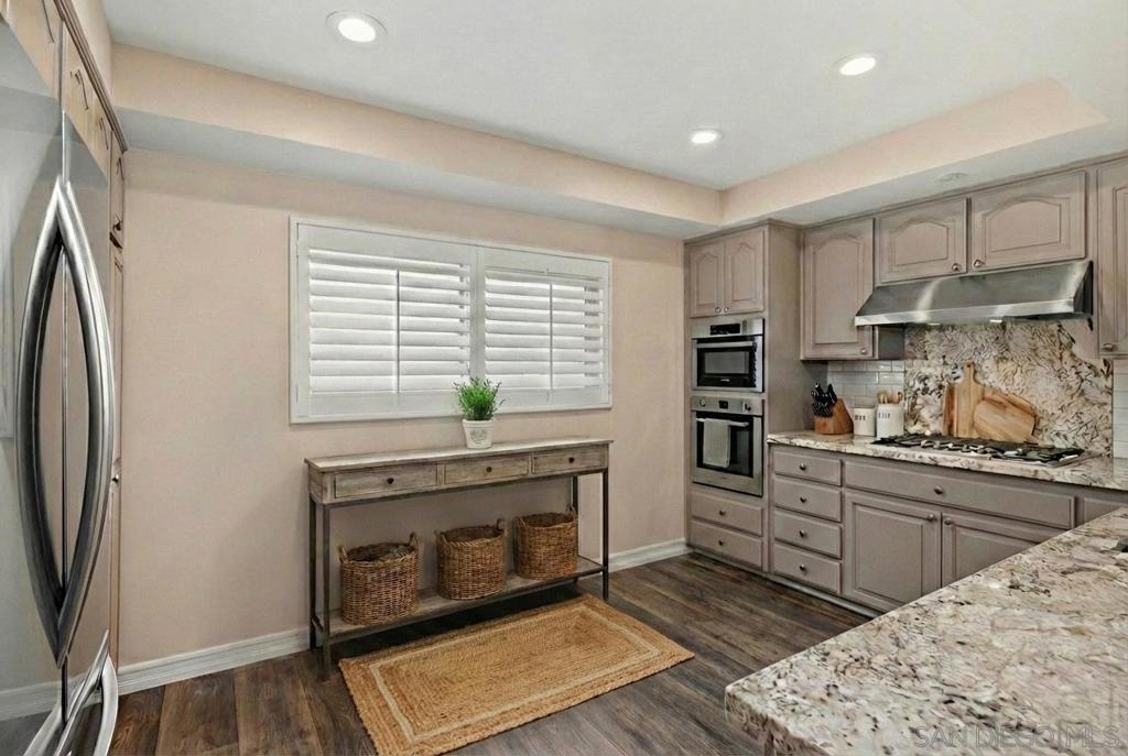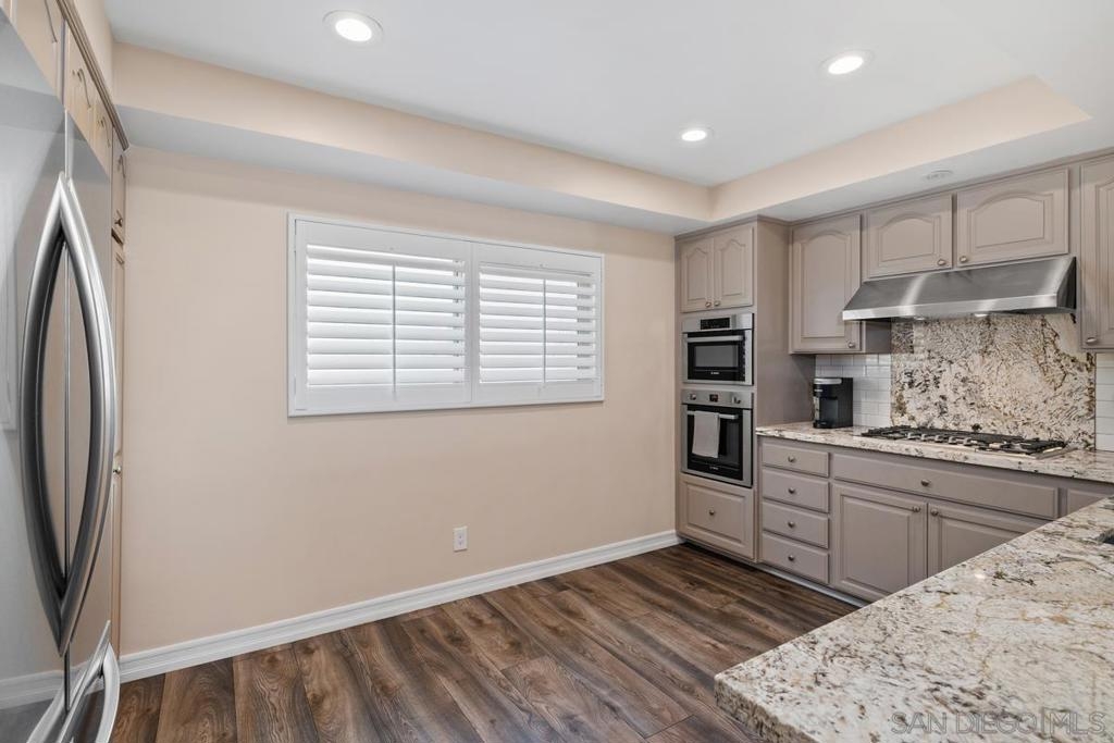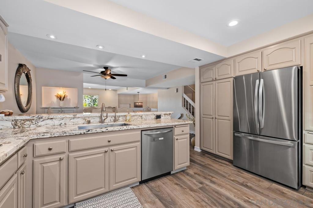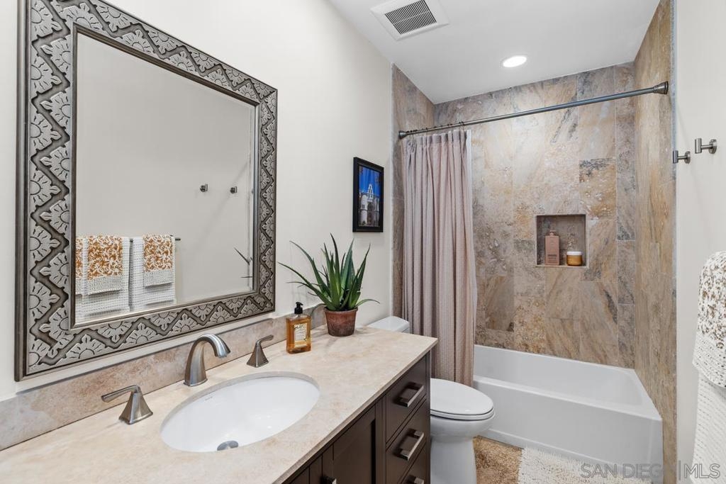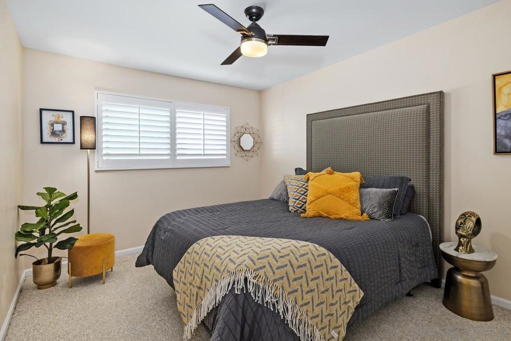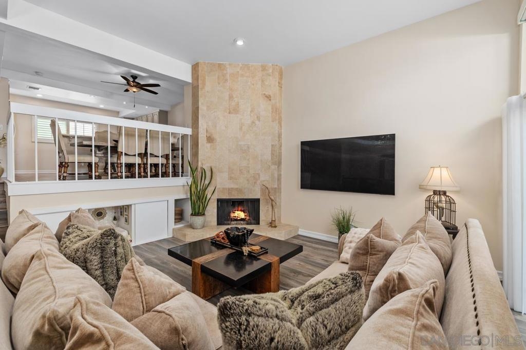 This TURNKEY property checks all the boxes! Don't miss this stunning two story split-level home with open floorpan, high ceilings, spacious living areas, natural light, beautiful views and attached 2 car garage with EV charging outlet. You'll enjoy beautiful flooring and light fixtures, an elegant fireplace, the updated kitchen including SS appliances, and spa-like bathrooms. Primary suite features incredible sunset views with spacious closets and bath. Plenty of storage and closet organizers, soft-close cabinets, remote-controlled blinds in living area, enclosed laundry area, smooth-texture walls and ceilings, recessed lighting, and more! The serene patio is perfect for your morning coffee or evenings enjoying the views. Less than 10 minutes from one of San Diego's most iconic/scenic hiking trails and SDSU. Seller will consider selling furnished. This is a must see!