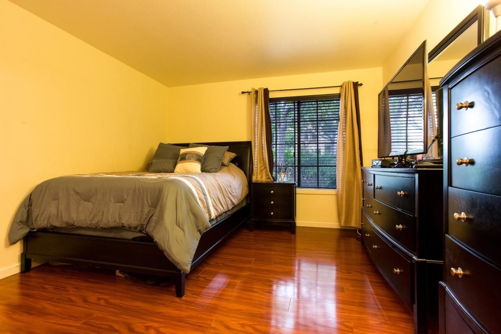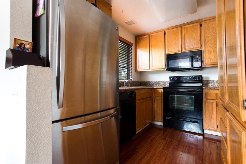 Turn-key condo with impeccable laminate floors, steel fridge, granite counter tops, and custom wood blinds. Double door entry to second bedroom can also be used as an office. Wrap around fireplace from living room to dining room. Enjoy designer touches throughout. This first floor unit offers a huge covered patio and great privacy for entertaining with family and friends. The complex features a very nice pool and spa, basketball court, volleyball court, and Lopez Canyon community park right next door. Neighborhoods: Canyon Park Equipment: Dryer, Range/Oven, Washer Other Fees: 0 Sewer: Sewer Connected