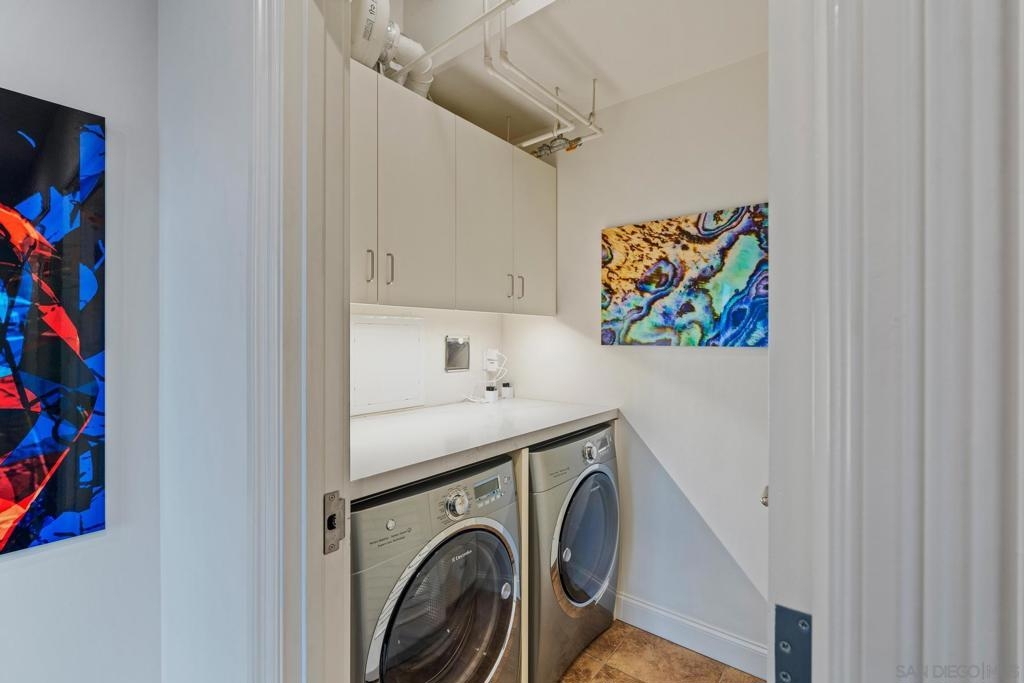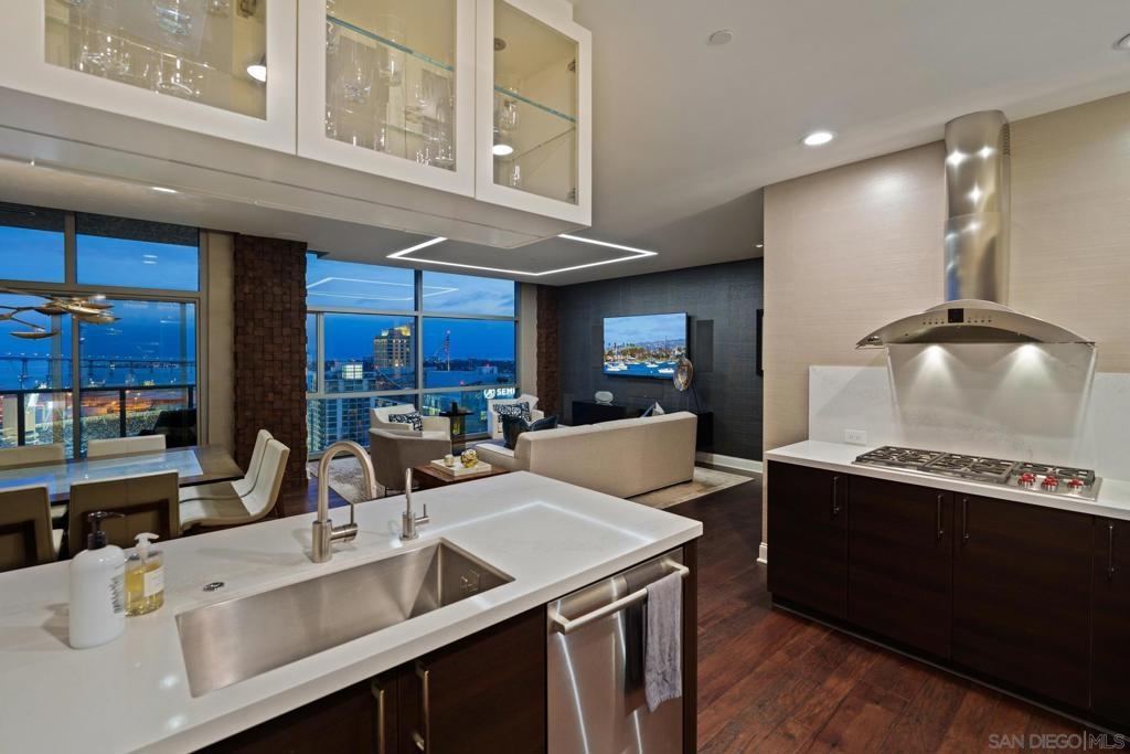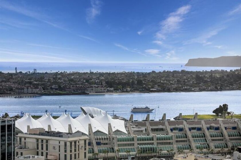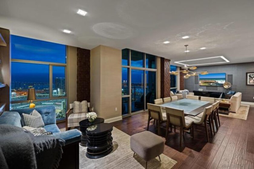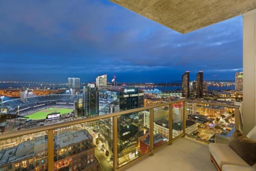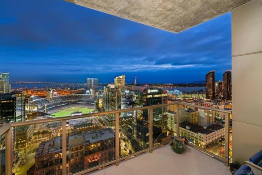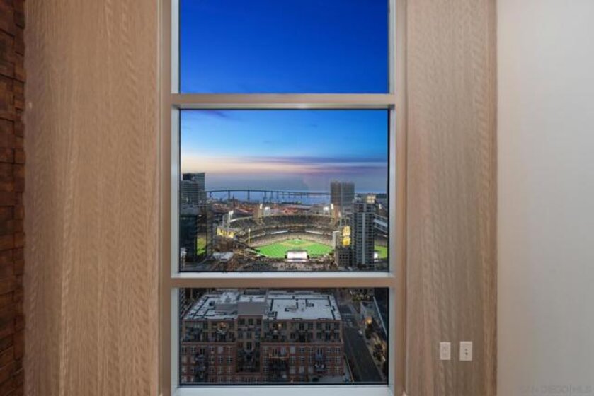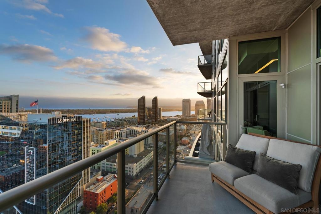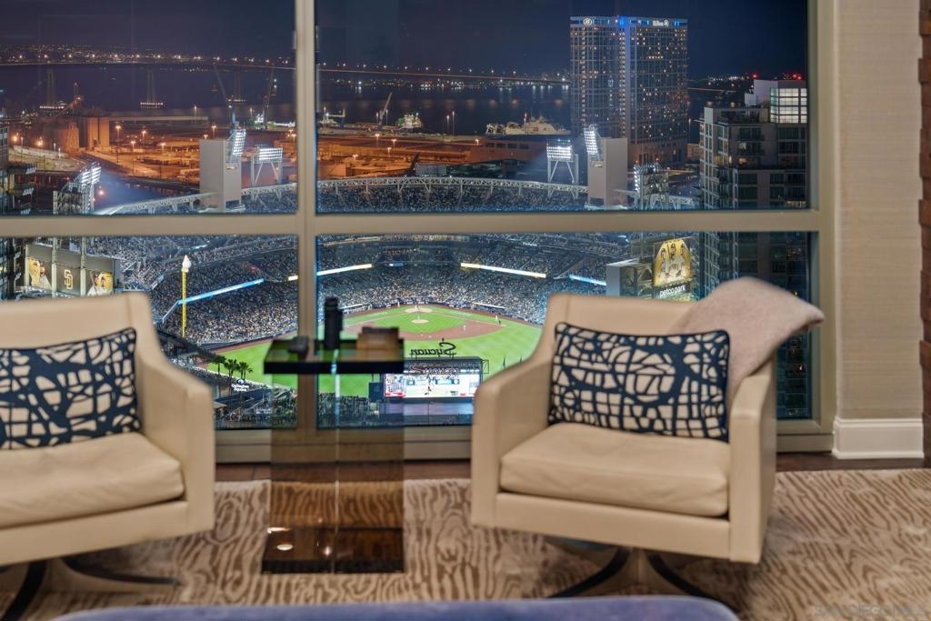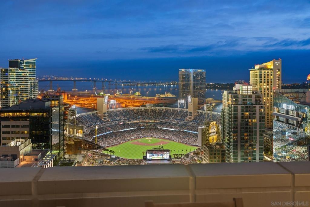Perched on the 28th floor of The Mark, this exceptional semi-penthouse offers expansive city living with approximately 2,430 square feet & three spacious bedrooms, two en-suite. From this elevated vantage point, enjoy unparalleled panoramic views of the downtown skyline, San Diego Bay, the graceful arc of the Coronado Bridge, and the iconic silhouette of Point Loma. At the center of it all is the vibrant energy of Petco Park, home of the San Diego Padres—offering a front-row perspective to games, concerts, and the dynamic atmosphere of East Village.This semi-penthouse sanctuary in the sky features one of the largest outdoor living spaces in the building, highlighted by an expansive 400+ square foot terrace—an urban oasis ideal for entertaining guests or cultivating a lush garden retreat. Two additional private balconies extend the indoor-outdoor lifestyle, located off the dining area and the primary suite. Inside, ten-foot ceilings enhance the sense of scale and sophistication, while floor-to-ceiling glass windows flood the residence with natural light and showcase the remarkable views from nearly every room. The thoughtfully designed floor plan includes: • 2 ensuite bedrooms for privacy and comfort • Generous closet space throughout • A walk-in pantry • An elegant wine bar perfect for entertaining • Designer lighting fixtures that add warmth and sophistication From catching a Padres game from above, to enjoying concerts and city lights, or simply savoring the beauty of the bay, this 28th-floor semi-penthouse at The Mark offers a truly elevated San Diego lifestyle.