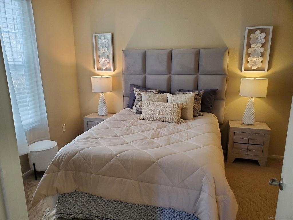 Move-in ready. Quiet peaceful location. 2 garage parking spaces. Technically a ground floor unit, but because it's located at the edge of the community, your balcony is private and secure like a 2nd floor balcony. Close to all the restaurants and shops that make Mira Mesa so vibrant, but without all the noise. Granite counters in the kitchen and bathroom. Laminate floor in the main living area, carpet in the bedroom, and travertine in the bathroom. This gated community has a pool, a weight room, and a sauna. Mirabella is a wonderful gated community with a pool, a weight room, and secure gated underground garage parking. Close to all the restaurants and shops that make Mira Mesa so vibrant, but super quiet and peaceful, this is the condo you've been looking for. This ground floor unit comes with two dedicated parking spaces in the garage below. Both spaces are very close to the unit. Because this is an end unit on the perimeter of the community, there's nobody walking past your unit, and when you stand at the railing of your private patio, you're basically on the second floor, not standing at the same level as the people walking past. In fact there is nobody walking past. Your view looks out beyond the complex so you get lots of fresh air and natural light. And because of the prime location, there is no noise from Mira Mesa Blvd. In addition to all the kitchen appliances, the unit also comes with a full size side-by-side washer and dryer located in a large storage /laundry closet on your private covered patio. Both the kitchen and bathroom counters are made of granite. There is Laminate floor in the large open main living area, carpet in the large bedroom, and beautiful travertine tile in the bathroom. There's also a gas fireplace in the living room.