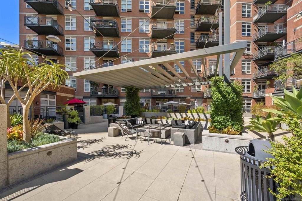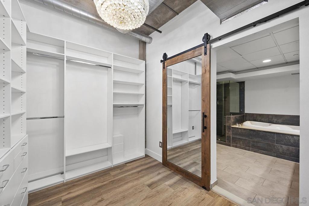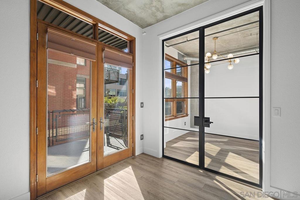 Step into this stunning, fully reimagined 1 bedroom + den Parkloft residence where urban sophistication meets modern comfort. This New York–style loft showcases soaring 10-foot ceilings, newly added walls, and over $25K in custom Rustica glass and metal doors that define the space with style and function. The versatile den offers options for a guest room, home office, or creative retreat, while the open-concept living area perfectly balances industrial charm with modern warmth. The chef-inspired kitchen boasts dramatic quartz waterfall counters, full backsplash, high-end Samsung and Subzero appliances, and designer lighting that enhances every gathering. The spa-like primary bath features large-format tile, vivid lighting, dual vanities, a jetted soaking tub, and a walk-in frameless glass shower. French doors off the great room open to a private balcony—complete with a natural gas hookup—ideal for entertaining or simply relaxing in the heart of East Village’s vibrant Ballpark District. One SUV-sized parking space and private storage room also included. Attention to detail continues throughout this residence, from the built-out primary closet with mirrored barn door to the thoughtfully redesigned guest bath with custom vertical tile and curated fixtures. Additional upgrades include newer front-load laundry, custom built-ins for storage, hard-surface flooring throughout, and designer lighting in every room. Smart-home features such as a Nest thermostat and LED accent lighting provide added convenience and energy efficiency. Parkloft offers an exceptional urban lifestyle with an attended Zen-inspired lobby, state-of-the-art fitness center, beautifully landscaped courtyard, and resident lounge with kitchenette—perfect for entertaining. Just steps from Petco Park, the Gaslamp Quarter, and the Marina District, this move-in-ready home blends privacy and sophistication with the best of Downtown San Diego living.