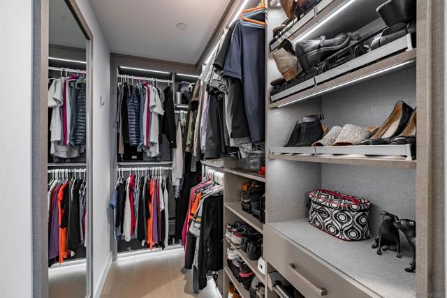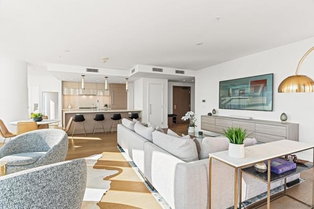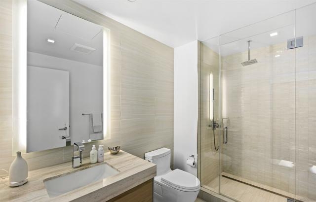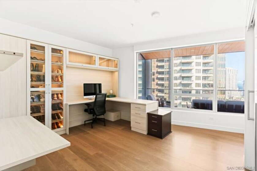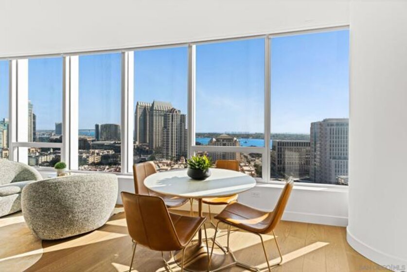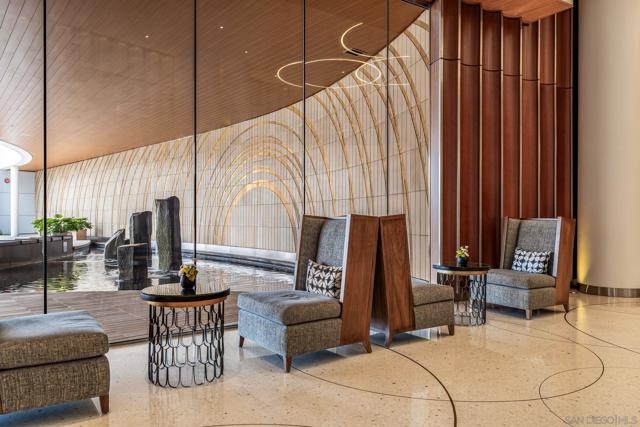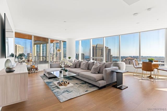 Experience resort-style living high above the San Diego waterfront in this stunning two-bedroom, two-bath residence at Pacific Gate, downtown’s most iconic luxury high-rise. Framed by walls of glass, this highly sought-after southwest corner floor plan captures panoramic views of the Pacific Ocean, San Diego Bay, Coronado Bridge, and the city skyline. Thoughtfully designed and upgraded, this home features custom built-ins throughout including a sleek living room media center, a bespoke walk-in closet and vanity in the primary suite, and a versatile office station with a pull-out Murphy bed in the guest room. The open-concept kitchen showcases top-of-the-line Wolf, Miele, and Sub-Zero appliances, complemented by rich finishes and designer details. Step onto your expansive private terrace and take in the breathtaking coastal vistas, perfect for morning coffee or evening sunsets. The split-bedroom layout provides optimal privacy and functionality, ideal for hosting guests or working from home. As a resident of Pacific Gate, you’ll enjoy an unparalleled collection of amenities including a private luxury boat share, car fleet, concierge, guest suite, pool terrace with cabanas, state-of-the-art fitness center, residents lounge, screening room, and on-site restaurant. Live moments from the waterfront, Seaport Village, and the city’s finest dining and entertainment. The first all-glass Super Prime residential tower in San Diego offers an unprecedented waterfront lifestyle with sky-high amenities and picture-postcard views. Directly overlooking the waterfront, the 41-story tower contains an exclusive offering of homes designed by Hirsch Bedner Associates. Renowned New York-based architectural firm Kohn Pedersen Fox (KPF) created a landmark that reimaged the San Diego skyline. The custom-engineered glass walls dynamically reflect the hues of the sky and the Pacific Ocean. Pacific Gate has evolved the San Diego skyline and represents the future of the city. The building is comprised of two-nested curved glass towers that rise as a single column from a three-story ground floor retail podium on the north and west sides of the tower. Because of the building’s curves and exterior glass, Pacific Gate offers a striking viewing experience from every vantage point. Residents arrive home to a beautifully landscaped motor court with a private luxury car fleet, which leads to a double-height lobby with a 24-hour concierge and porter services. Two levels of amenities boast a residents lounge ideal for events and everyday use, the fitness center contains an extensive range of state-of-the-art equipment. Adjacent to the fitness center is the steam and sauna retreats that open up to the fourth-floor pool terrace fitted with poolside cabanas and glass surround.